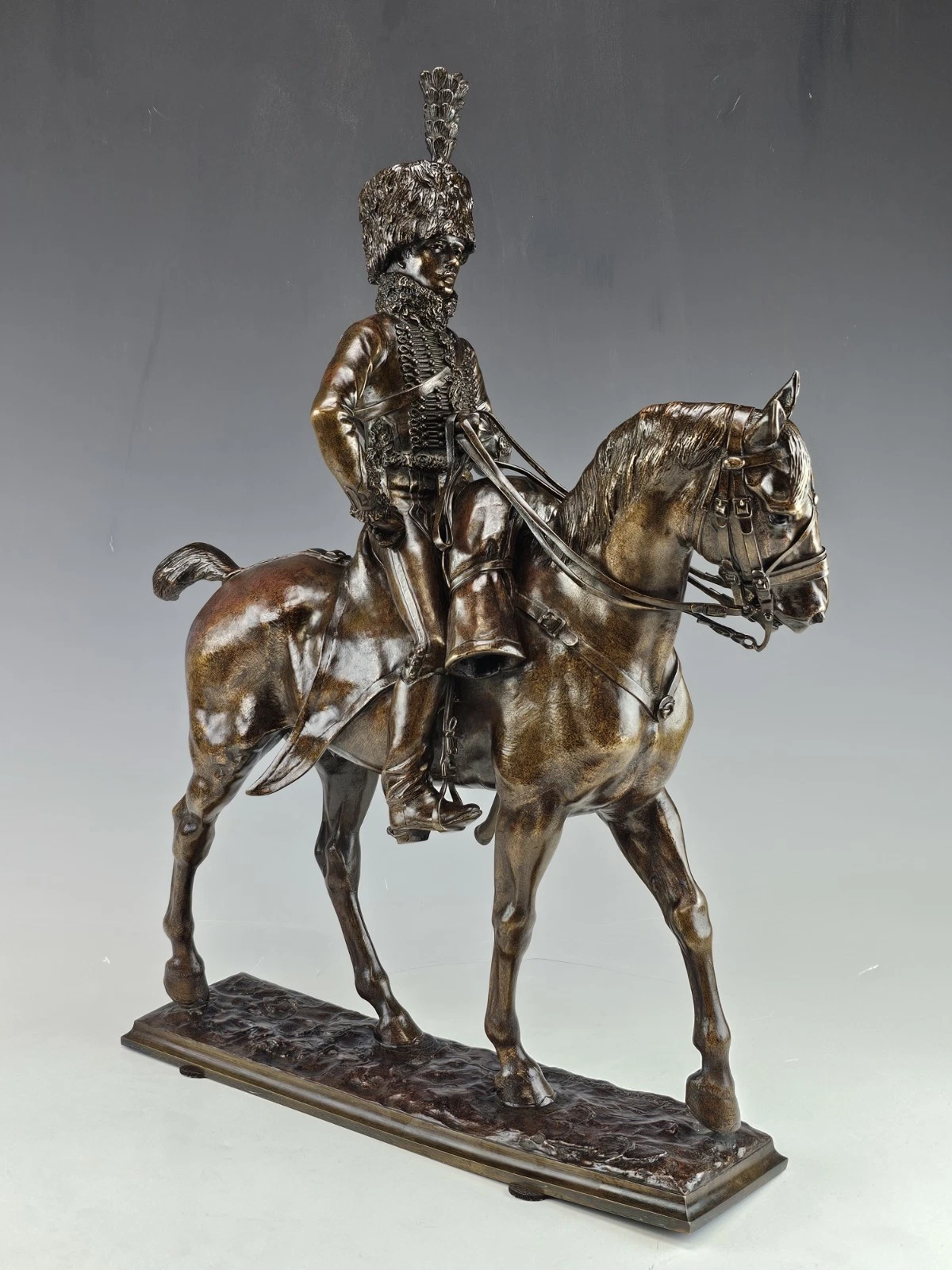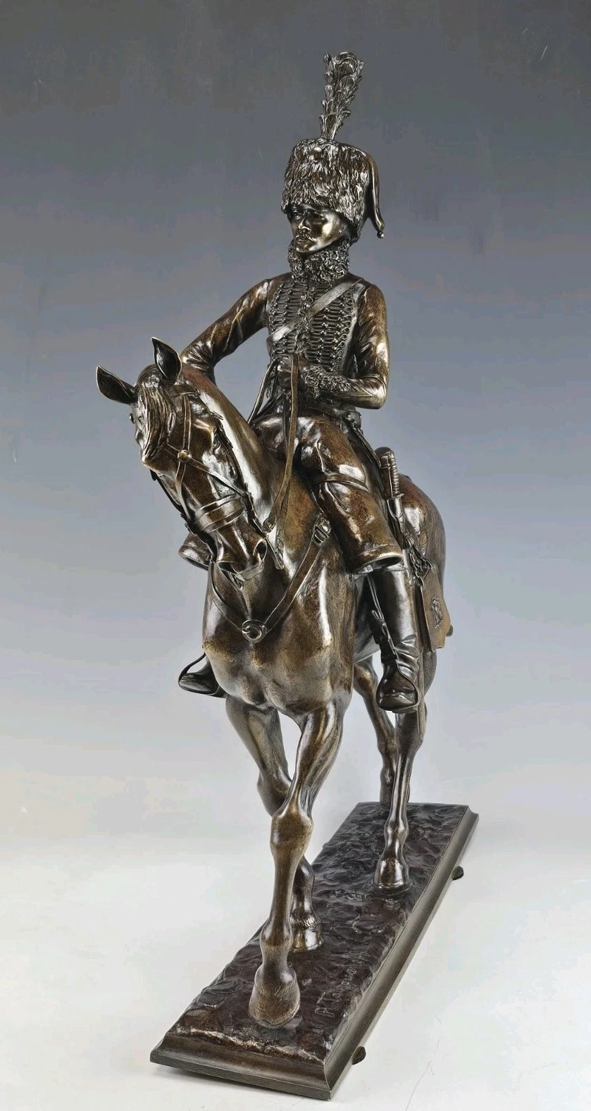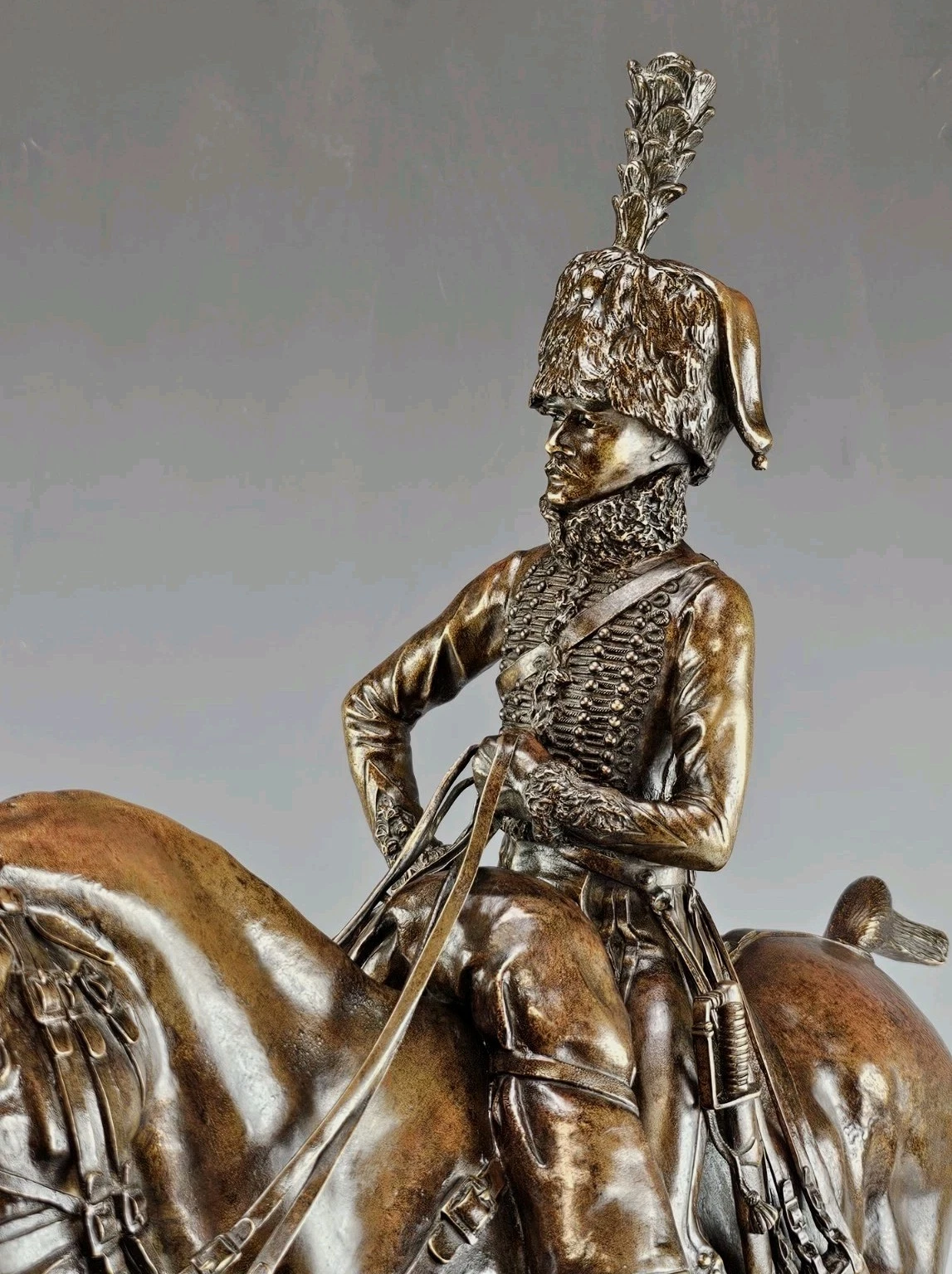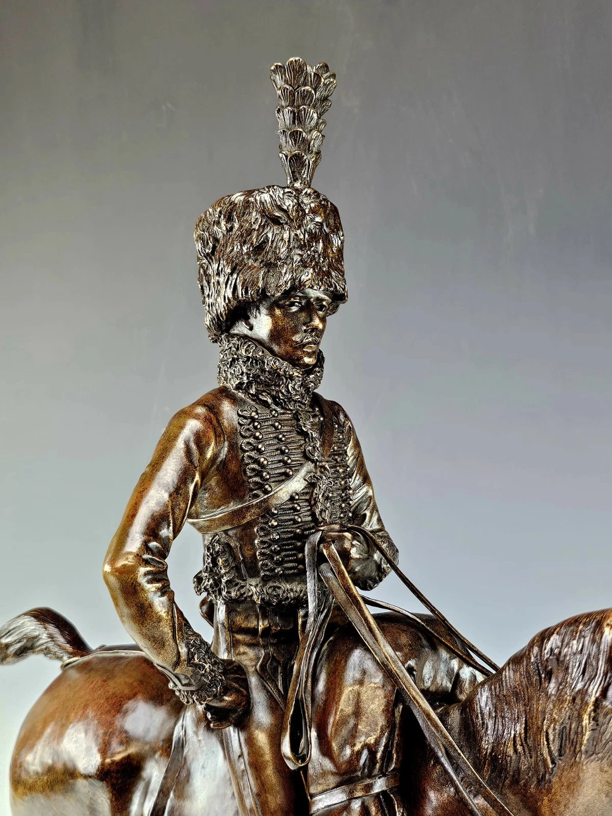 19th-century Patinated Bronze Sculpture of Hussar on Horseback by famous artist Pierre Nicolas Tourgueneff ( 1853-1912 ).