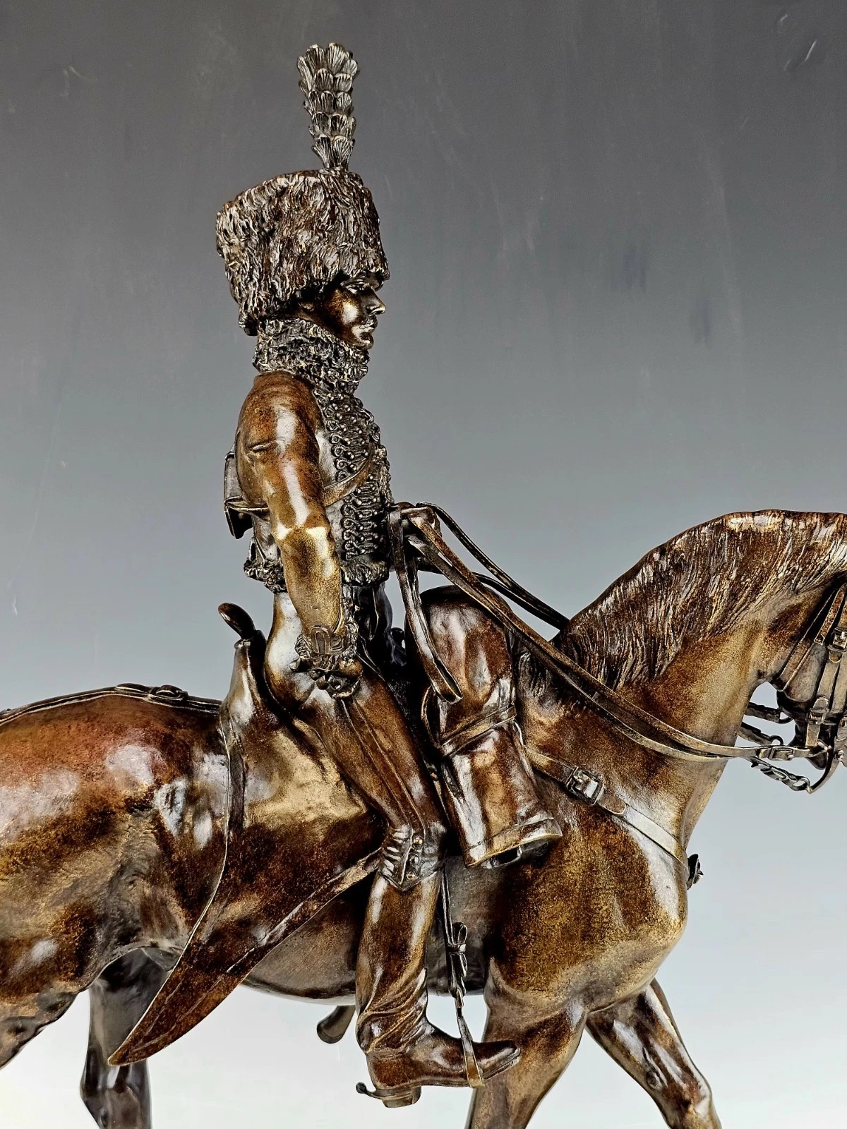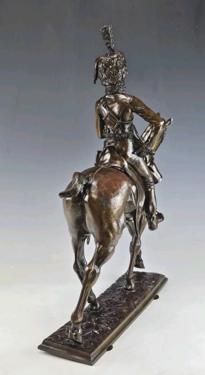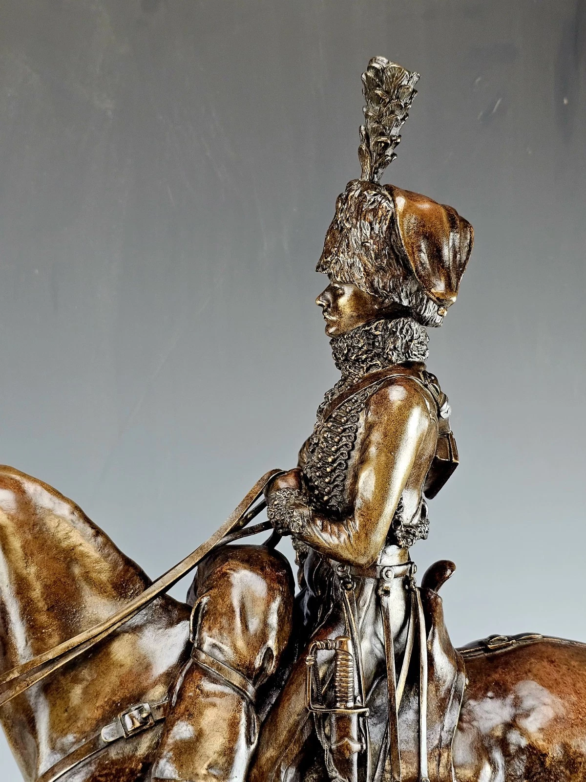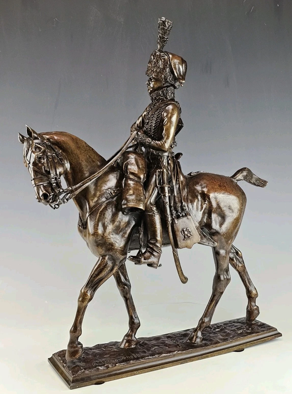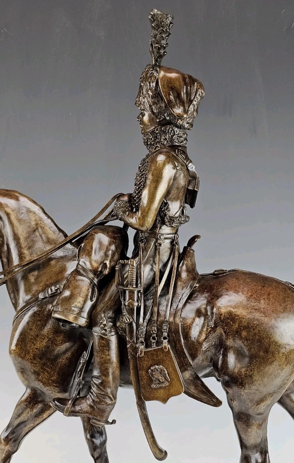 19th-century Patinated Bronze Sculpture of Hussar on Horseback by famous artist Pierre Nicolas Tourgueneff ( 1853-1912 ).