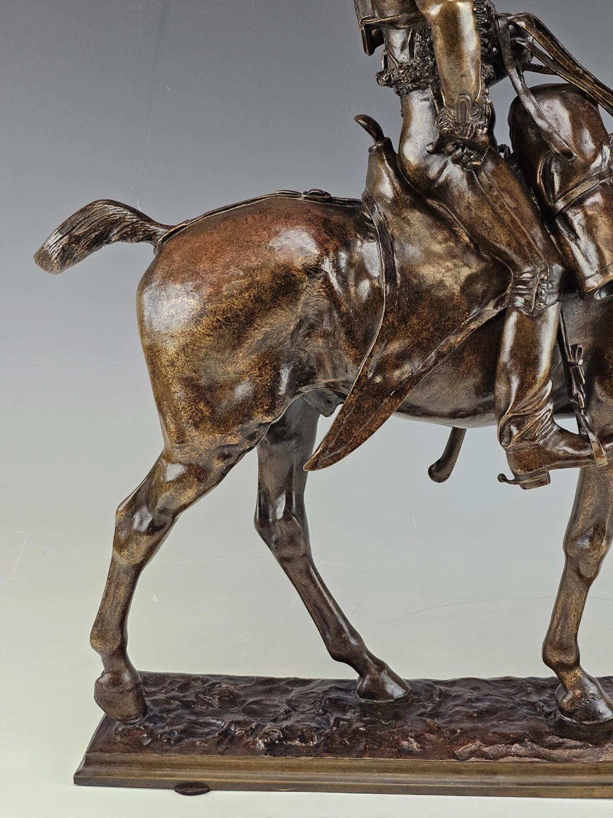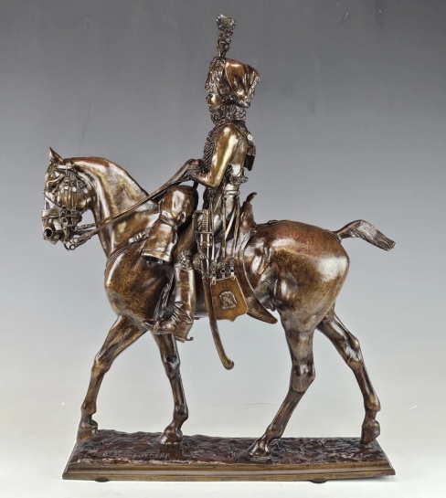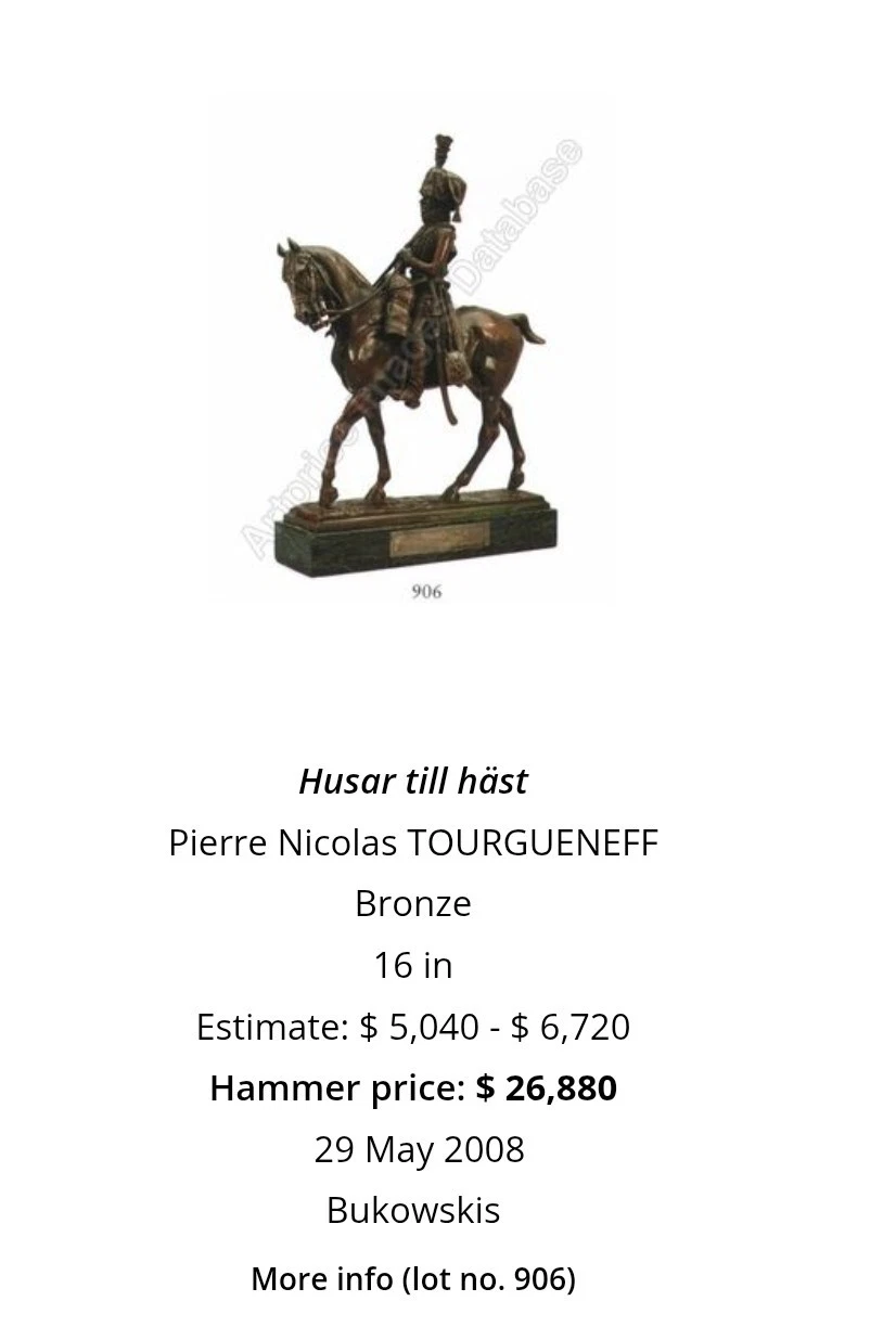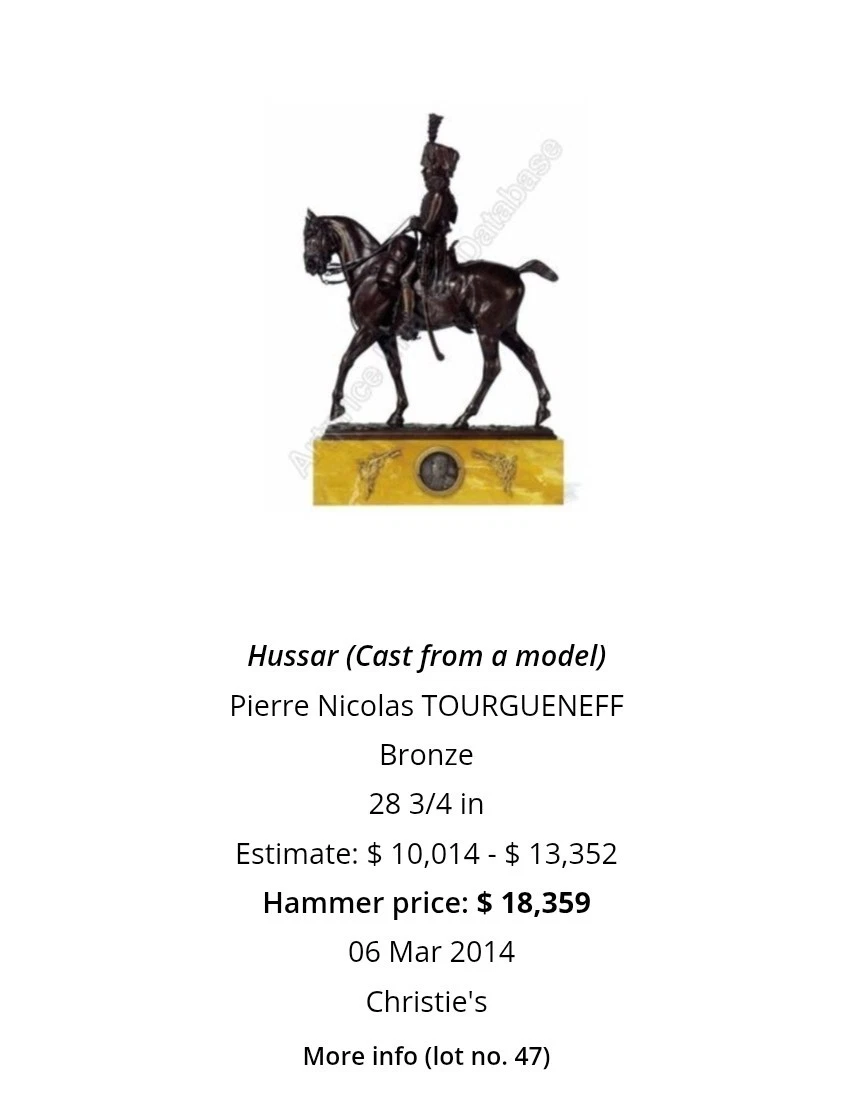 Depicting a Hussar in military uniform, on horseback, on rectangular naturalistic base. Signed on base N.Tourgueneff and stamped with F.Barbedienne foundry mark.