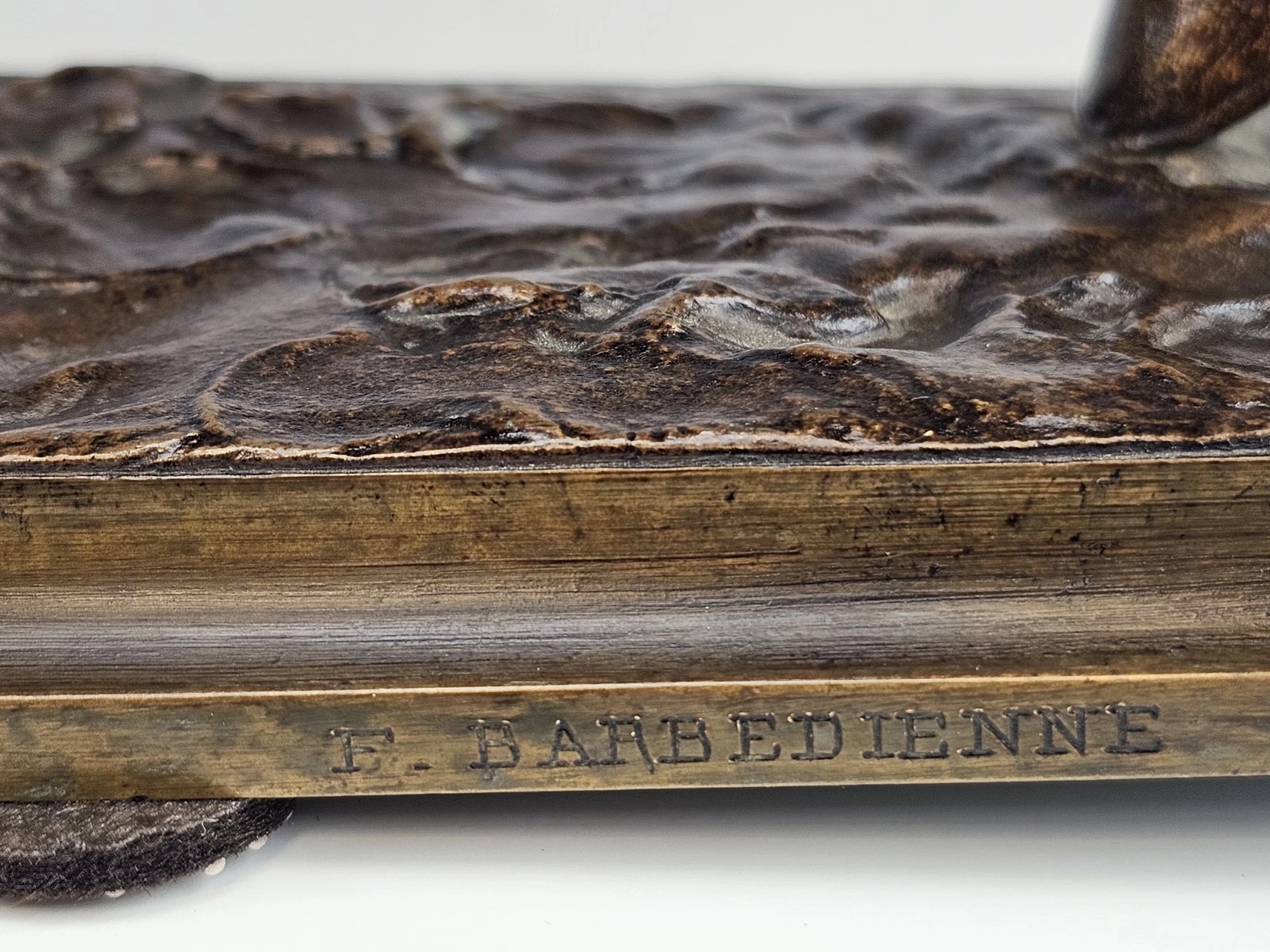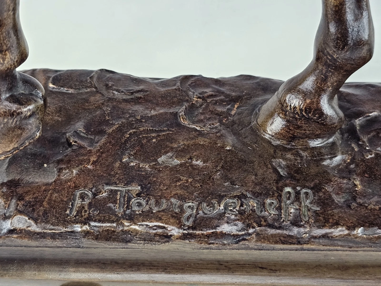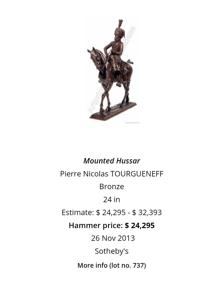 Depicting a Hussar in military uniform, on horseback, on rectangular naturalistic base. Signed on base N.Tourgueneff and stamped with F.Barbedienne foundry mark.