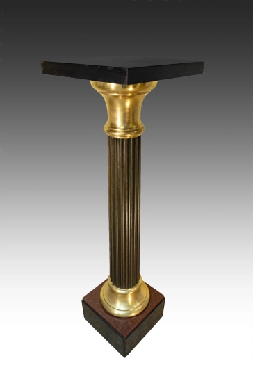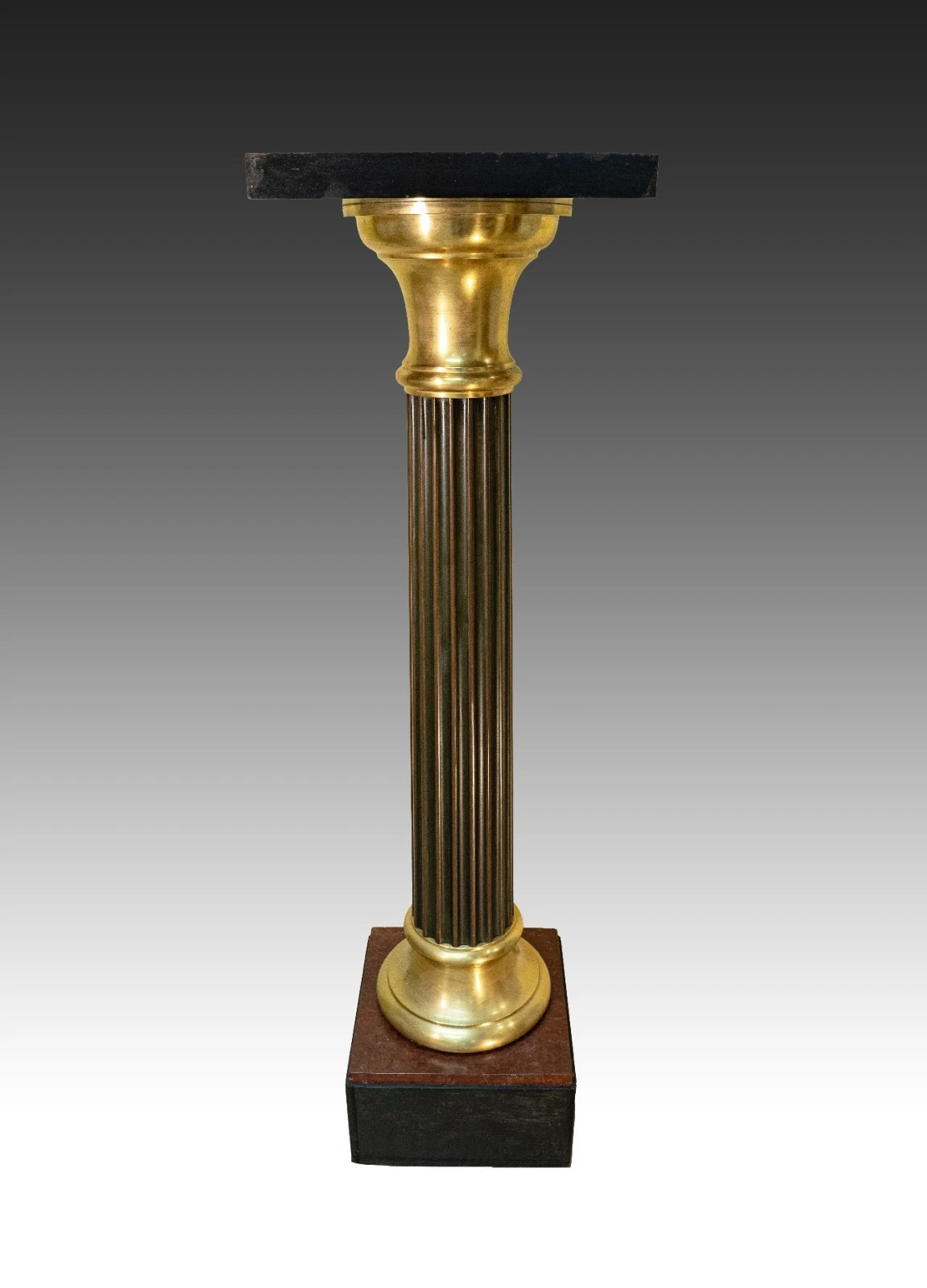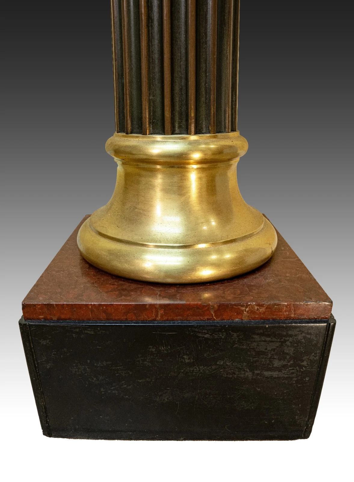 The pedestal is made of patinated and gilt bronze leg with black marble top and black and red marble base.