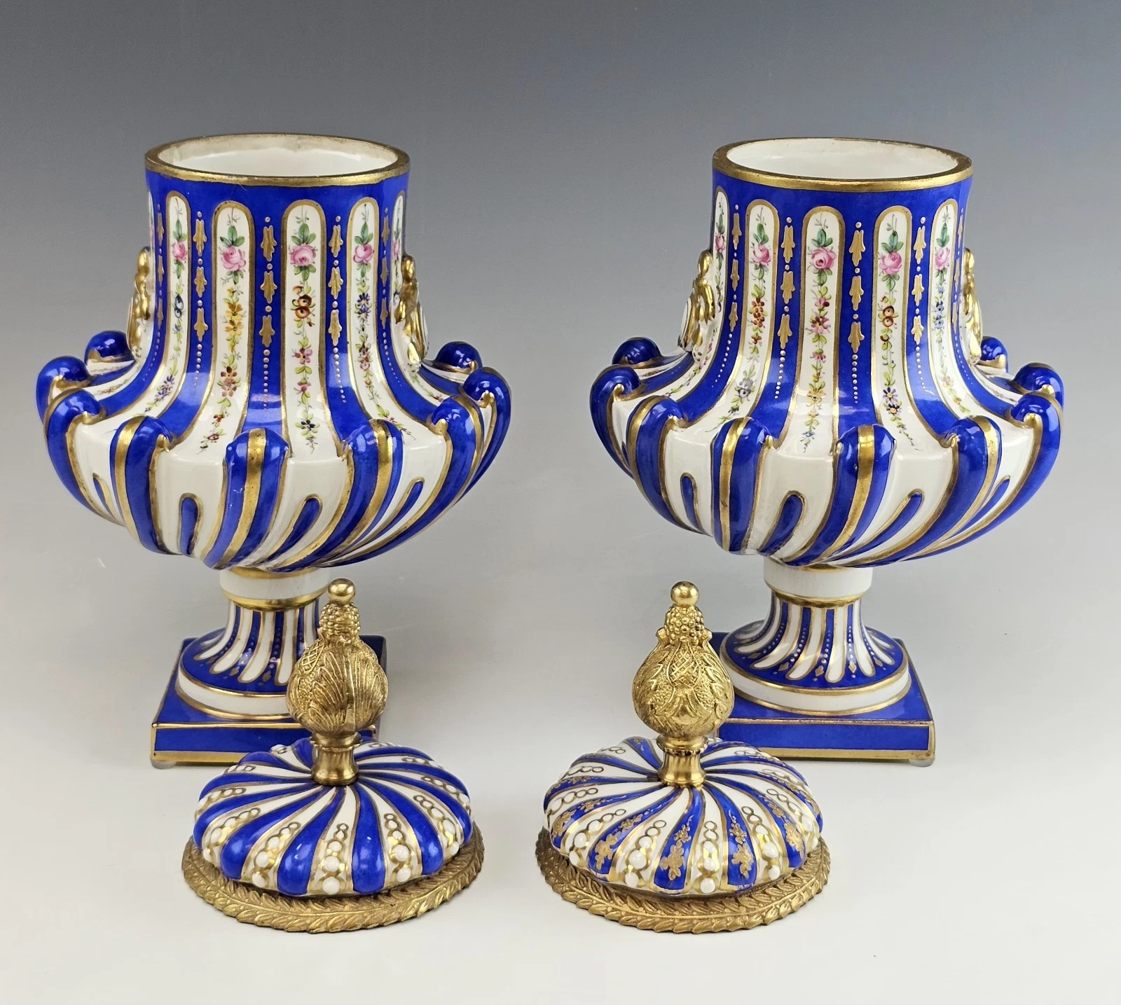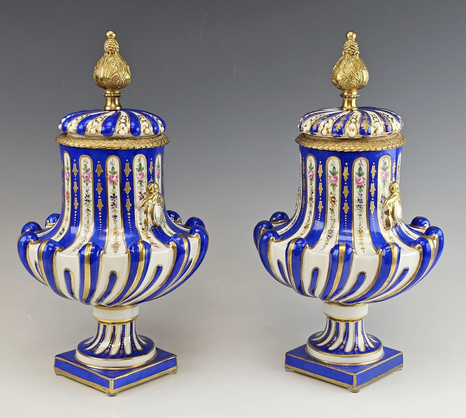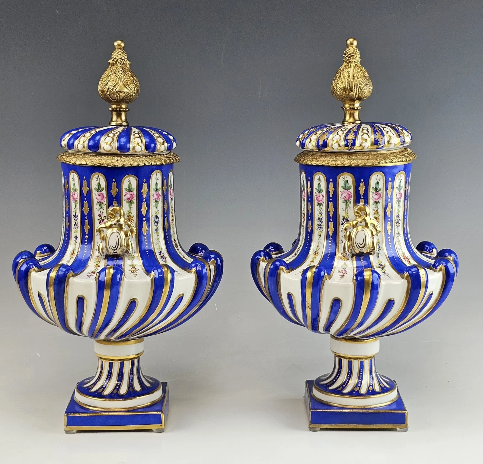The pair with removable lids. Each with large gilt bronze finial. Hand painted with raised gold and floral decoration.