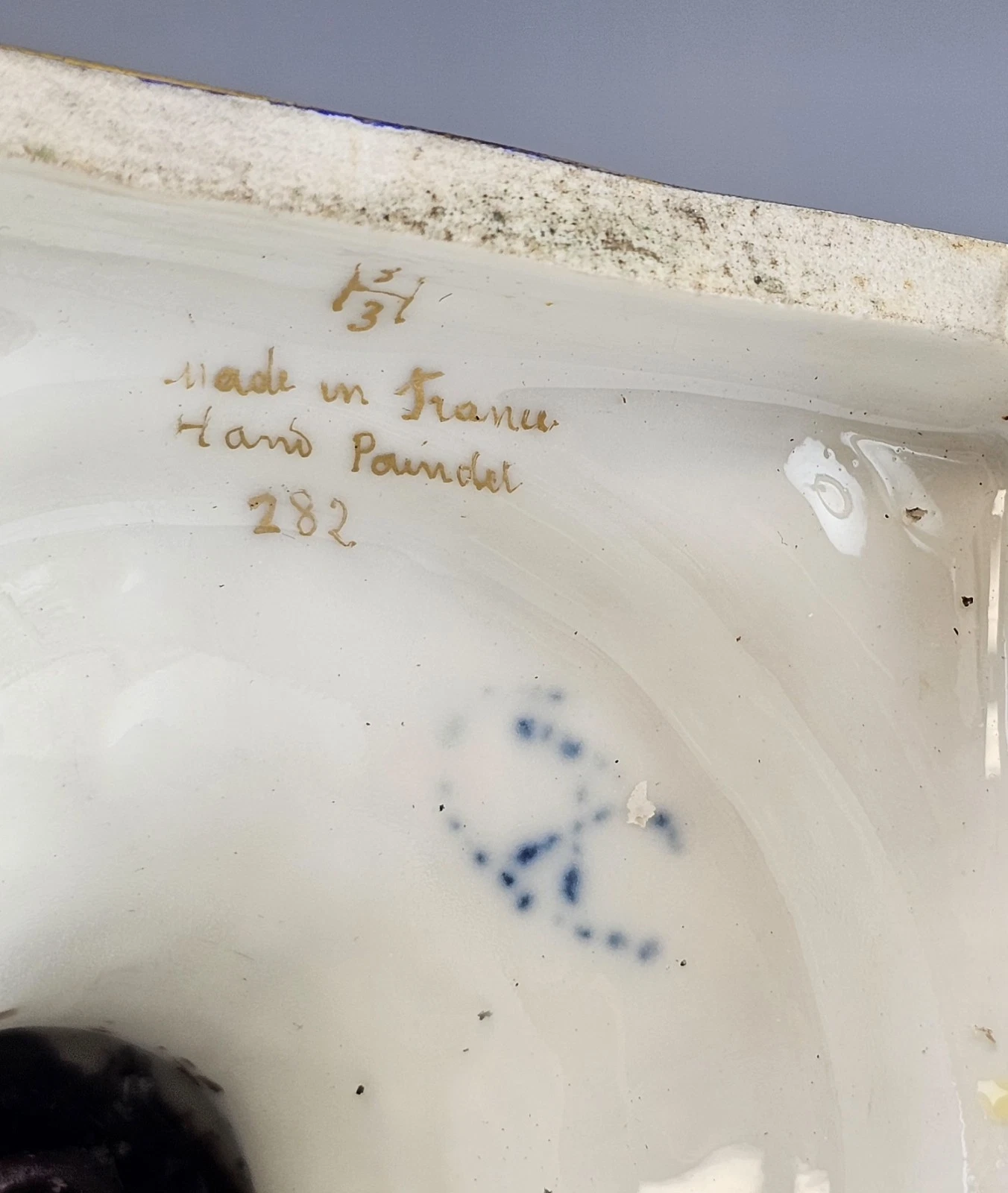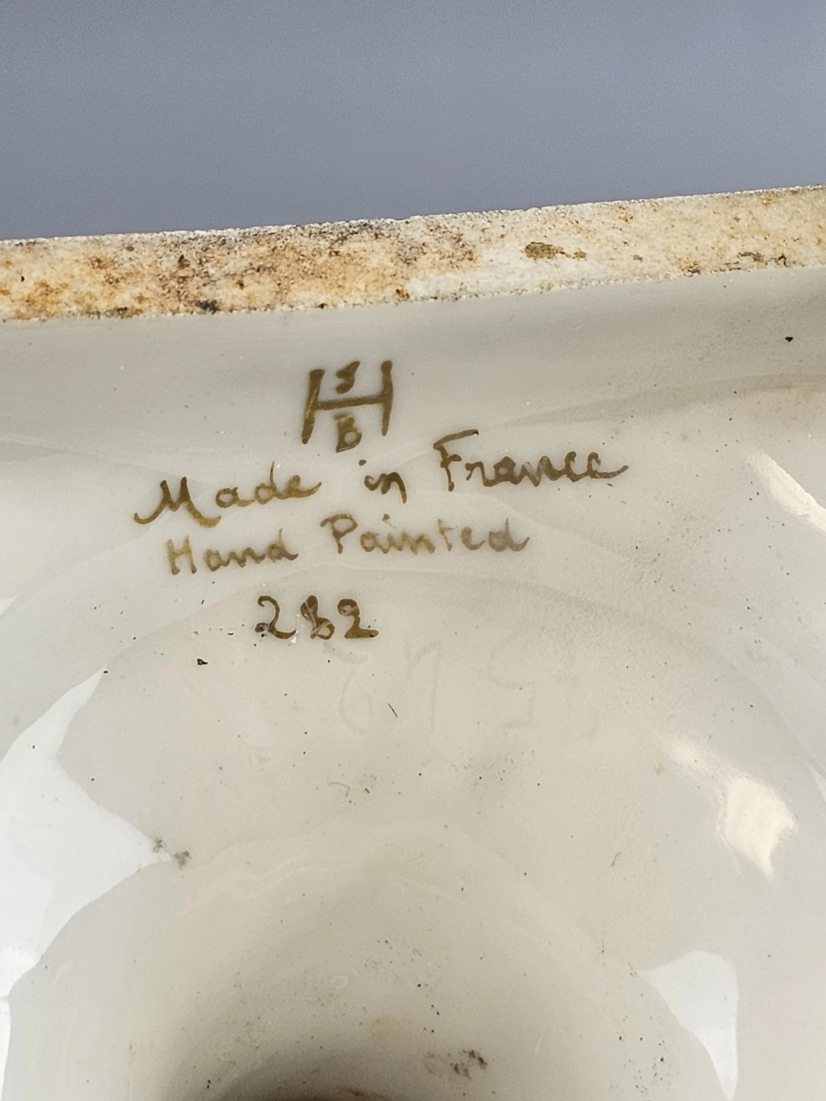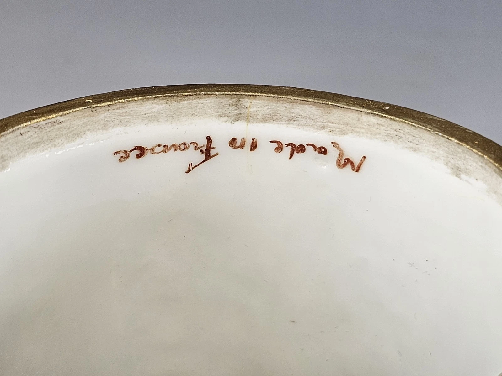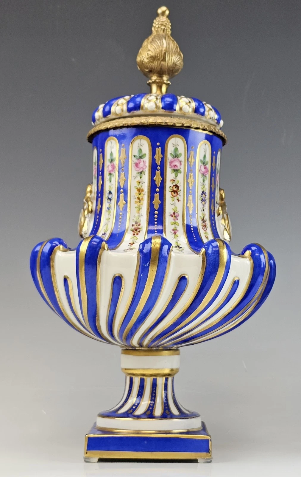 The pair with removable lids. Each with large gilt bronze finial. Hand painted with raised gold and floral decoration.