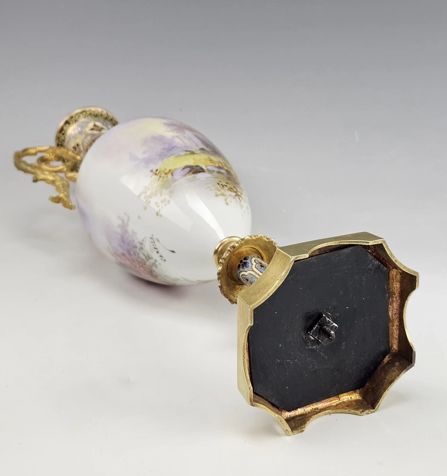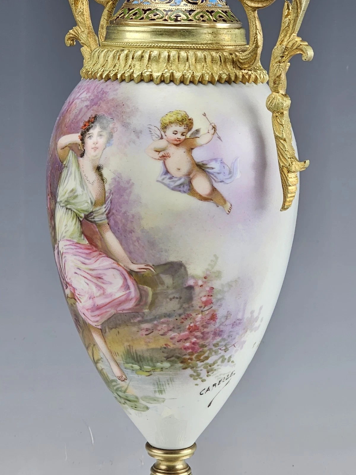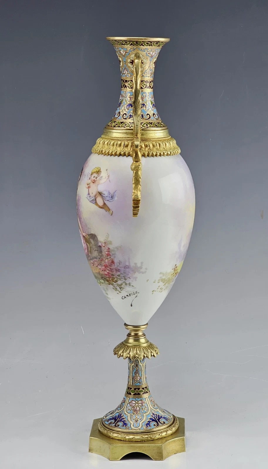 Signed by artist Carelle. Ornate leafy style curved gilt bronze handles. The neck and the base bronze decorated with very fine ornamental champleve enamel.