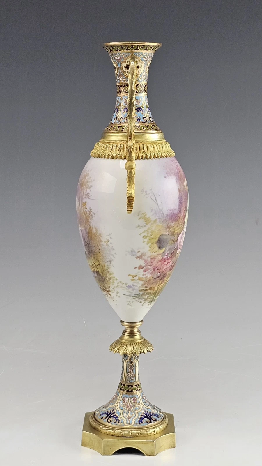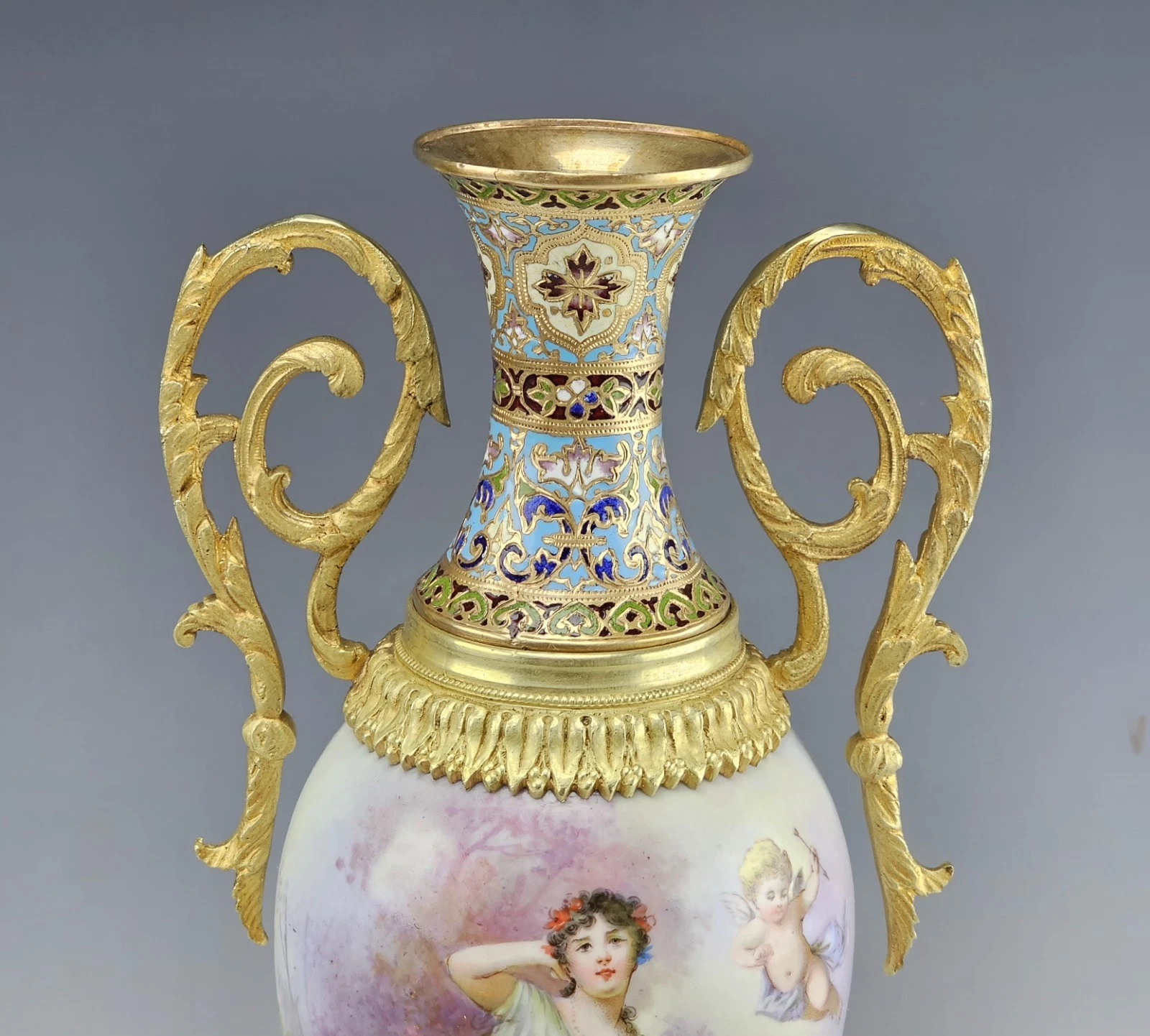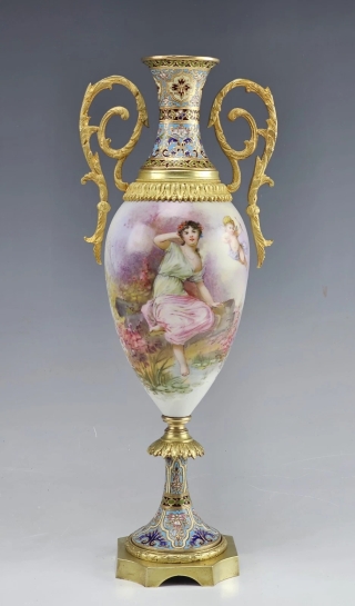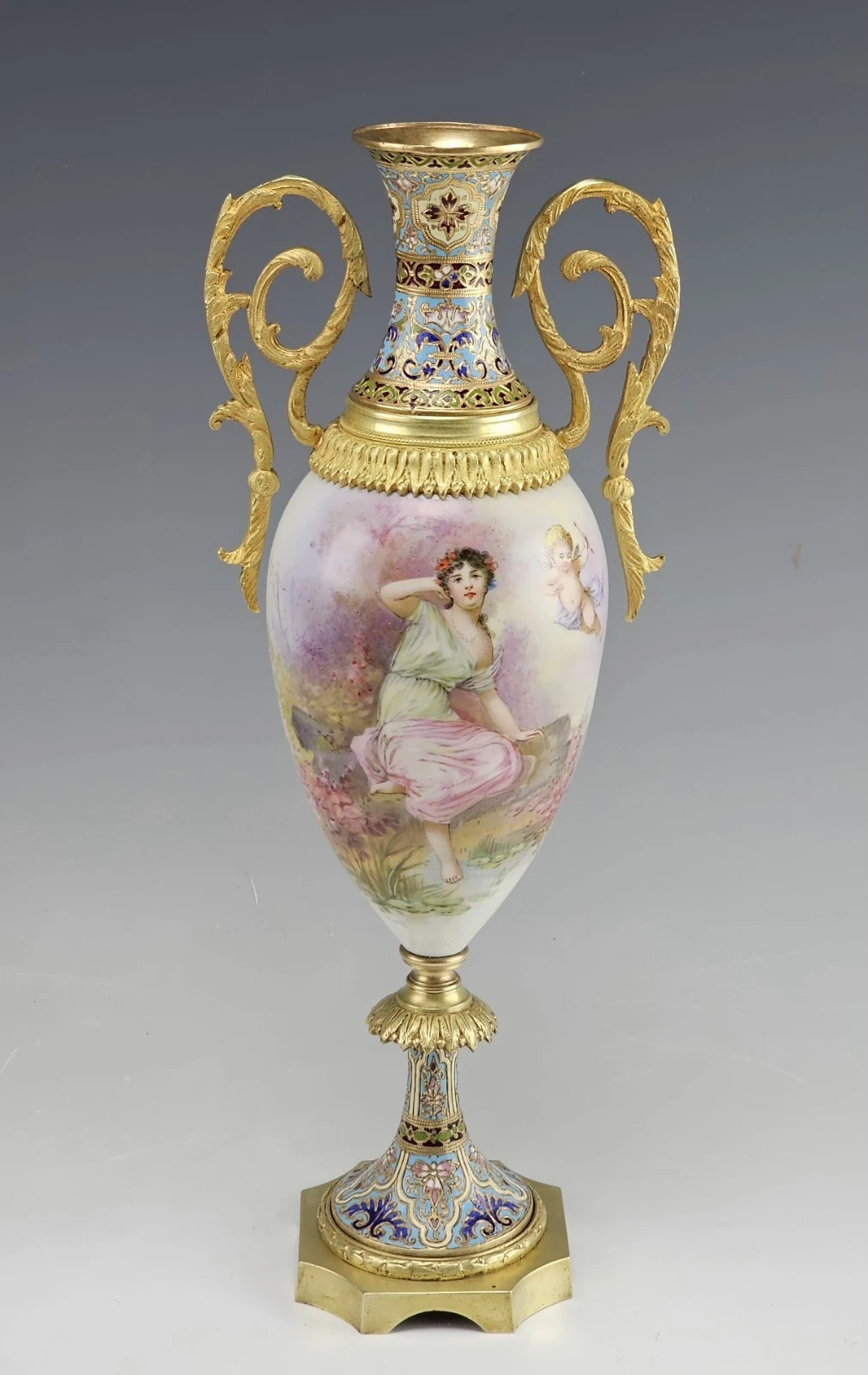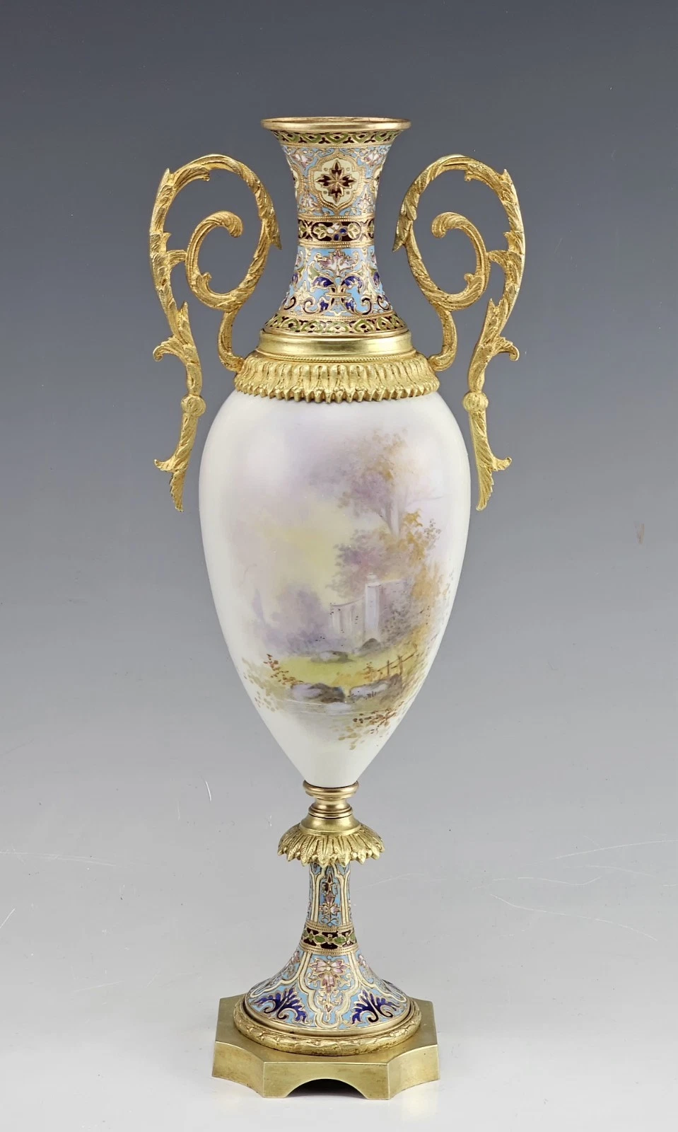 Fine 19C French Sevres Porcelain Gilt Bronze with Champleve Enamel Mounts Twin Handle Vase.