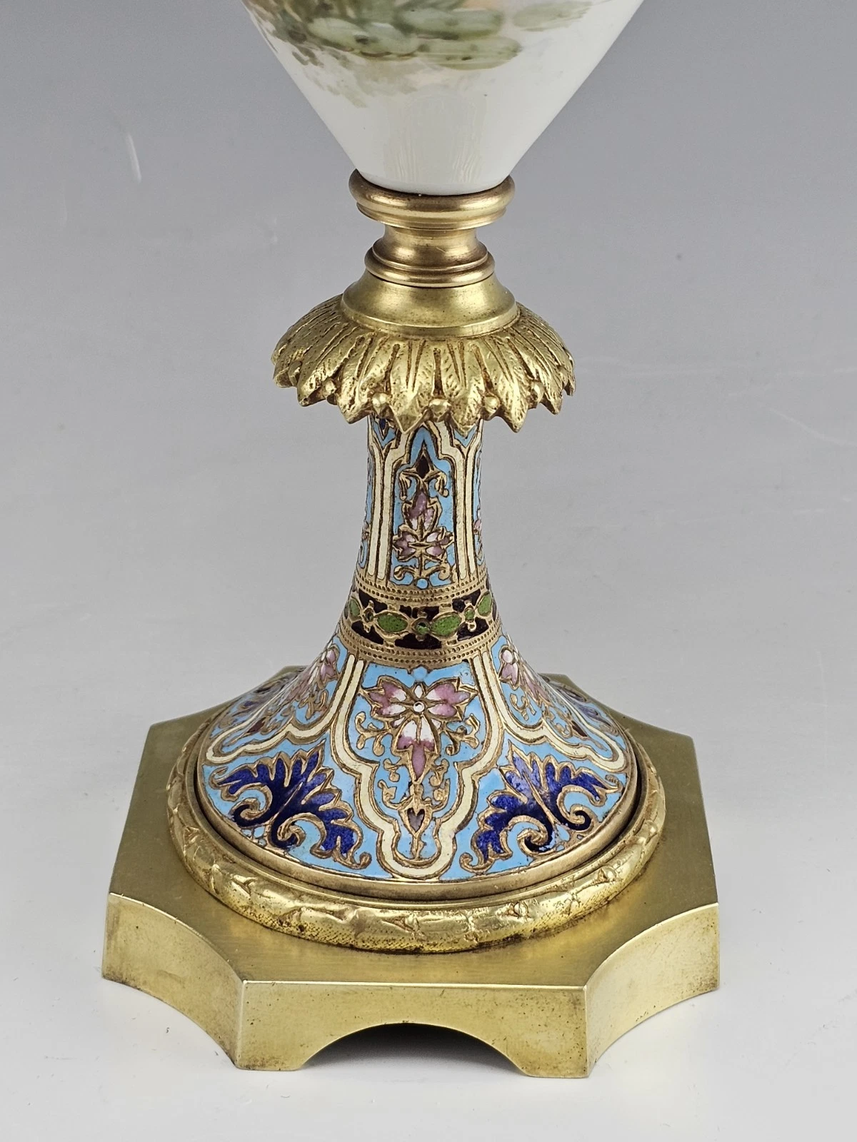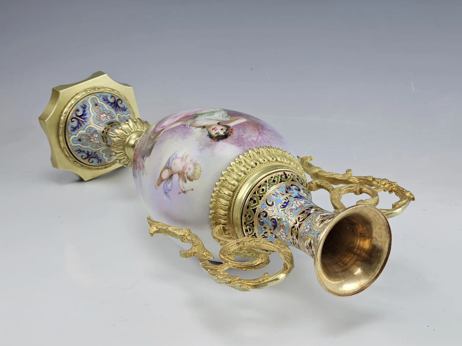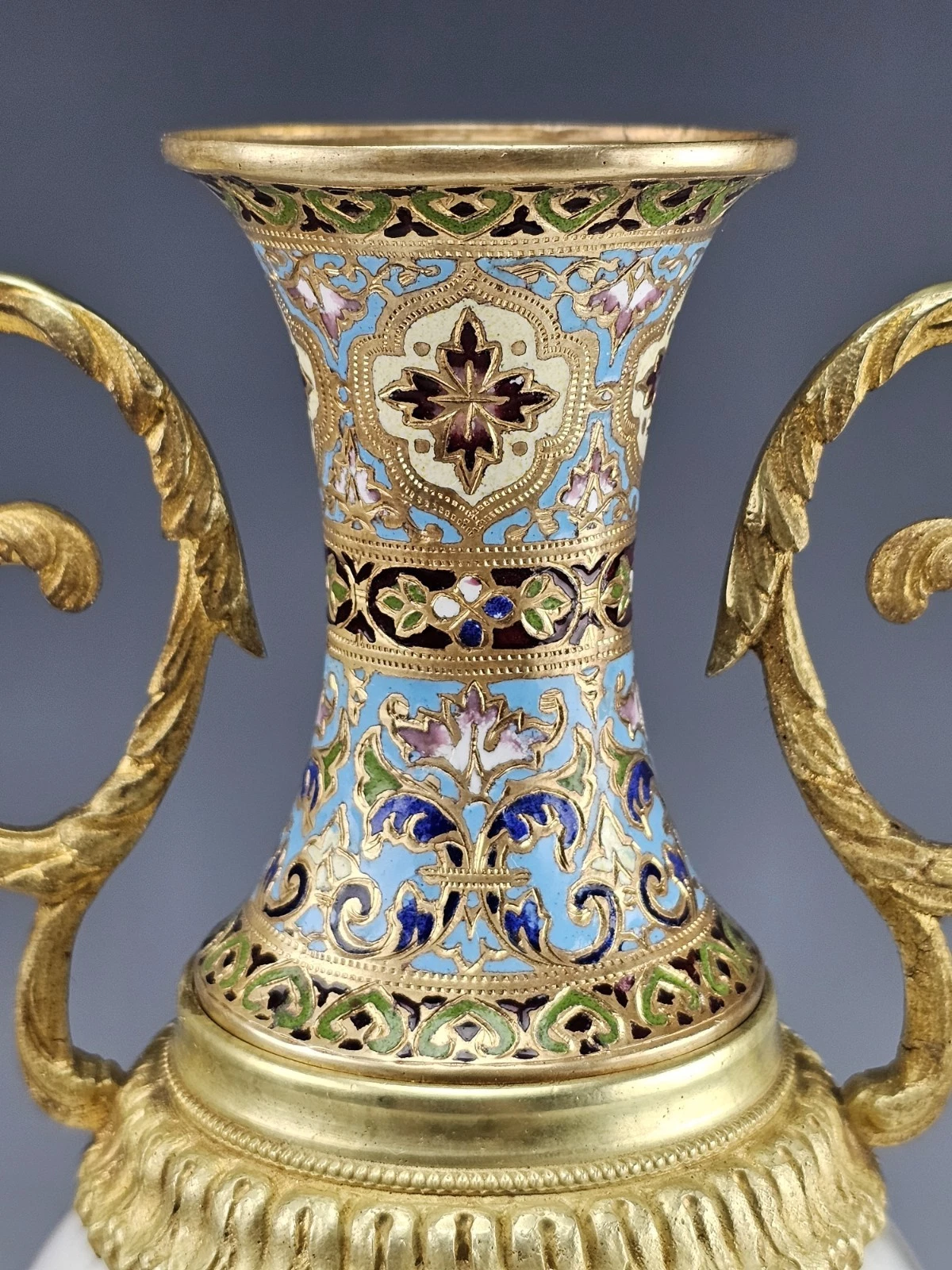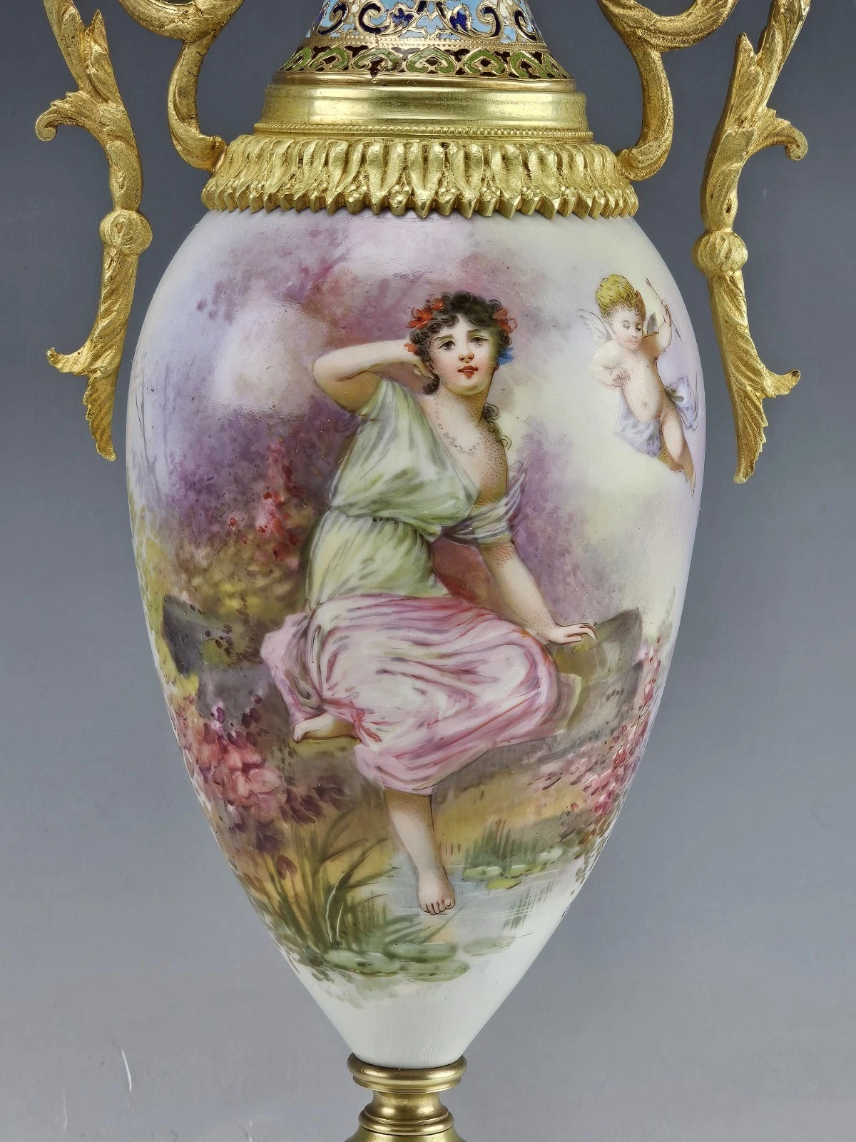 Fine 19C French Sevres Porcelain Gilt Bronze with Champleve Enamel Mounts Twin Handle Vase.