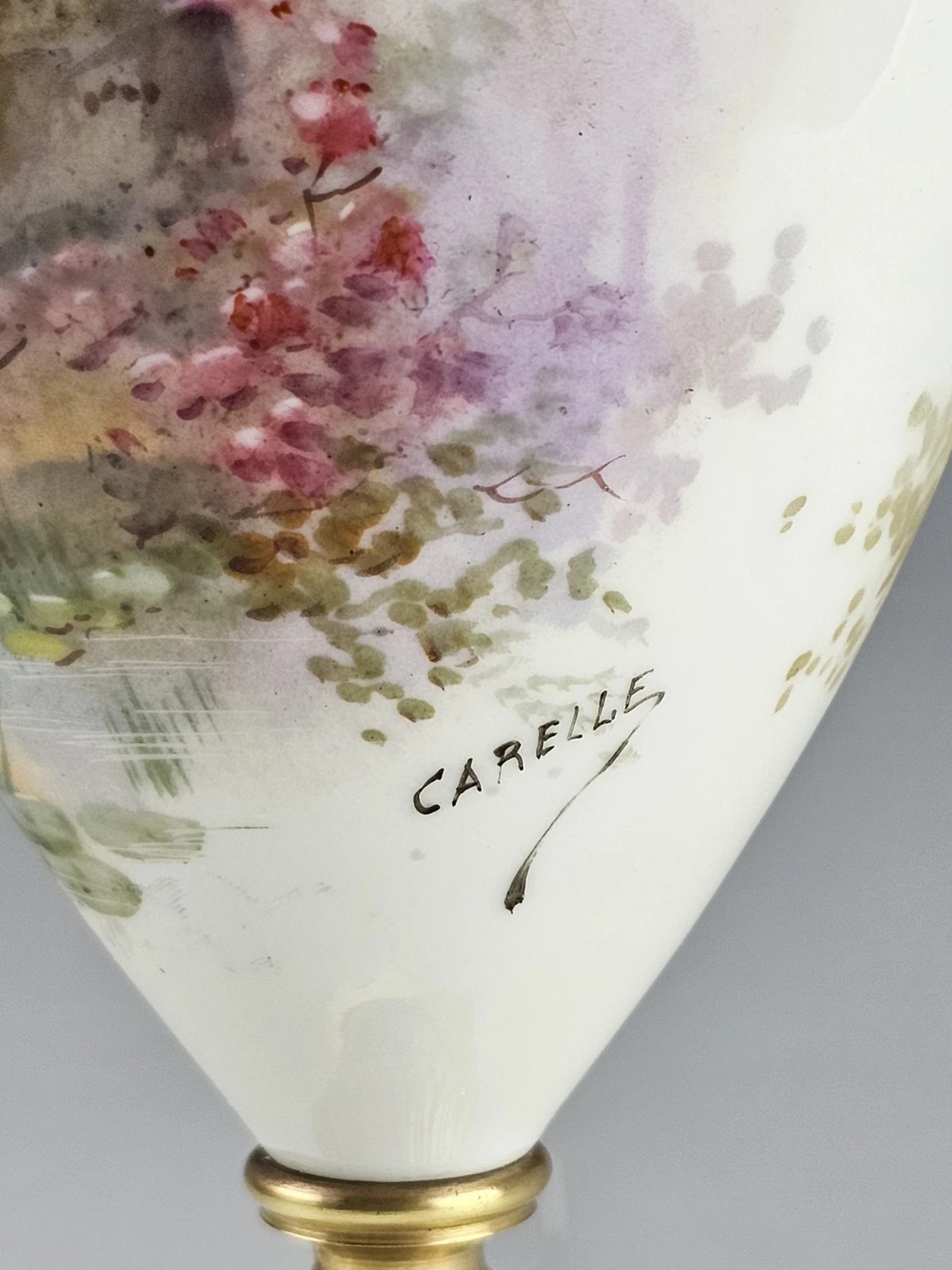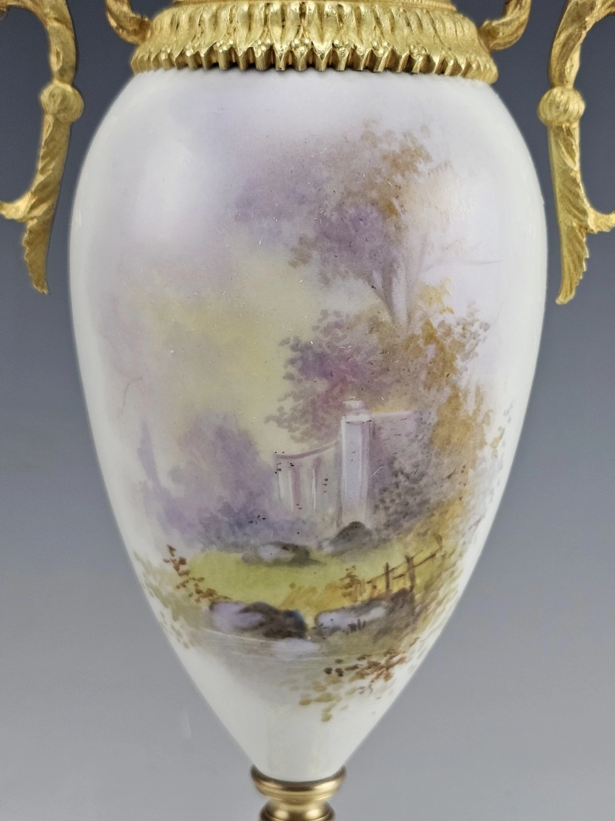 The porcelain hand painted in Art Nouveau style with the Nymph and cherub at the front and landscape on the rear.