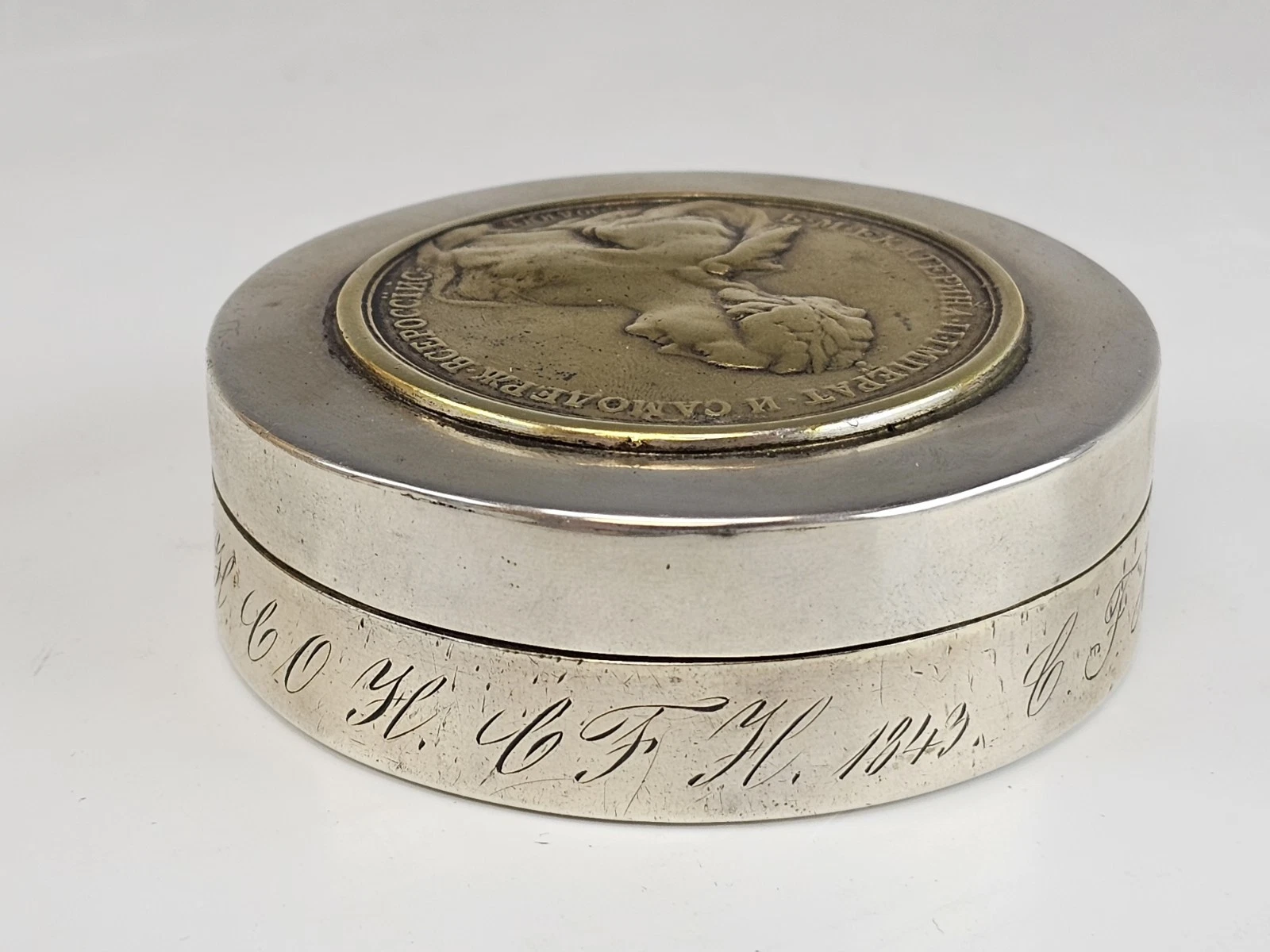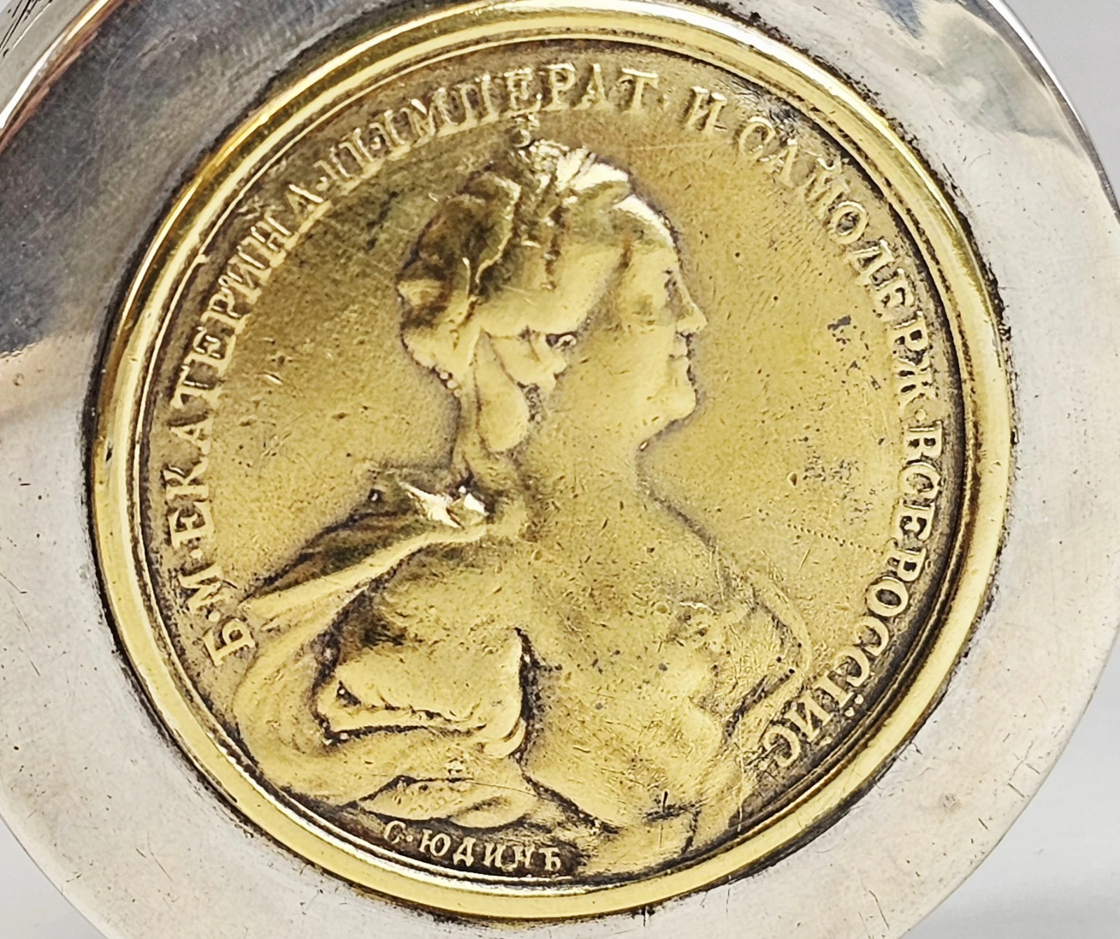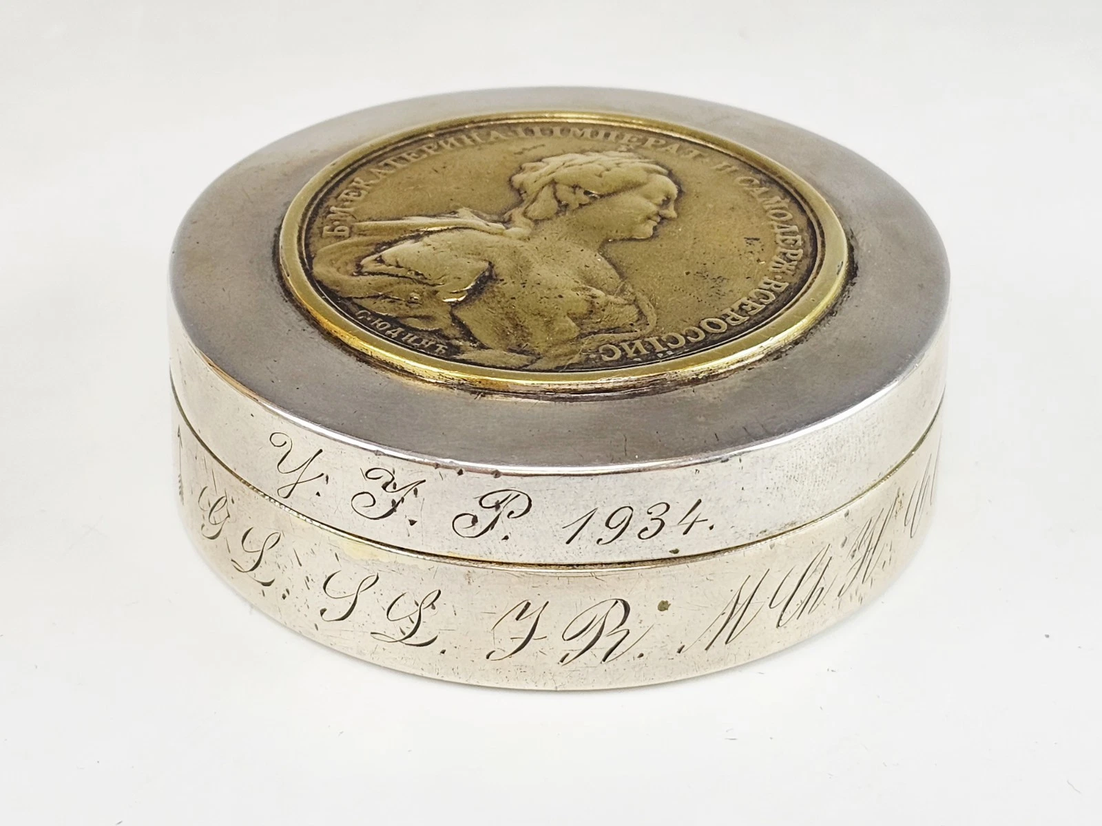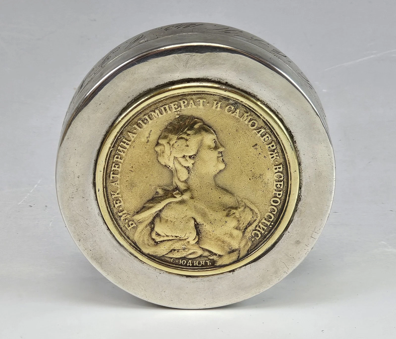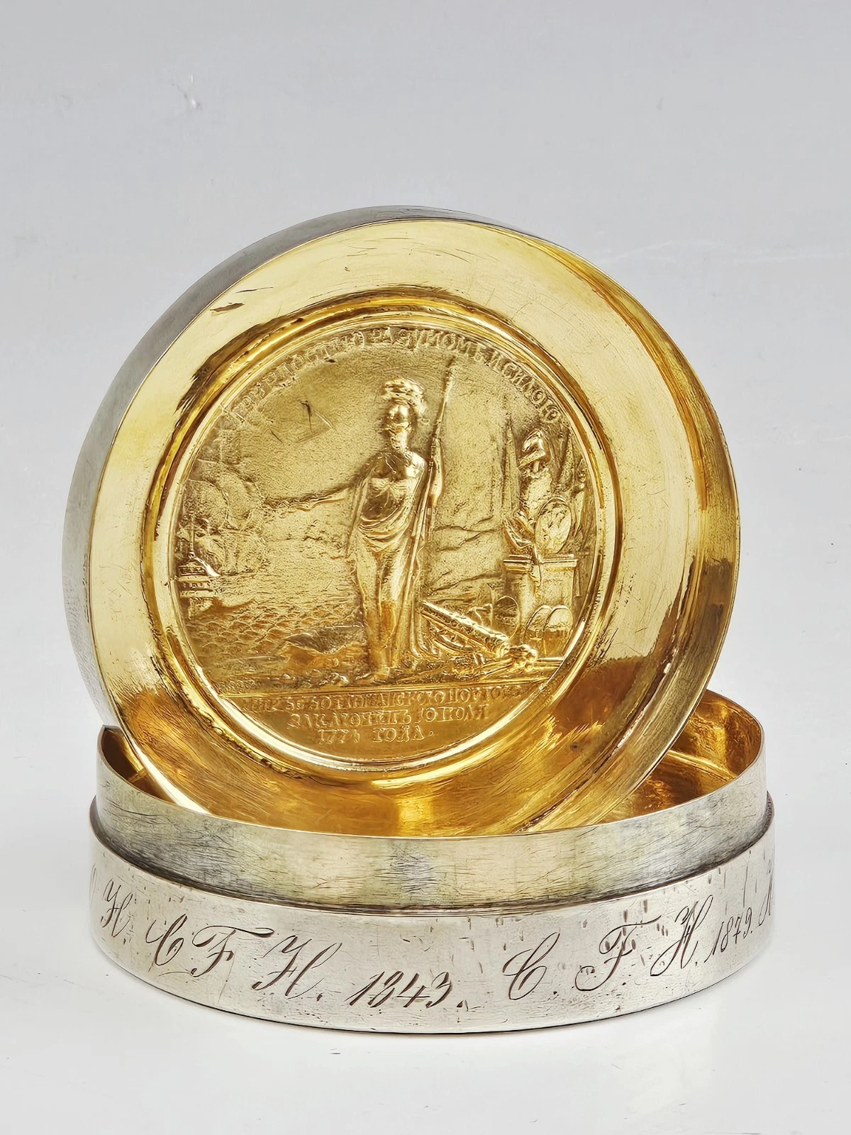 A large antique silver tobacco or spice box with a very rare Catherine The Second Medal Commemorating a Peace Treaty With Turkey, June 10, 1774. The cover of the round shaped silver box set with a 1774 medal engraved by S. Yudin and G. C. Waechter, commemorating the July 10, 1774 peace treaty with Turkey, features the bust of Empress Catherine II on the exterior cover and an image of the Pallas Athena flanked by war ships and war trophies. A gilt wash interior. The exterior edges are engraved with various initials and dates, started from 1843 to 1934 .