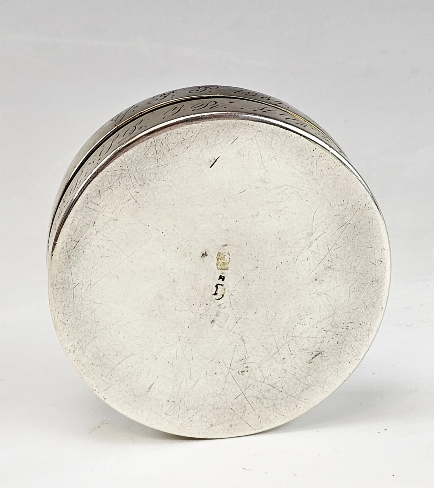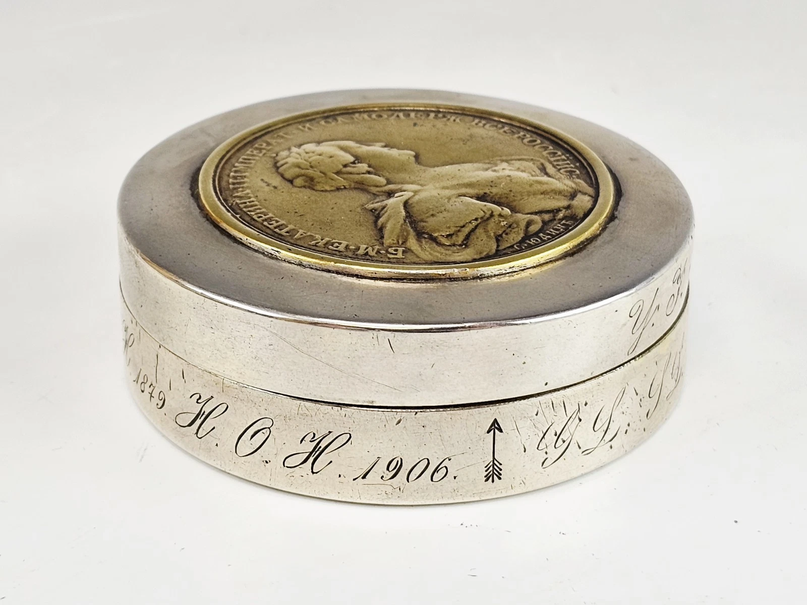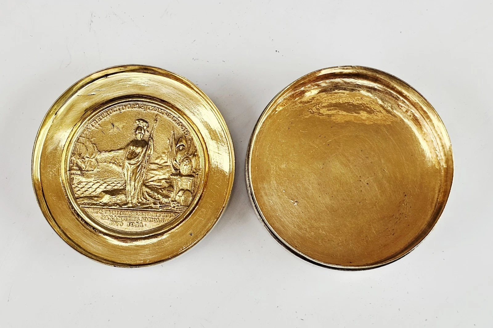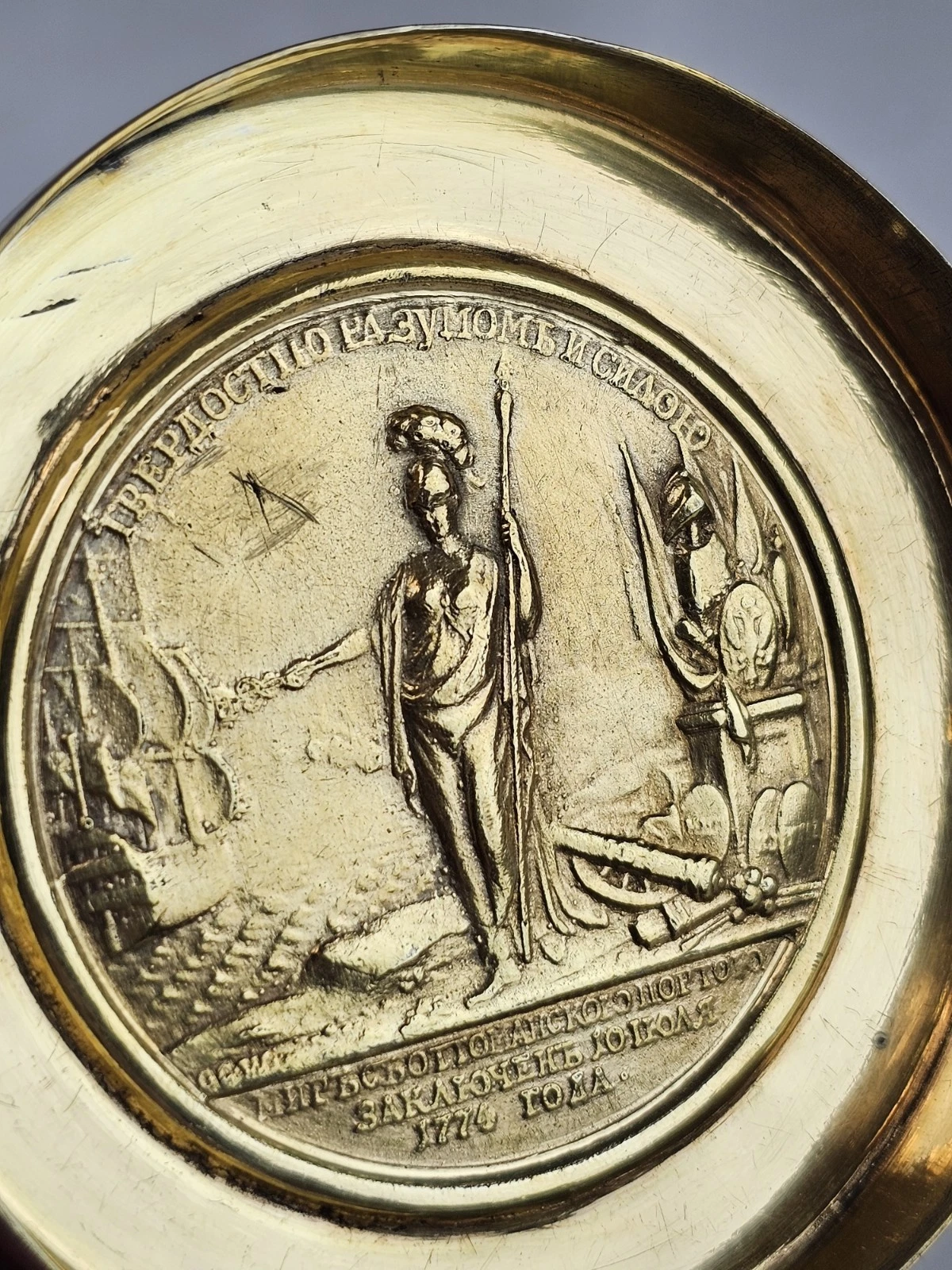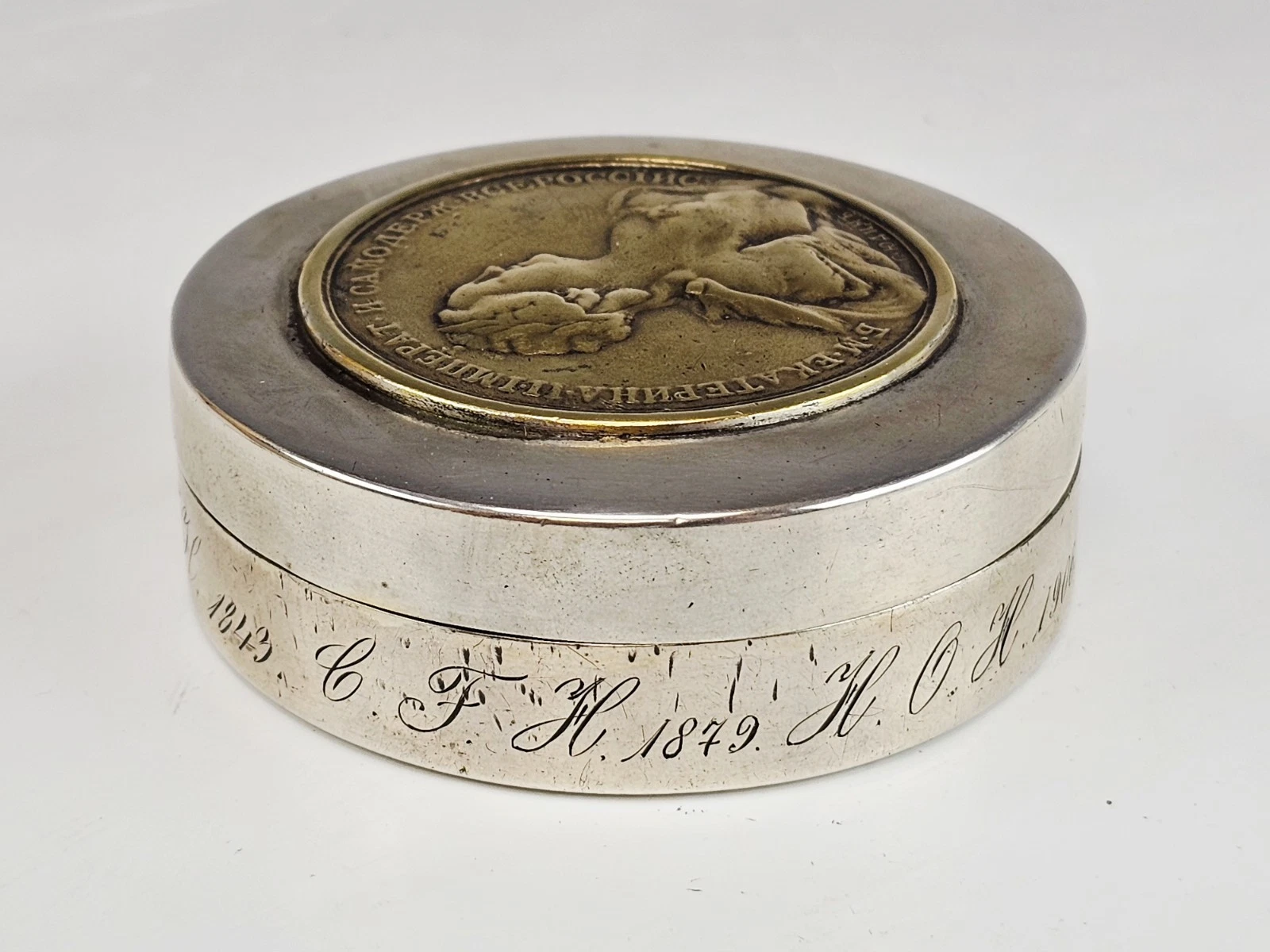 A large antique silver tobacco or spice box with a very rare Catherine The Second Medal Commemorating a Peace Treaty With Turkey, June 10, 1774. The cover of the round shaped silver box set with a 1774 medal engraved by S. Yudin and G. C. Waechter, commemorating the July 10, 1774 peace treaty with Turkey, features the bust of Empress Catherine II on the exterior cover and an image of the Pallas Athena flanked by war ships and war trophies. A gilt wash interior. The exterior edges are engraved with various initials and dates, started from 1843 to 1934 .