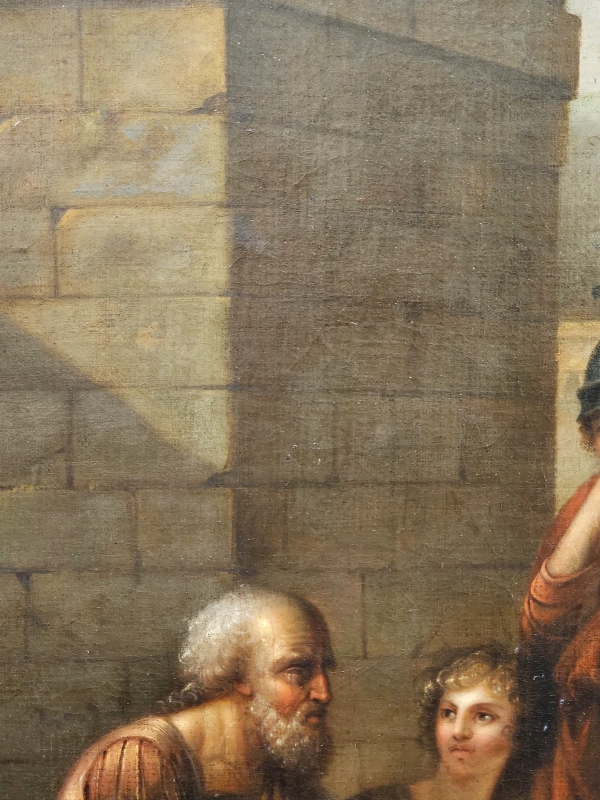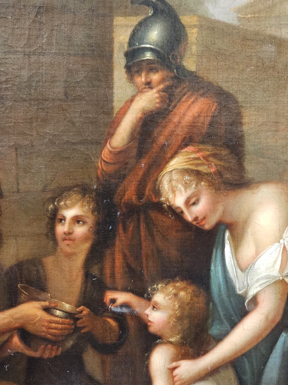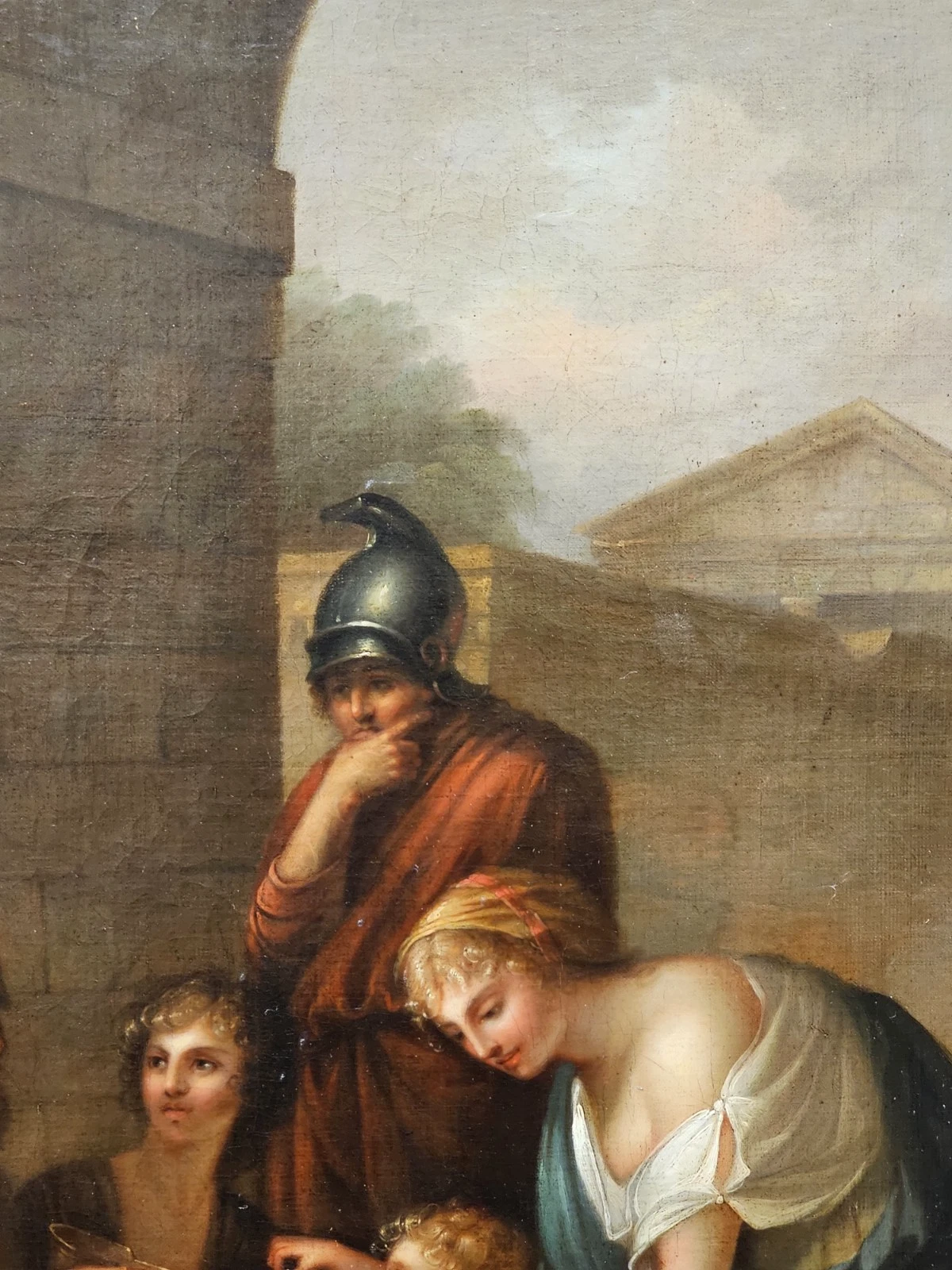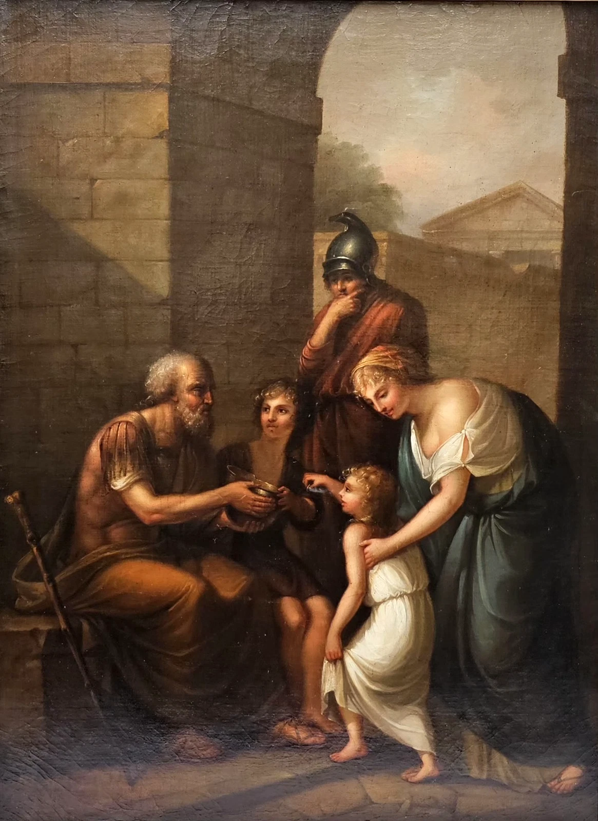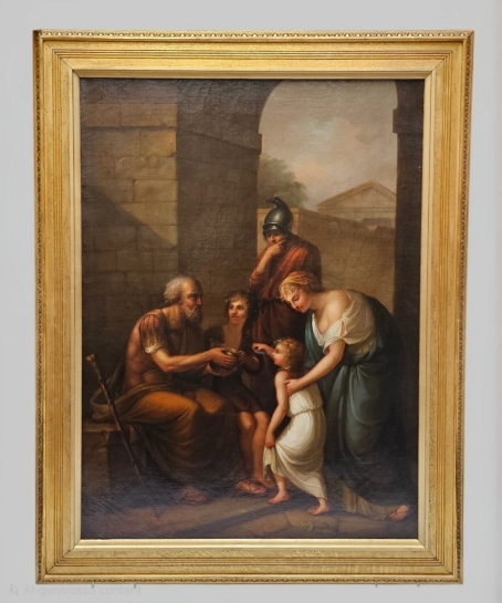 This finely executed Neoclassical oil painting depicts a moralizing scene set within a classical architectural environment. Beneath a monumental archway, a group of figures gathers around an elderly man holding a bowl, while a young boy and a small child appear to offer assistance or charity. A woman gently guides the child, and a Roman soldier stands behind them observing the interaction. In the background, a classical temple further reinforces the antique setting.