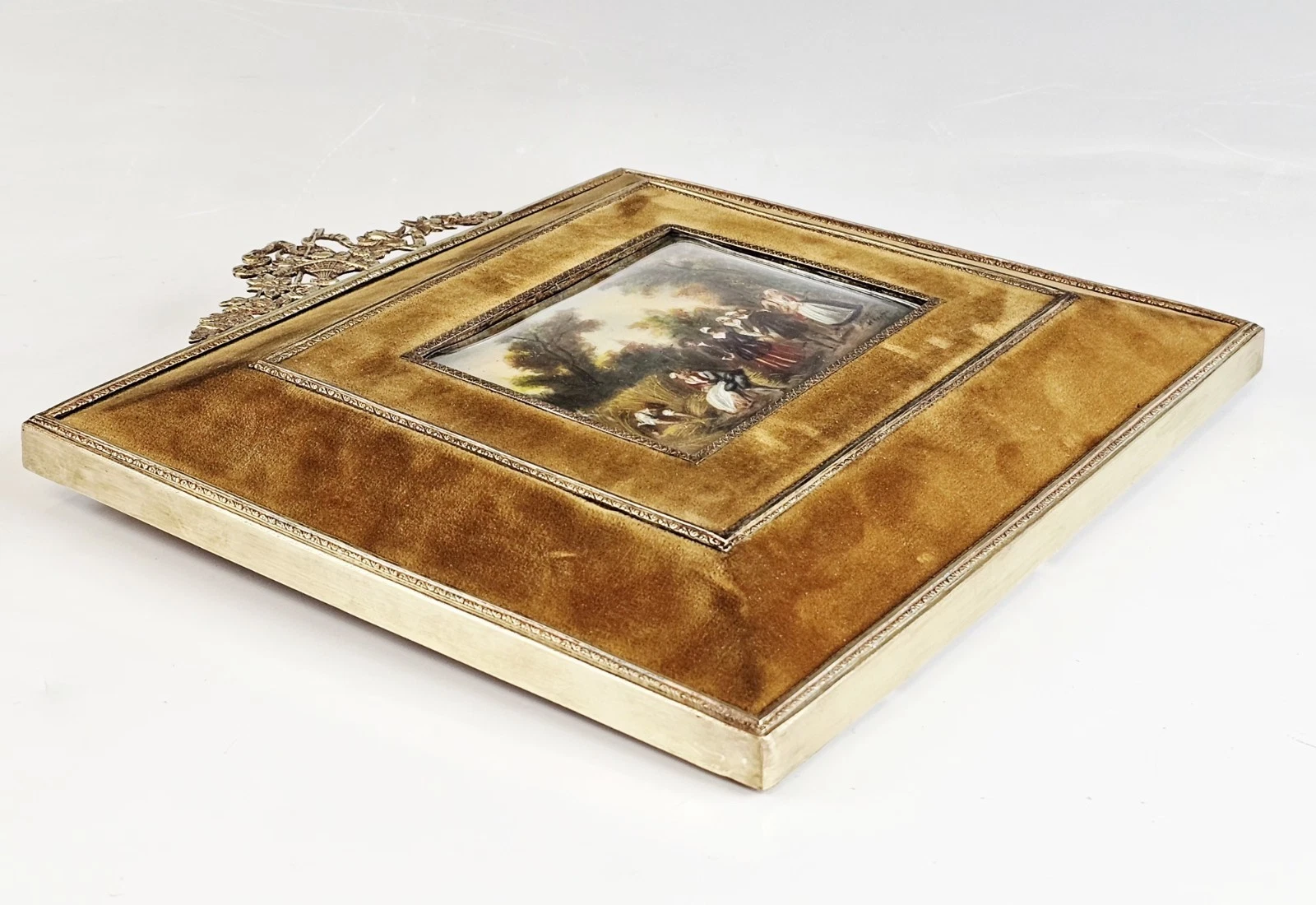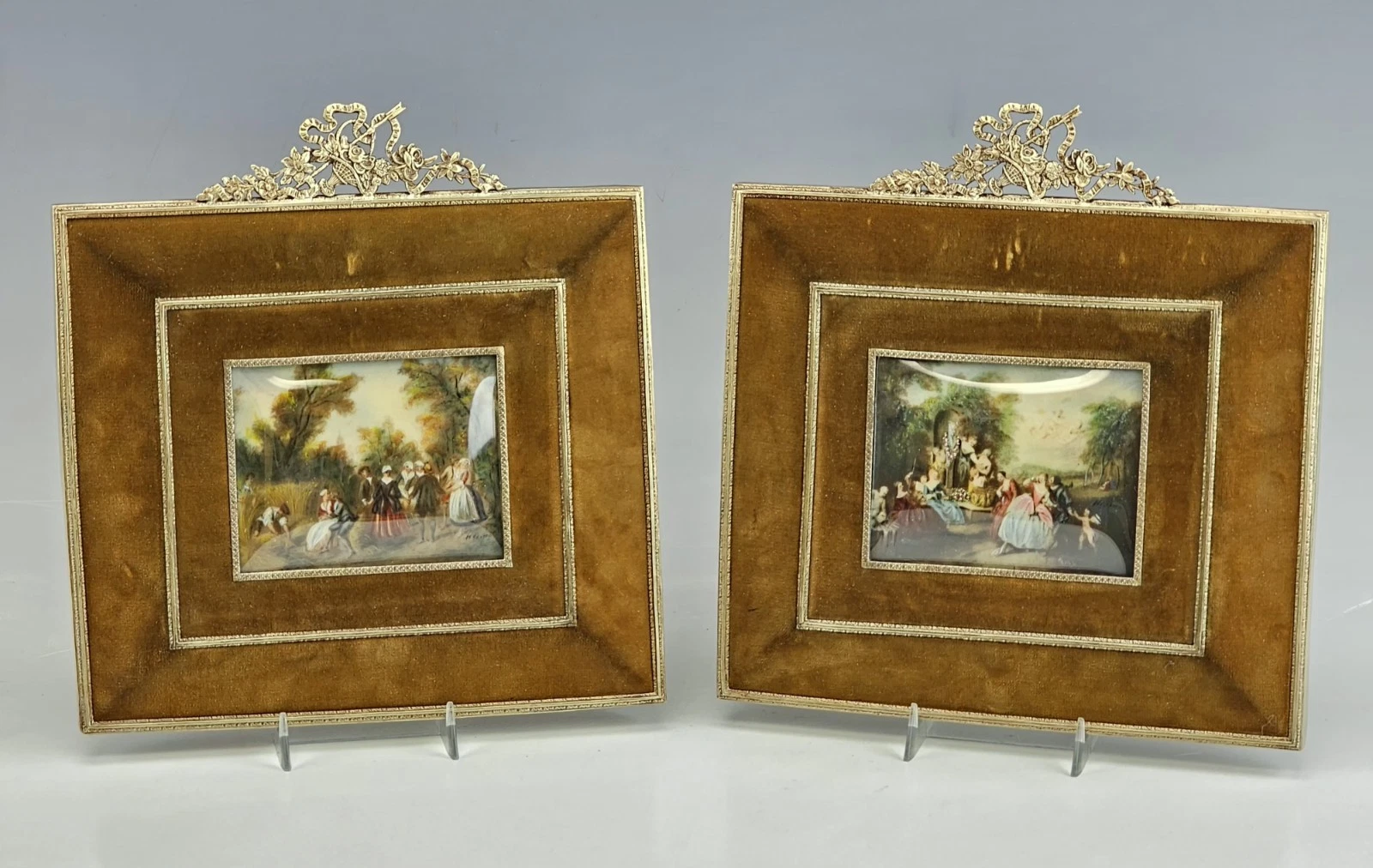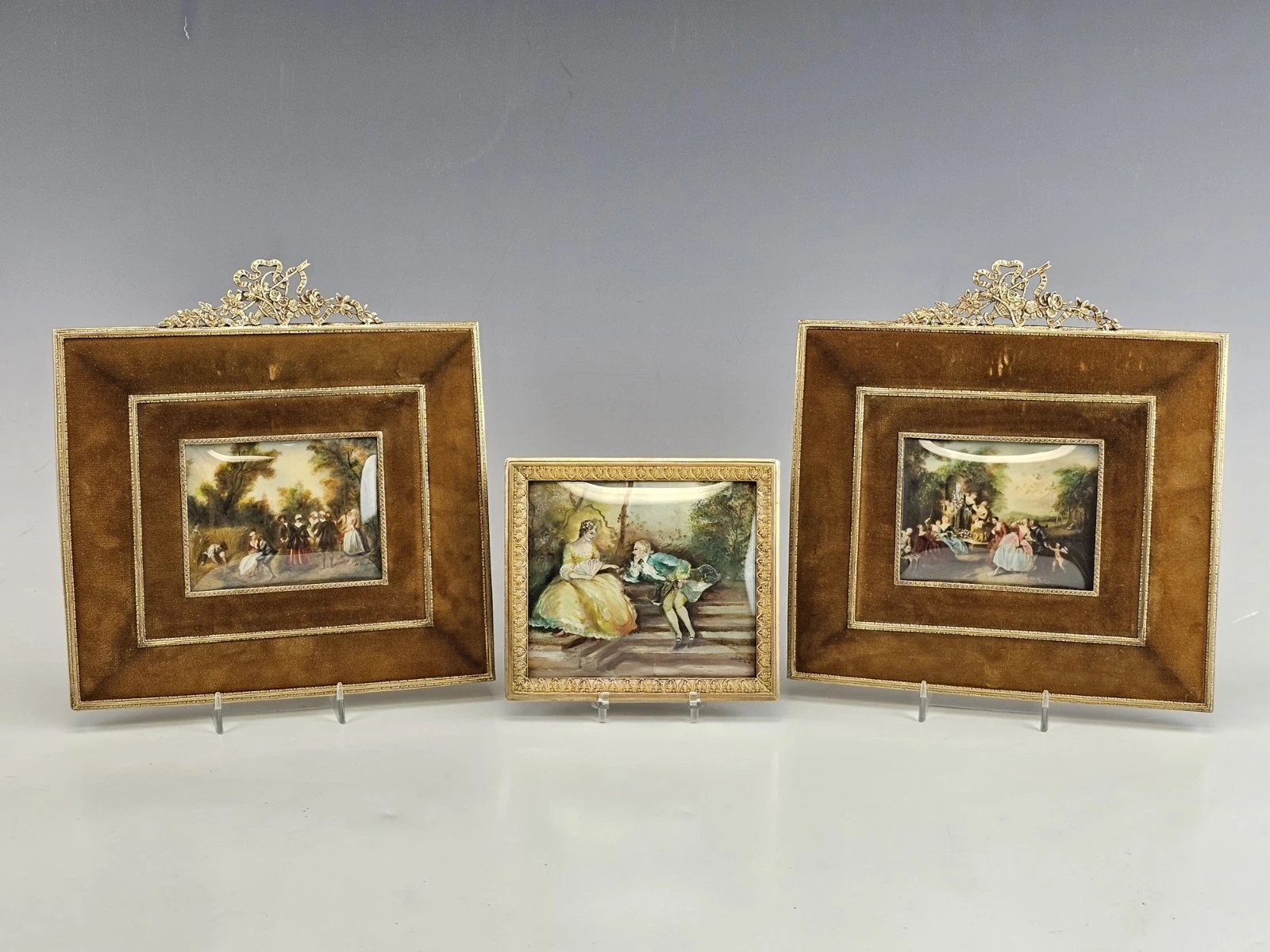 The two larger paintings are mounted in substantial velvet frames with gilt bronze inner borders and elaborate rococo crest ornaments featuring scrolling foliage and ribbon motifs.