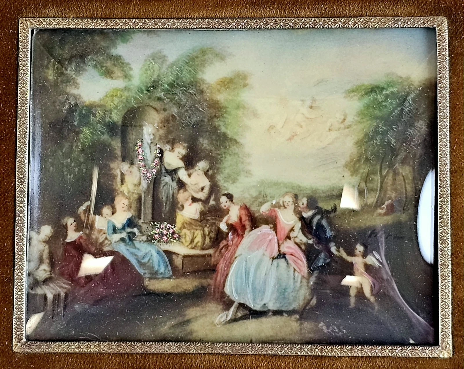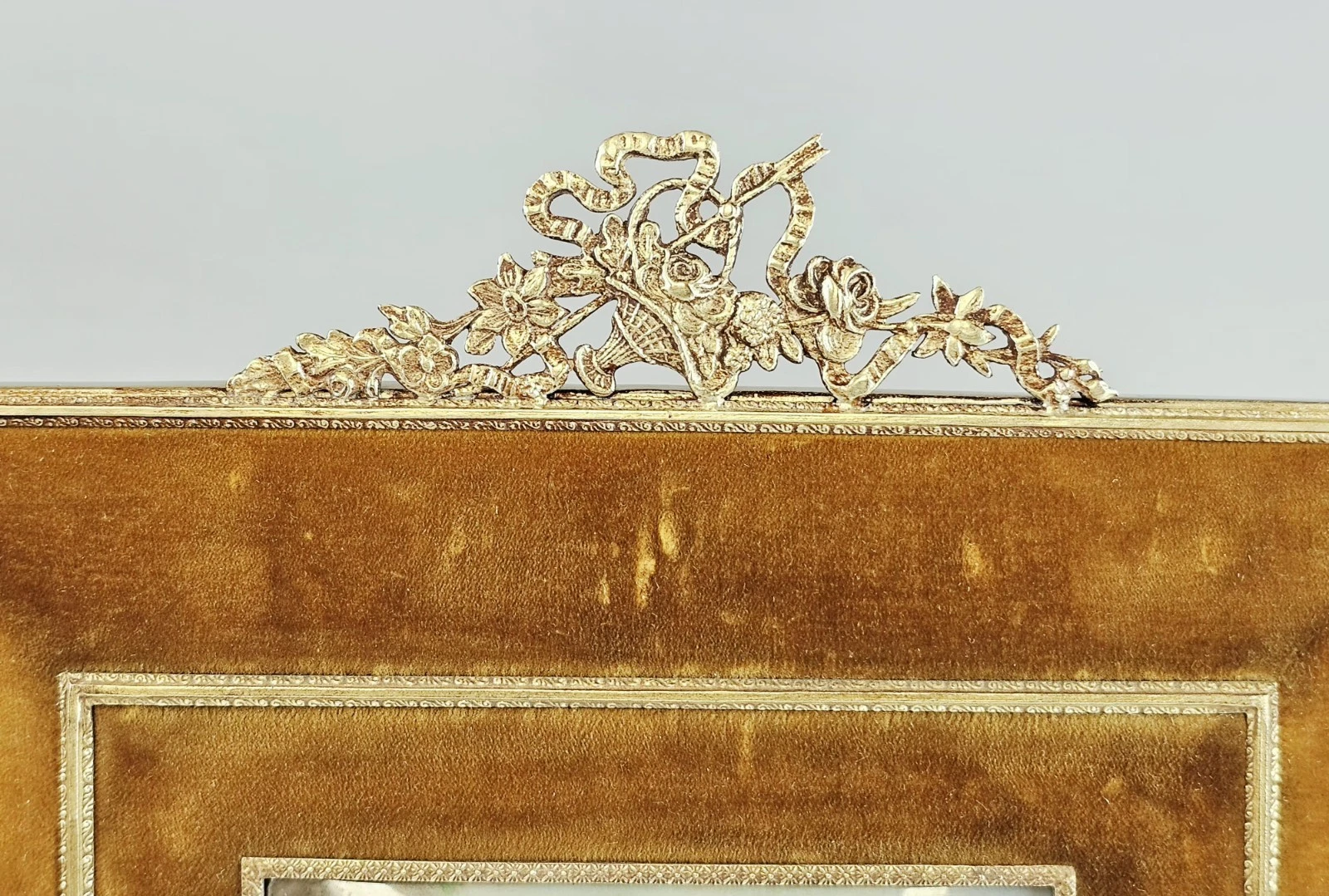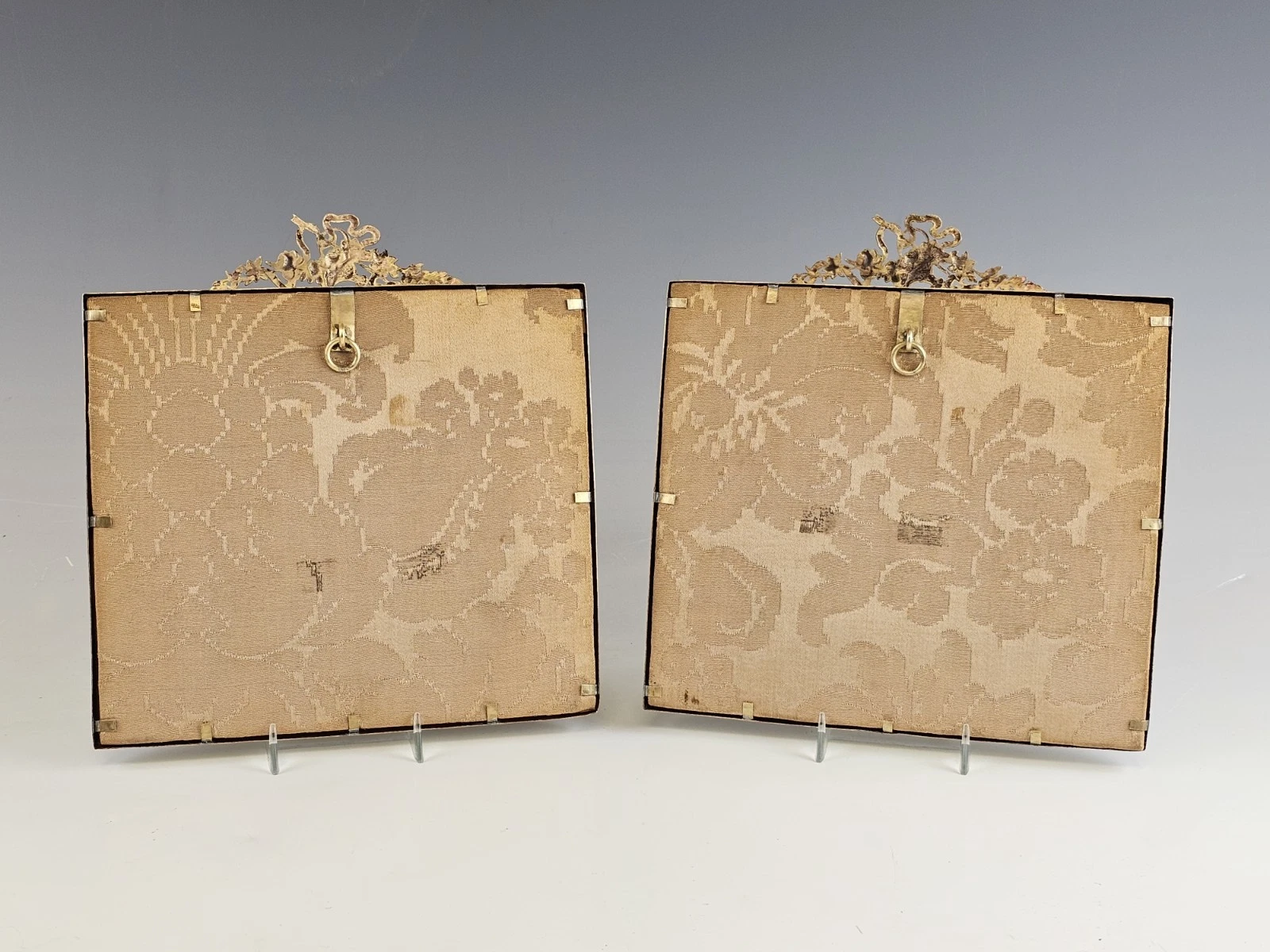 The two larger paintings are mounted in substantial velvet frames with gilt bronze inner borders and elaborate rococo crest ornaments featuring scrolling foliage and ribbon motifs.