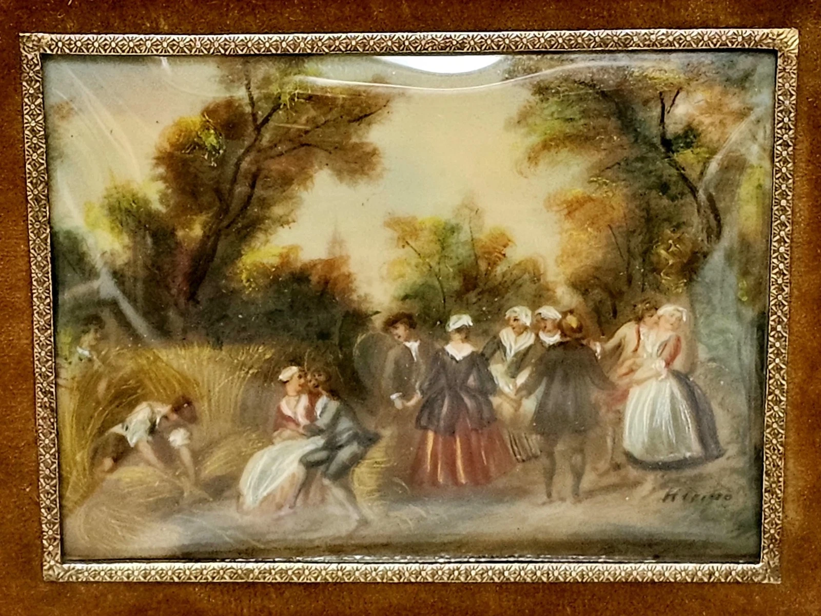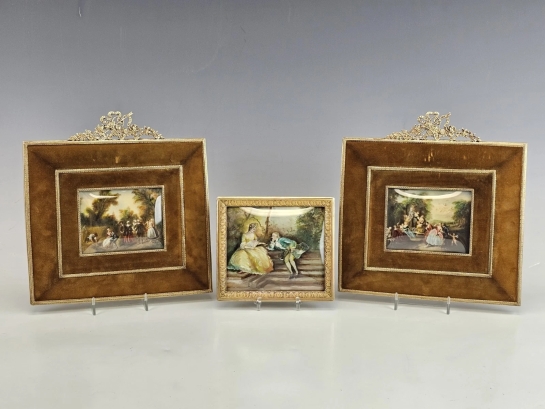 All three miniatures display refined brushwork, soft romantic palettes, and strong decorative appeal reminiscent of French 18th-century fête galante compositions.
