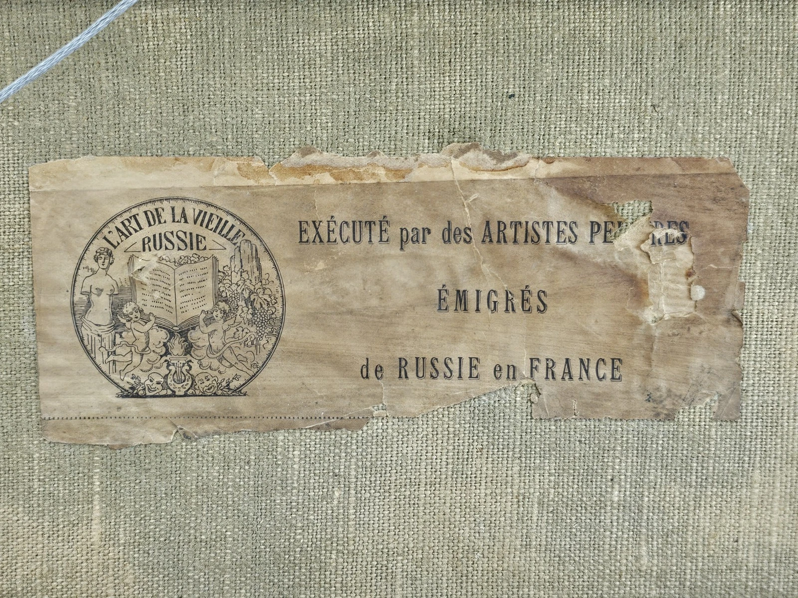 The verso of the Canvas with the original label in French " L'Art de La Vieille Russie" , Execute par des Artistes Pe...