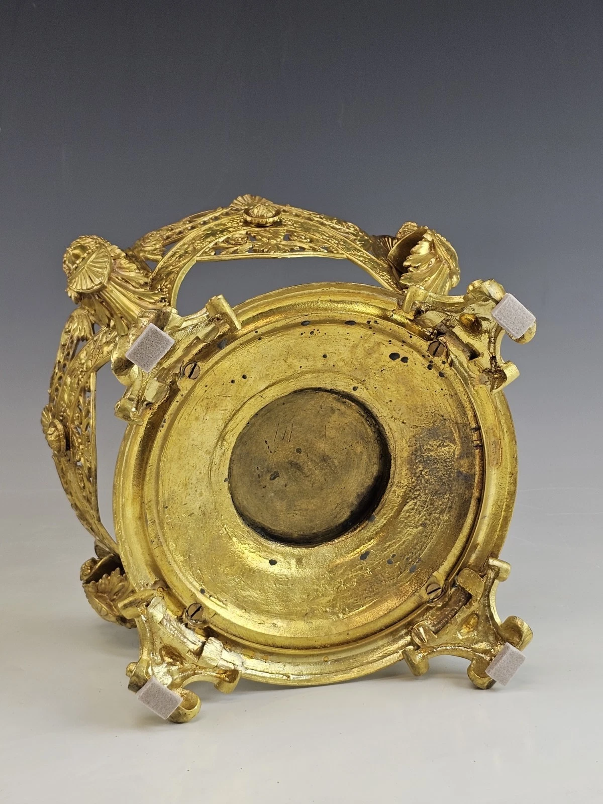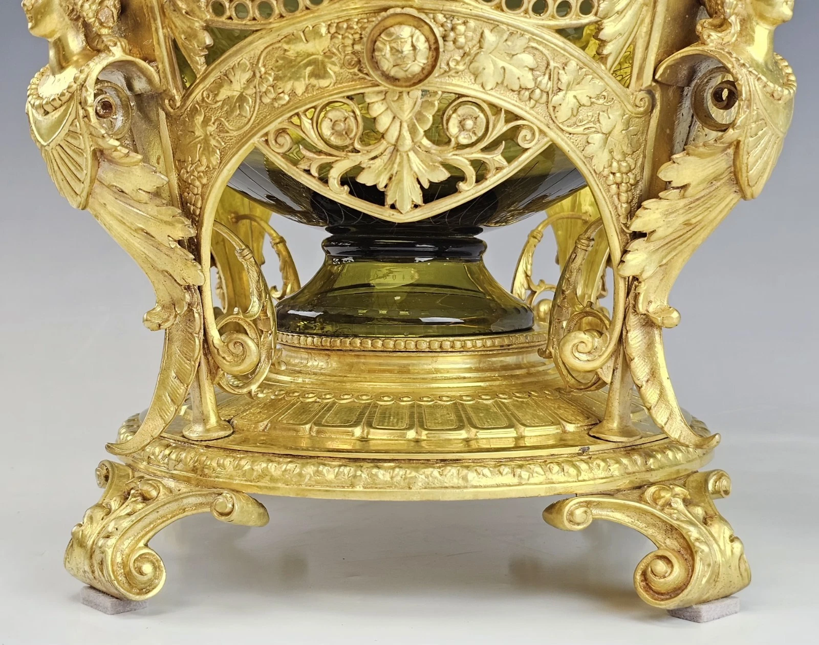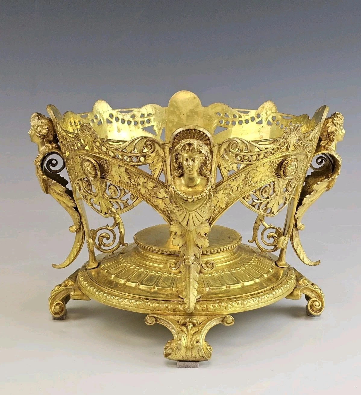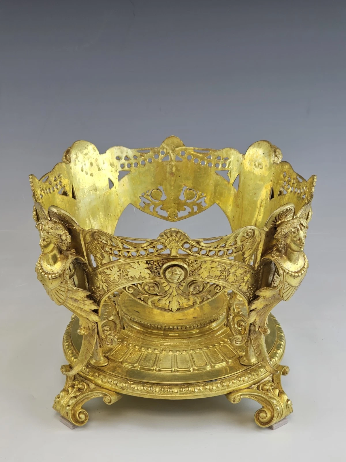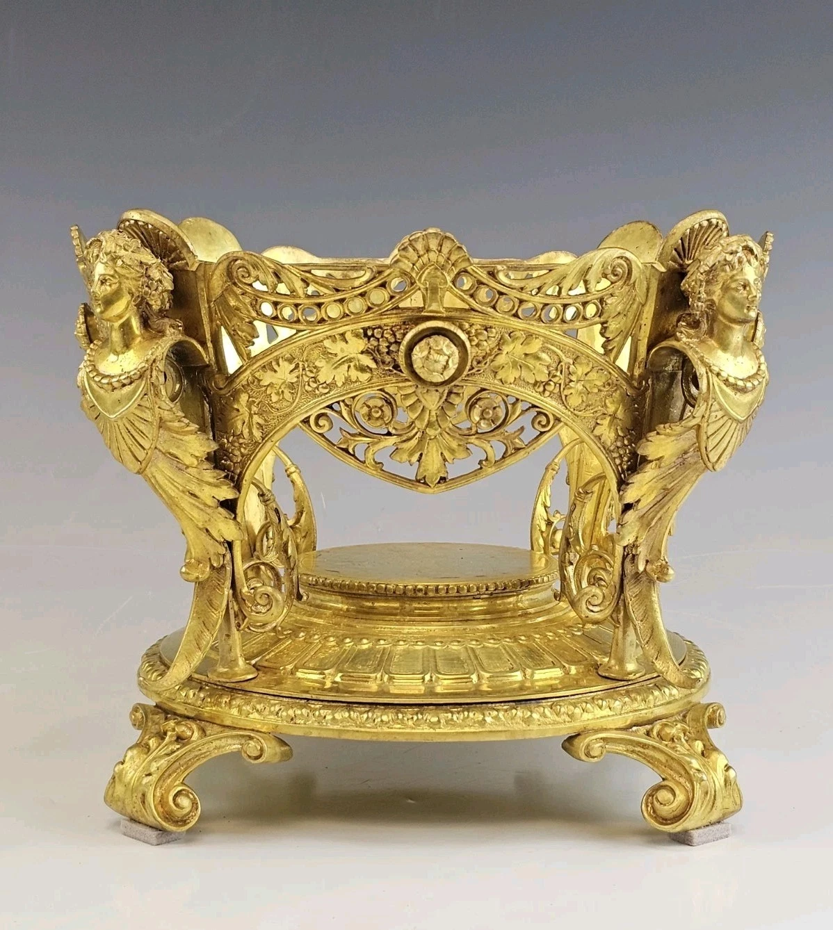 Very ornate gilt bronze round base on four feet decorated with flowers and grape leaves accented with women torso on each side.
