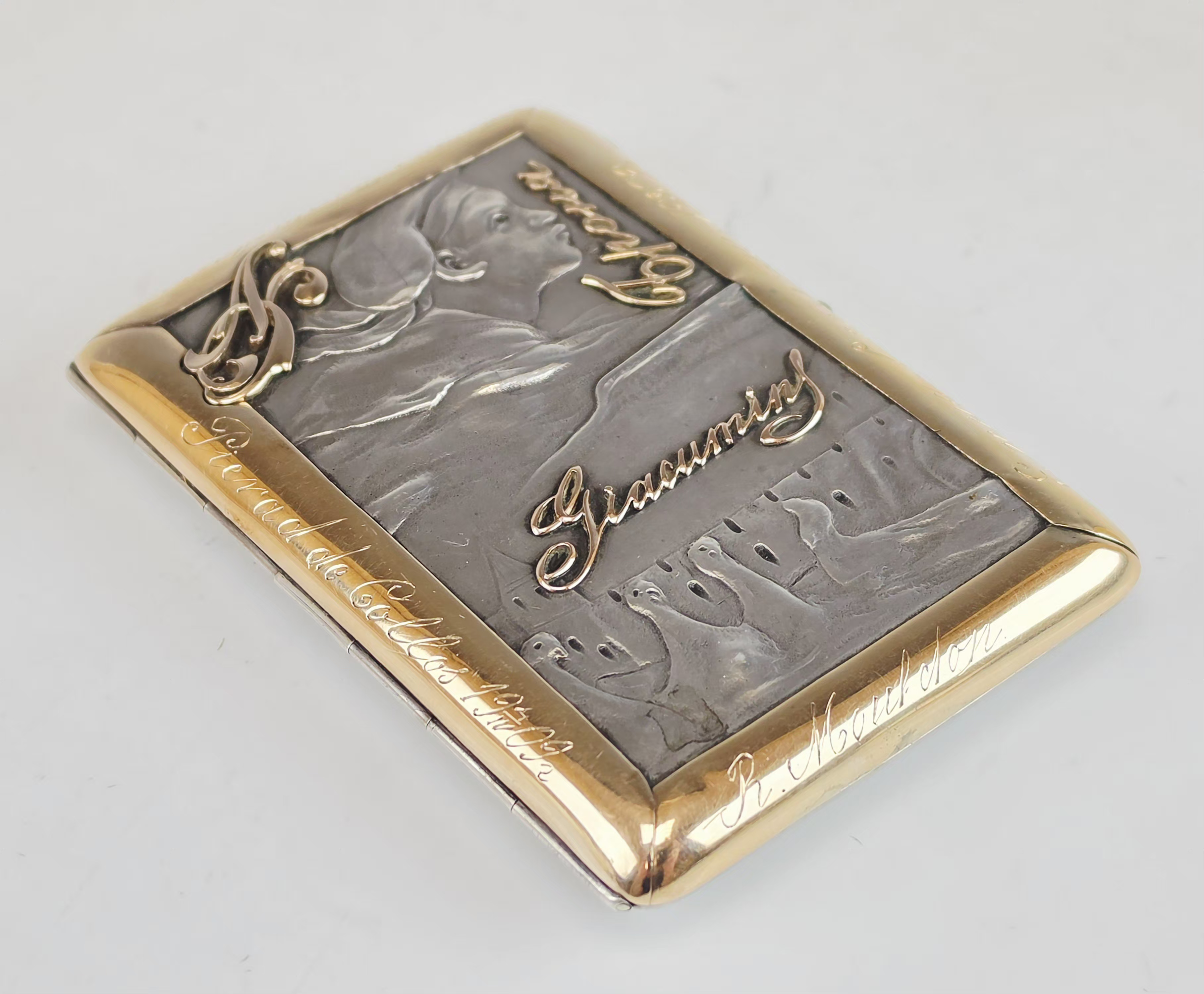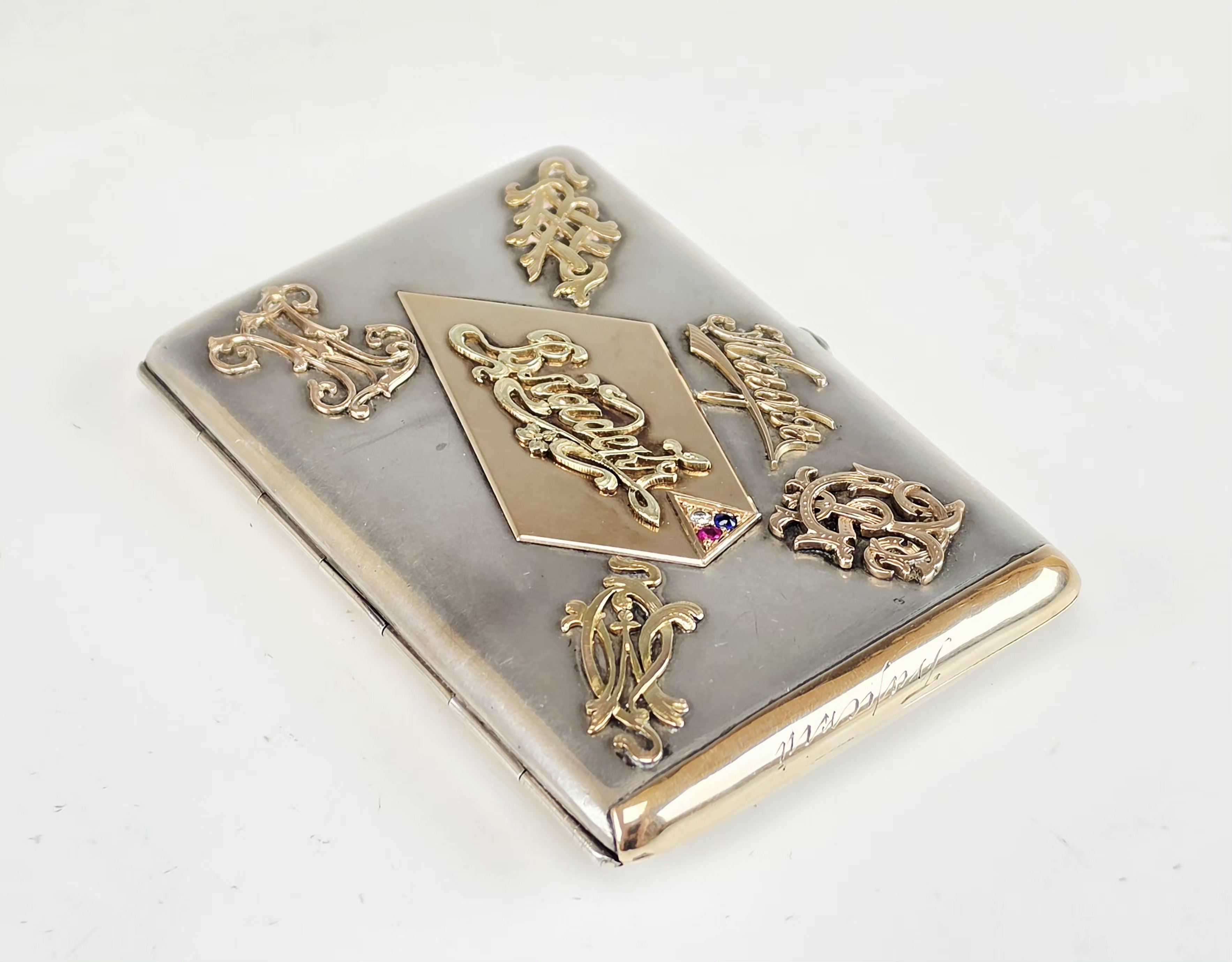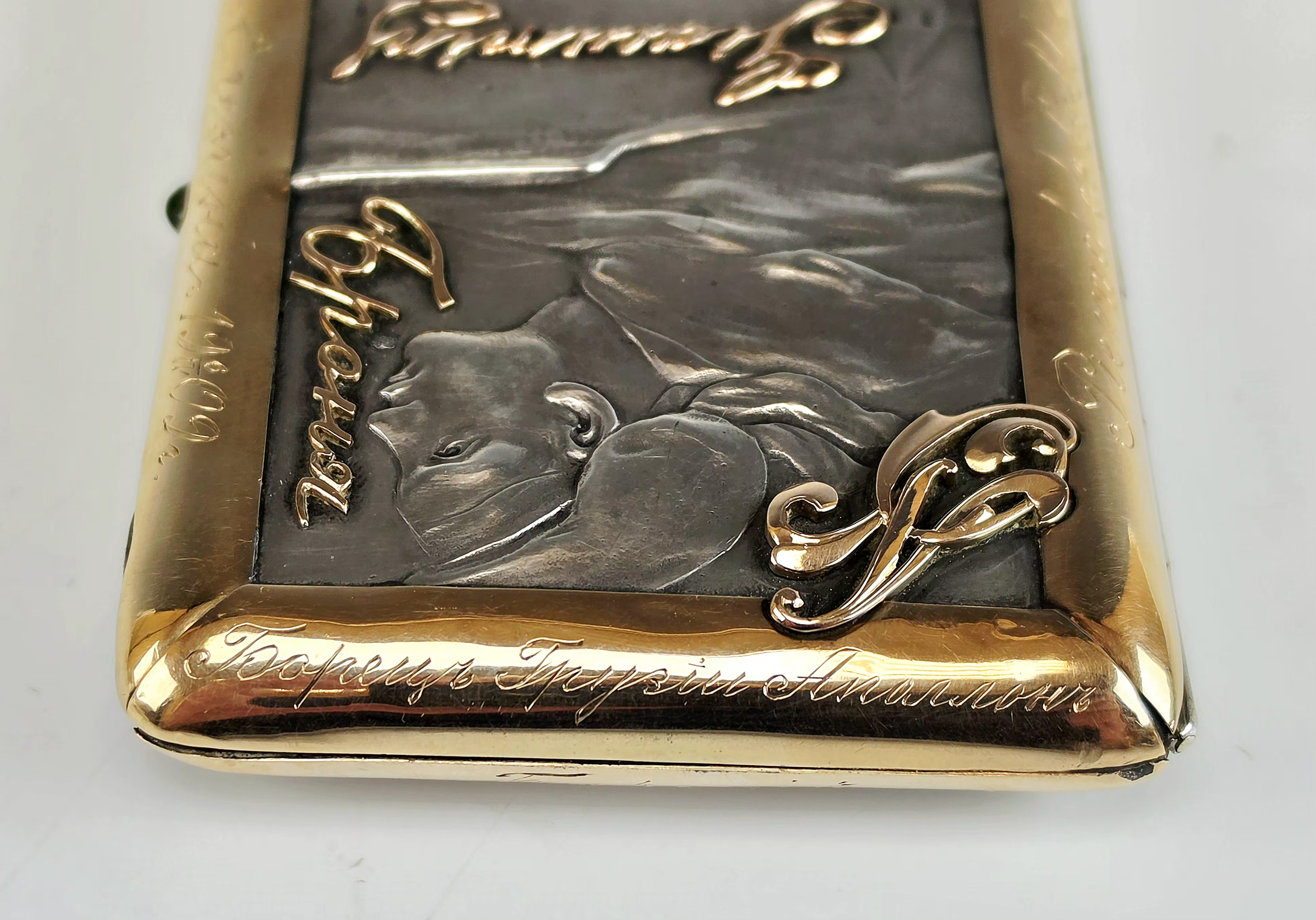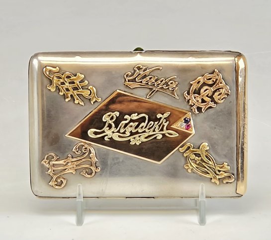 A striking and highly unusual 19th century Imperial Russian silver and gold mounted cigarette case. Hallmarked: Moscow, 84 silver standards with kokoshnik mark and assayer's mark, maker’s mark “ПА” (in Cyrillic), assayer’s mark.