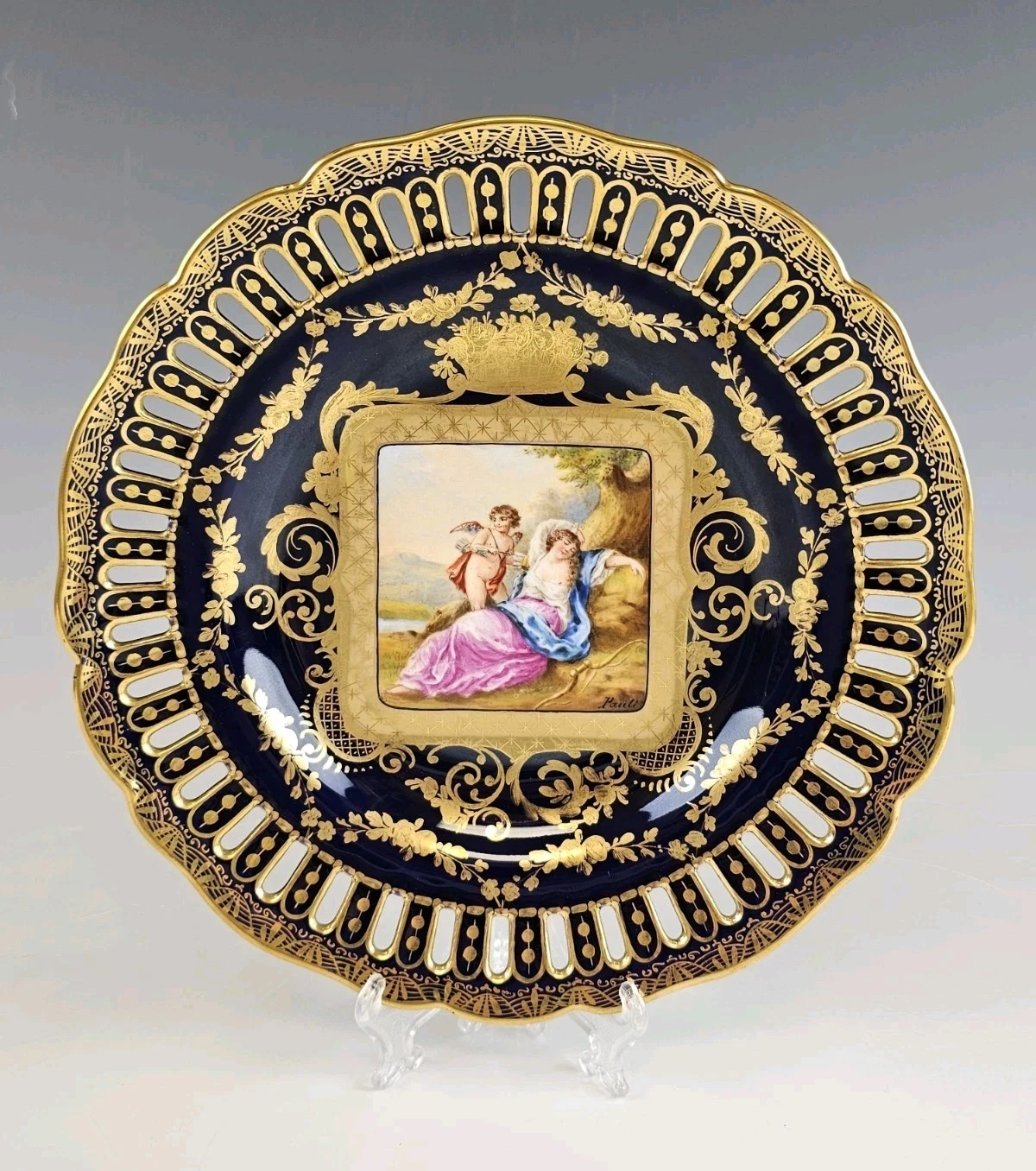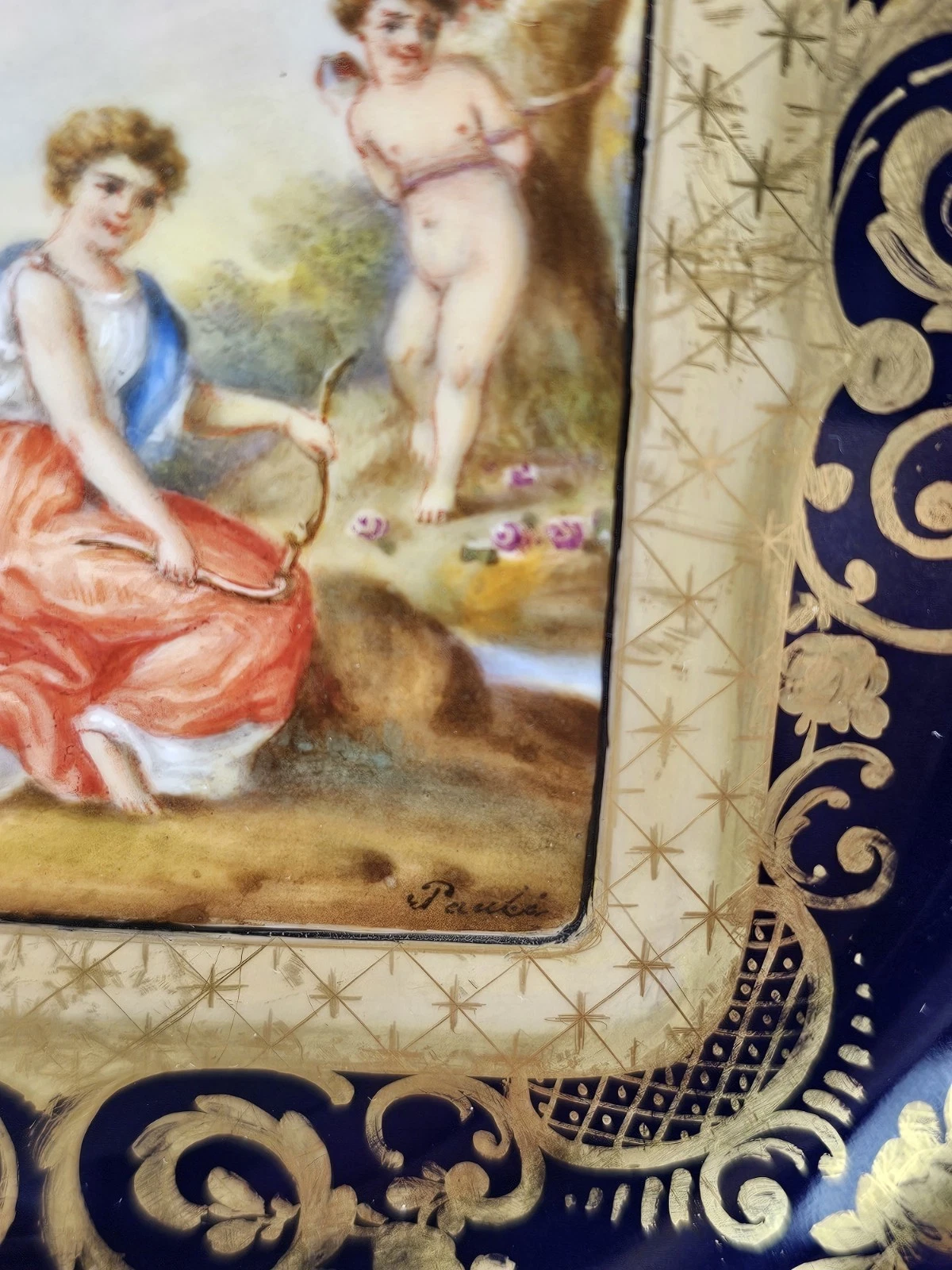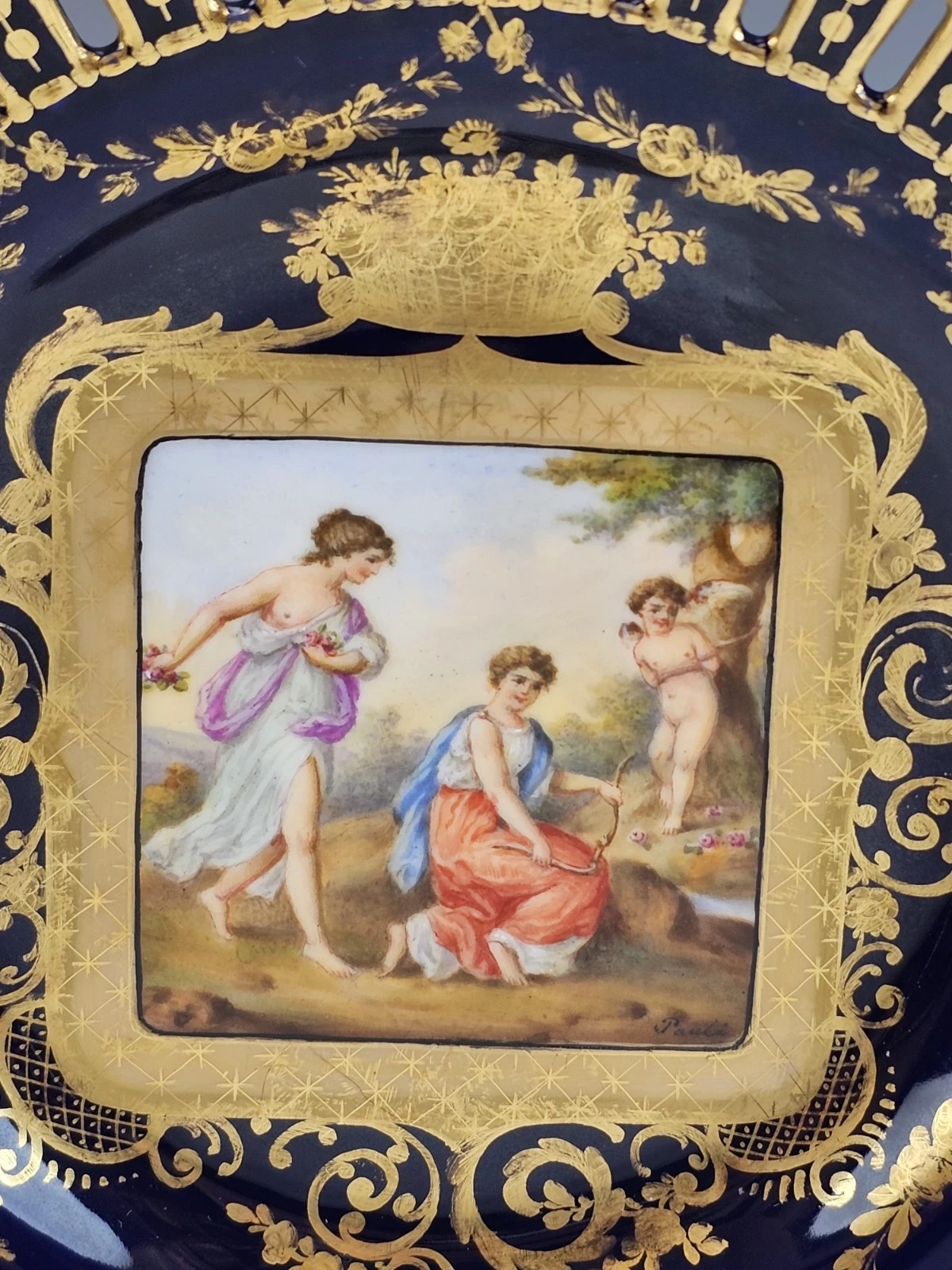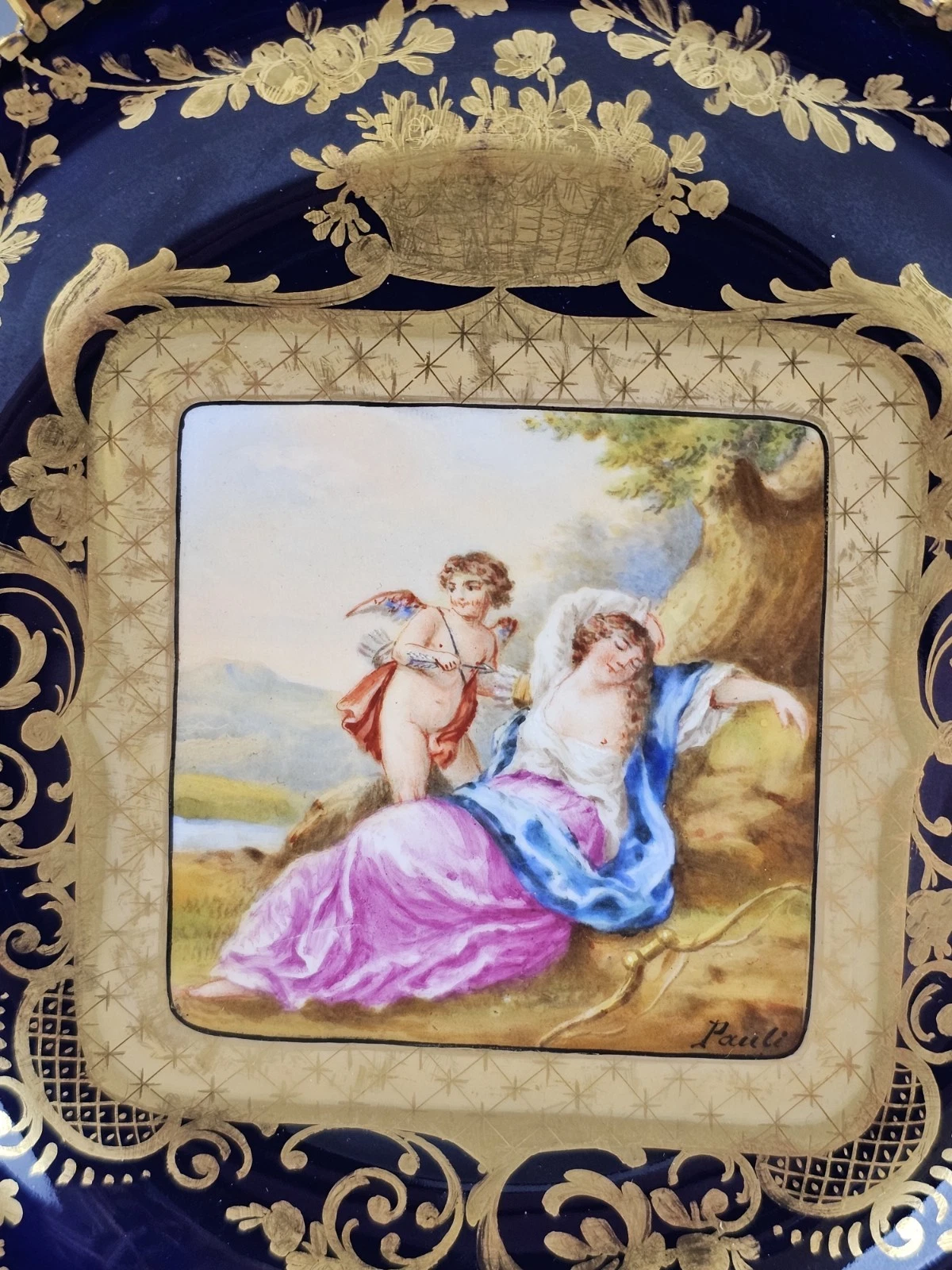 The center painted with methalogical scene surrounded by gold ornaments and floral design. Each signed Pauli.