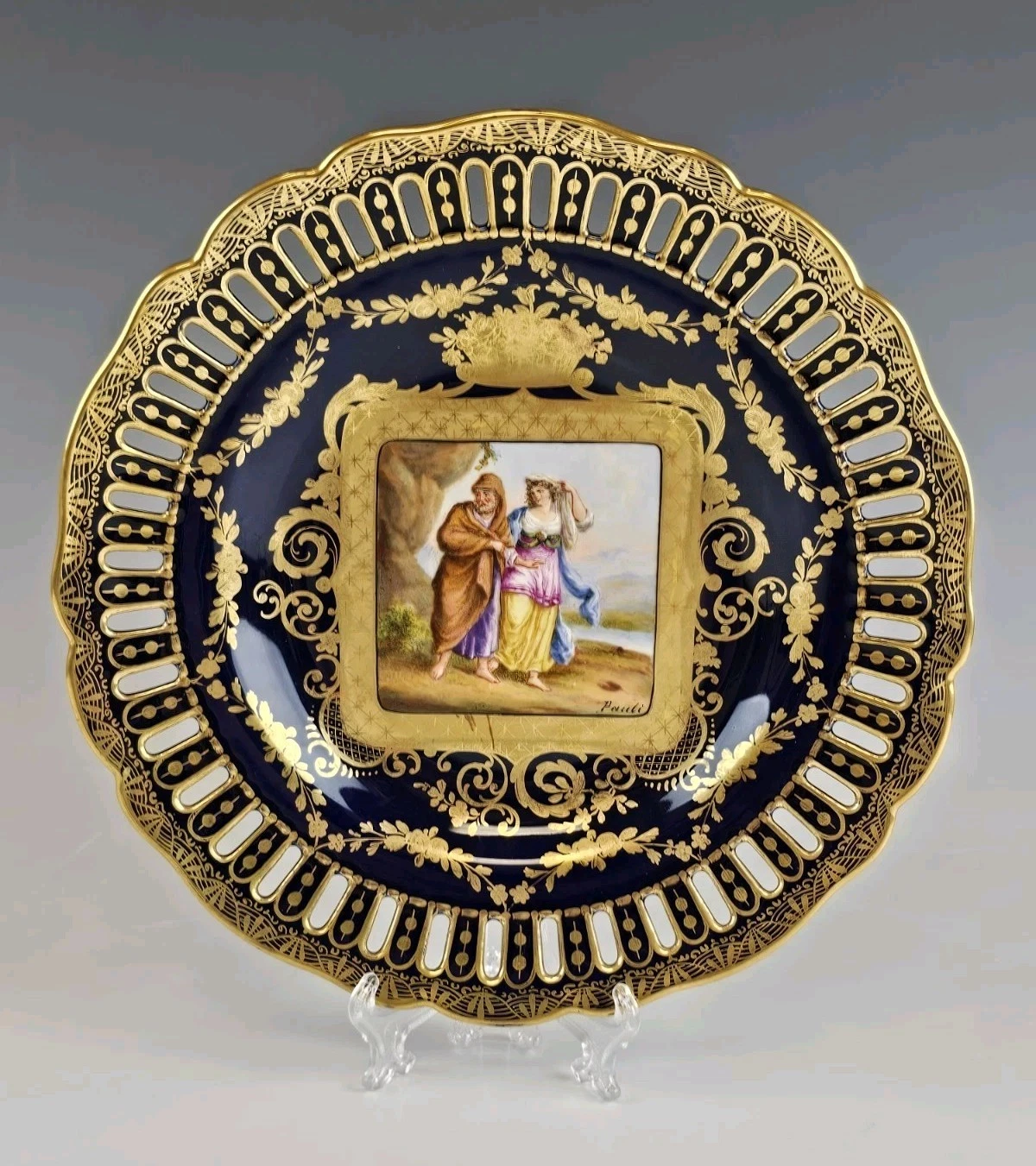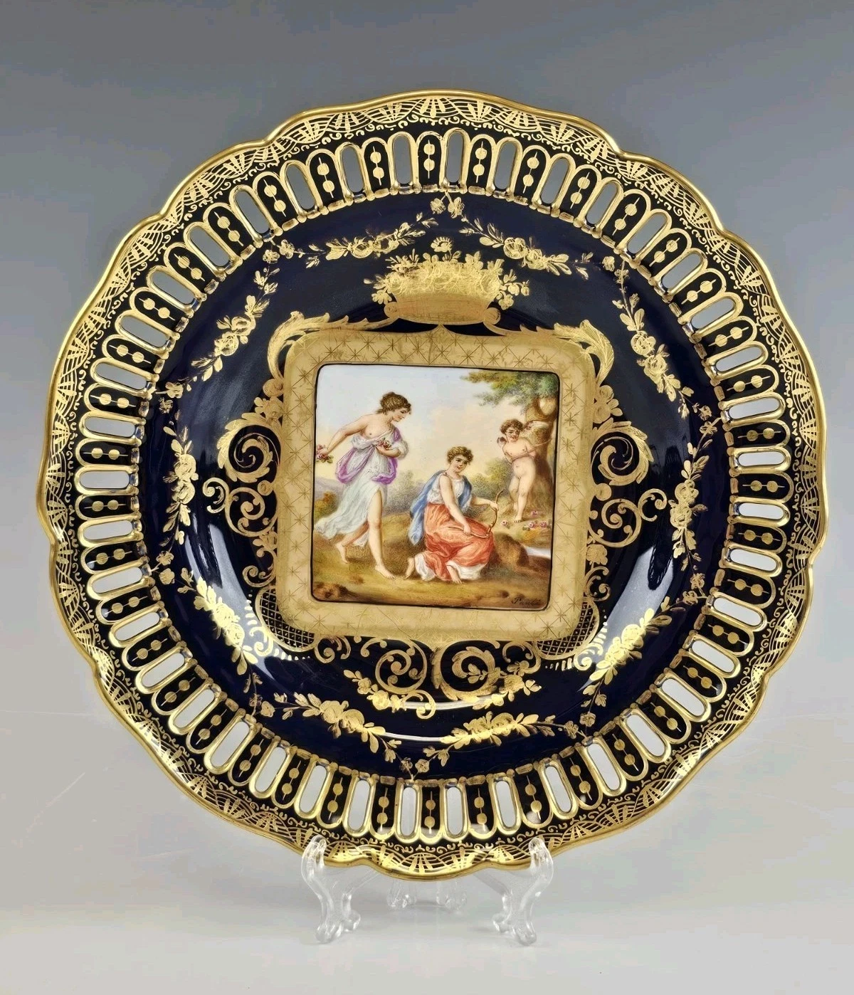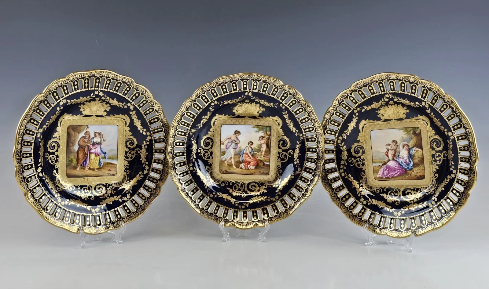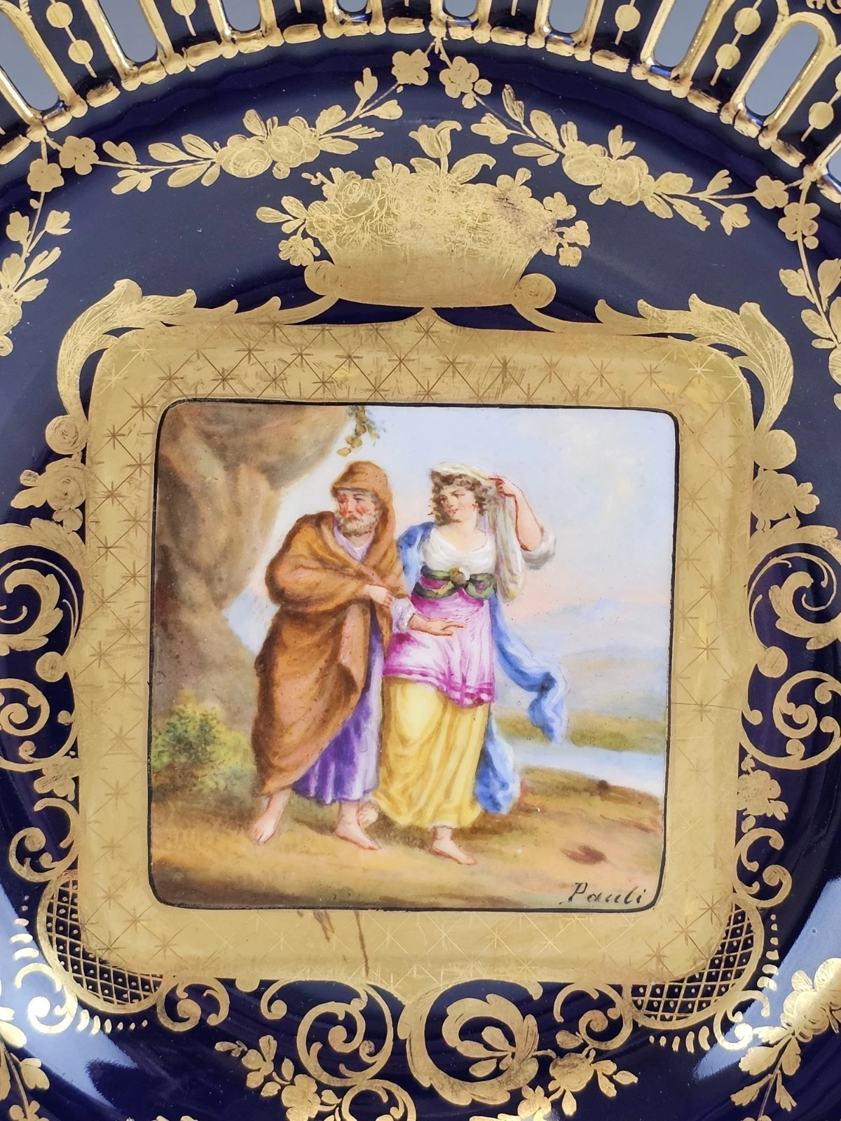 The center painted with methalogical scene surrounded by gold ornaments and floral design. Each signed Pauli.