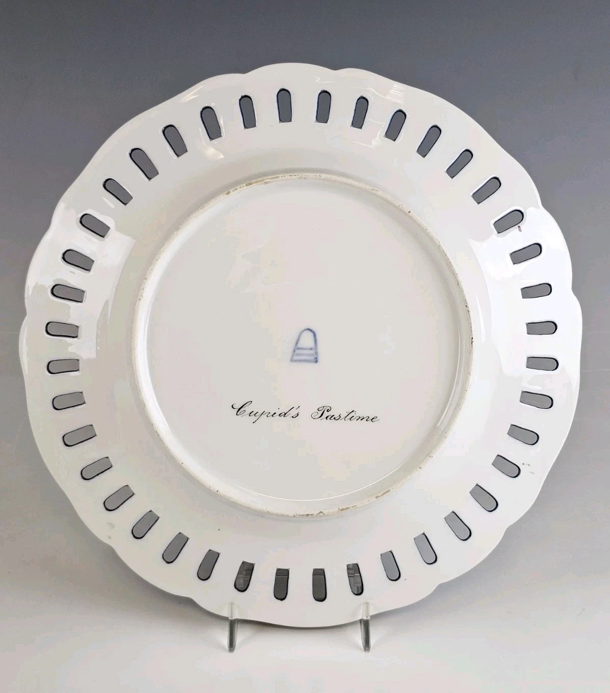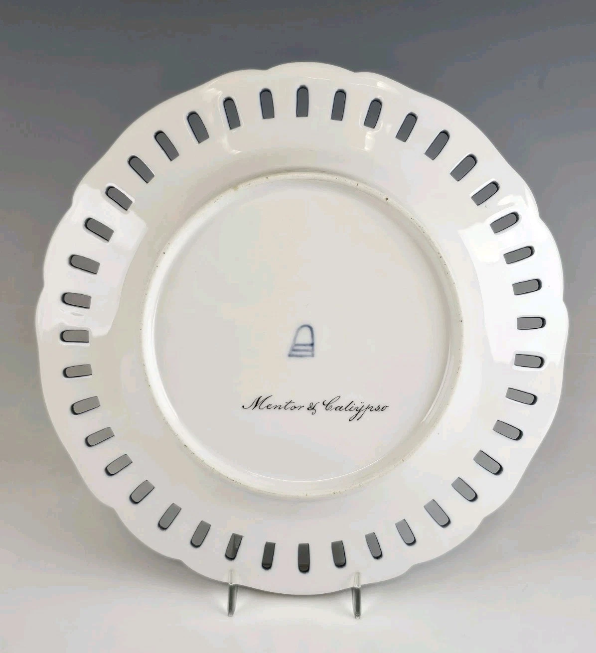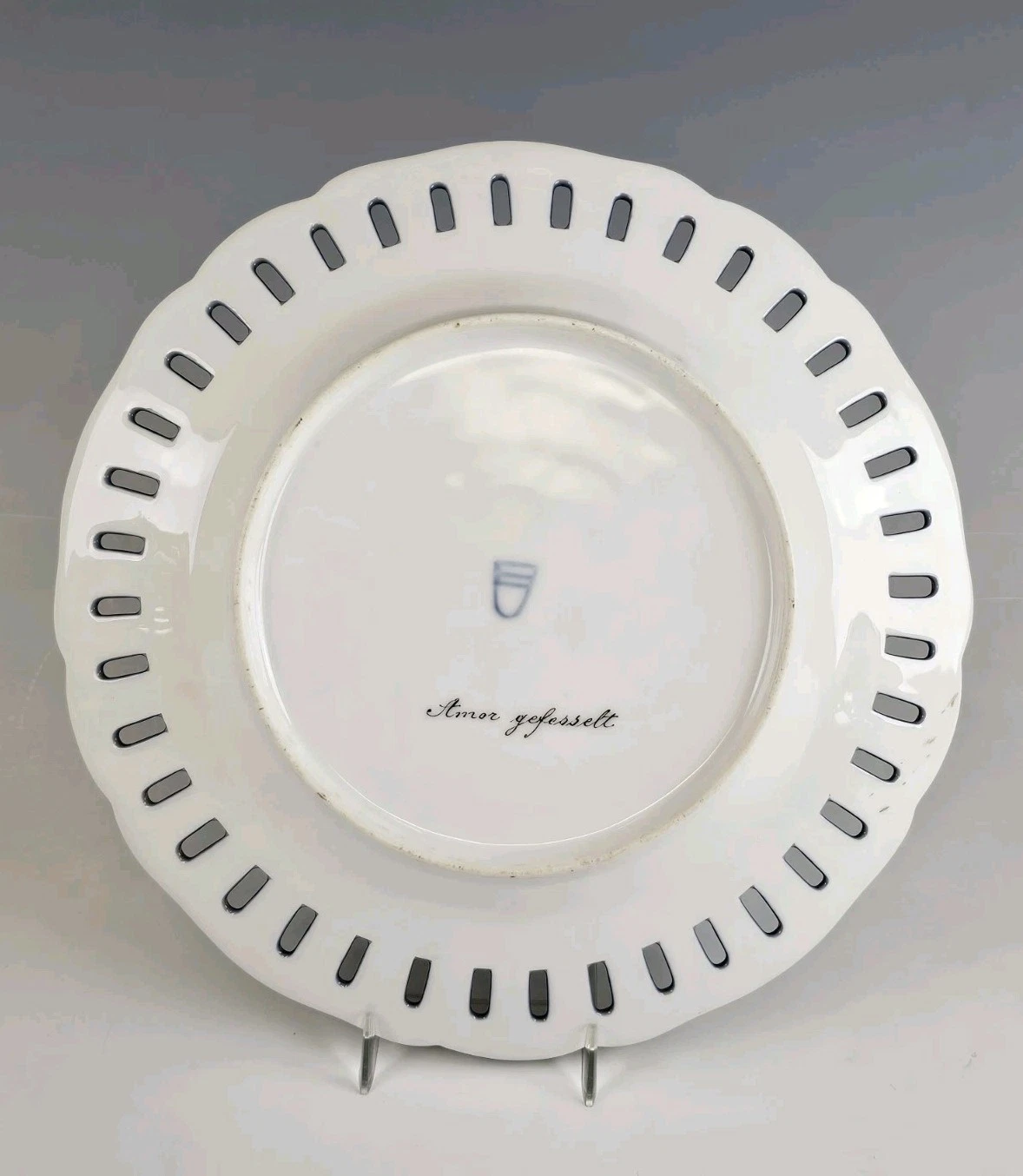 The back of each plate with underglaze Royal Vienna beehive mark and title.
