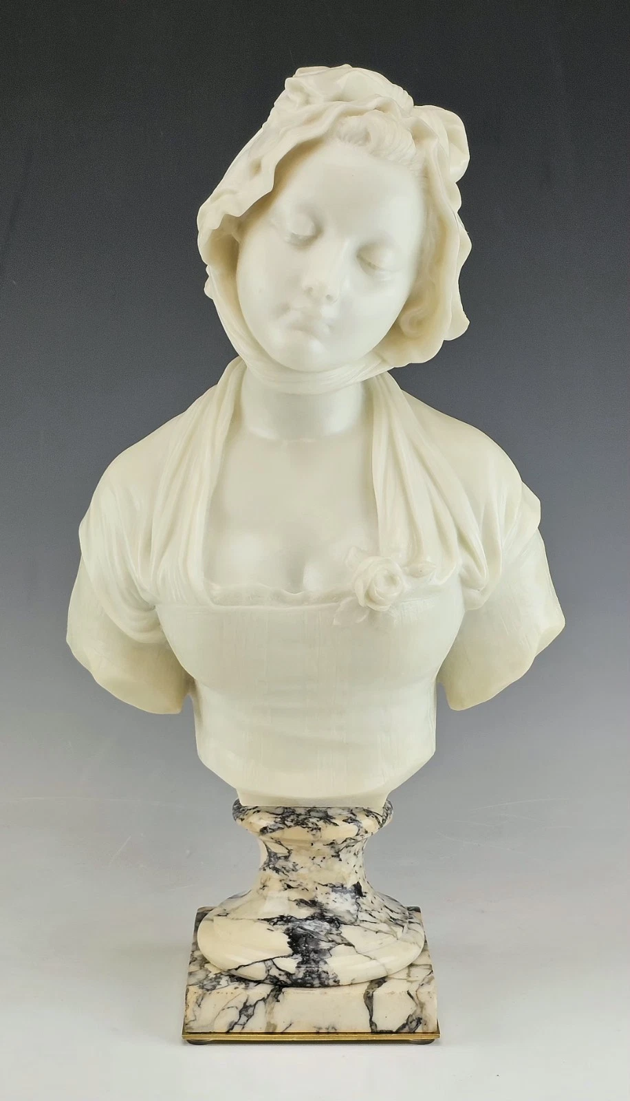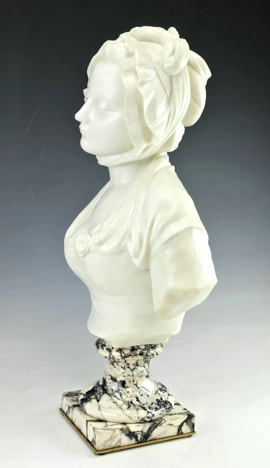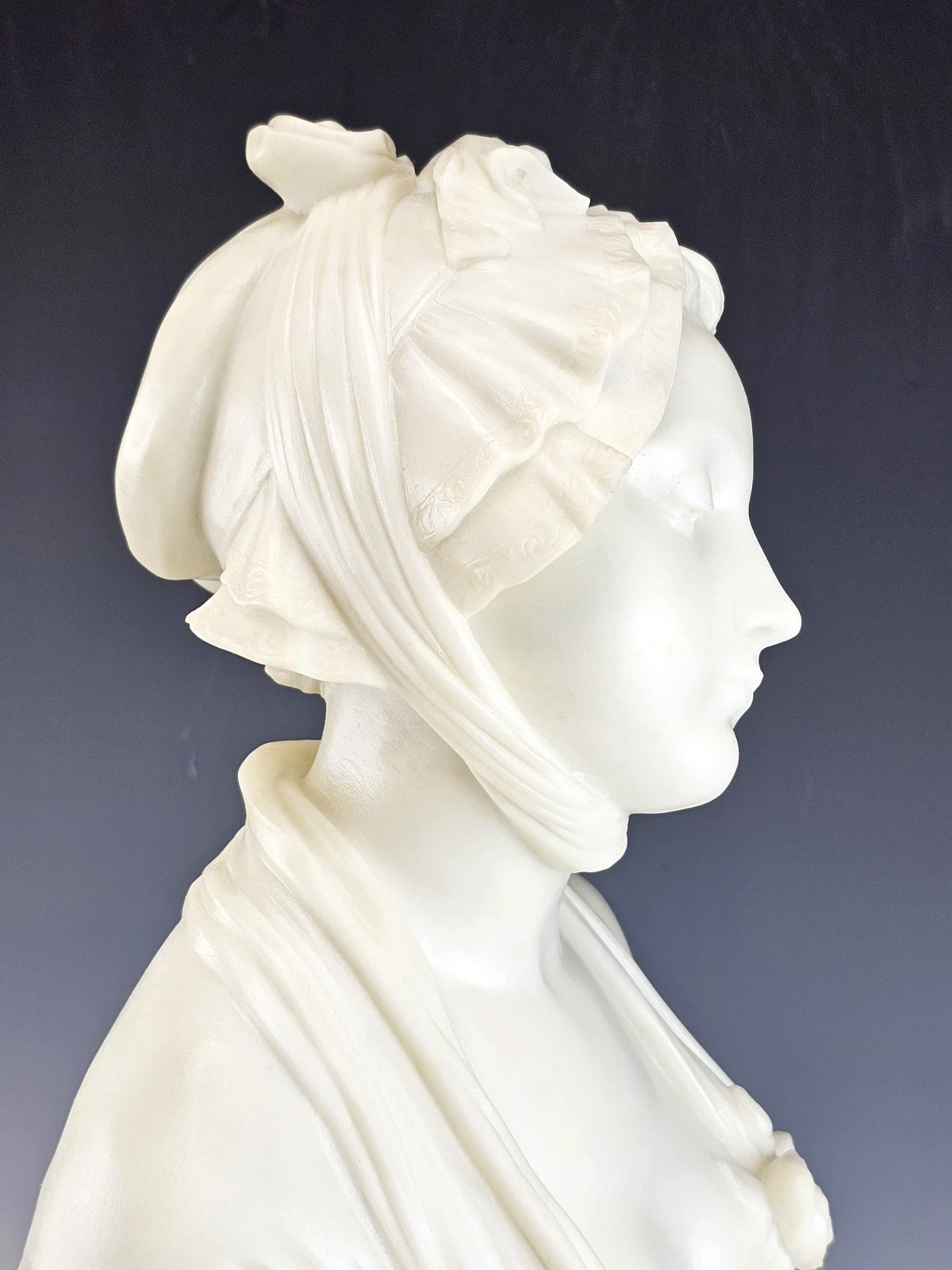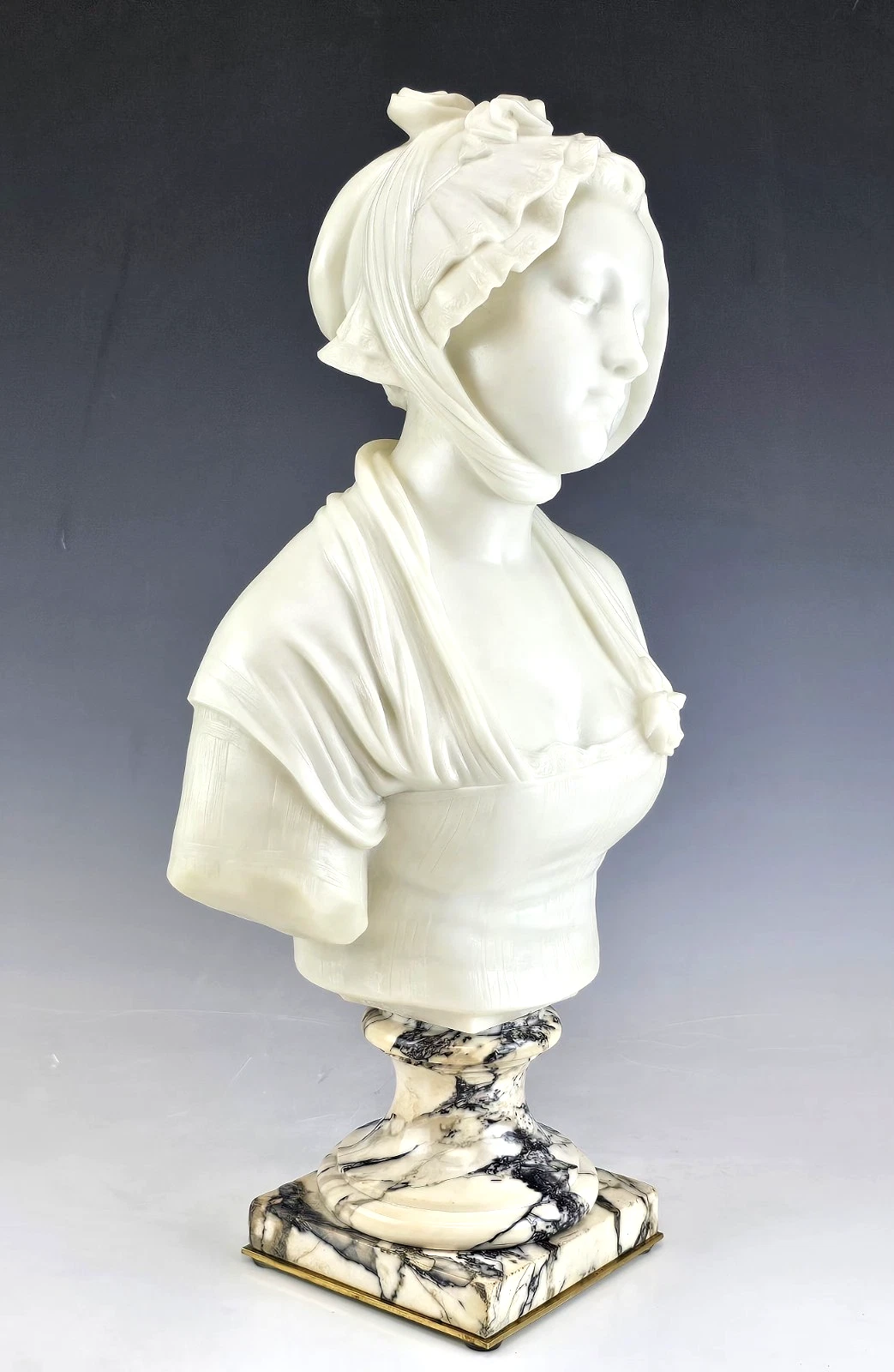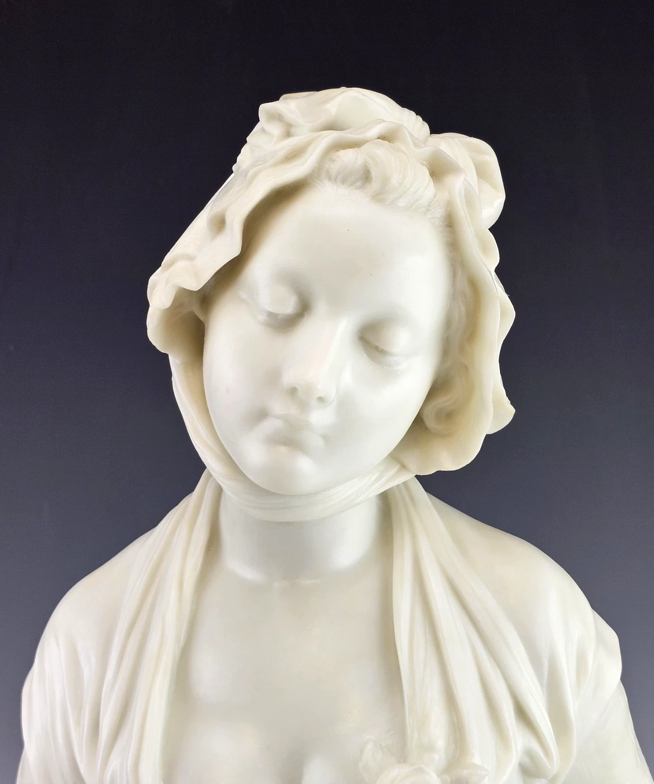 Beautiful 19th-century French White Carrara Marble Sculpture of young maiden wearing bonnet.
