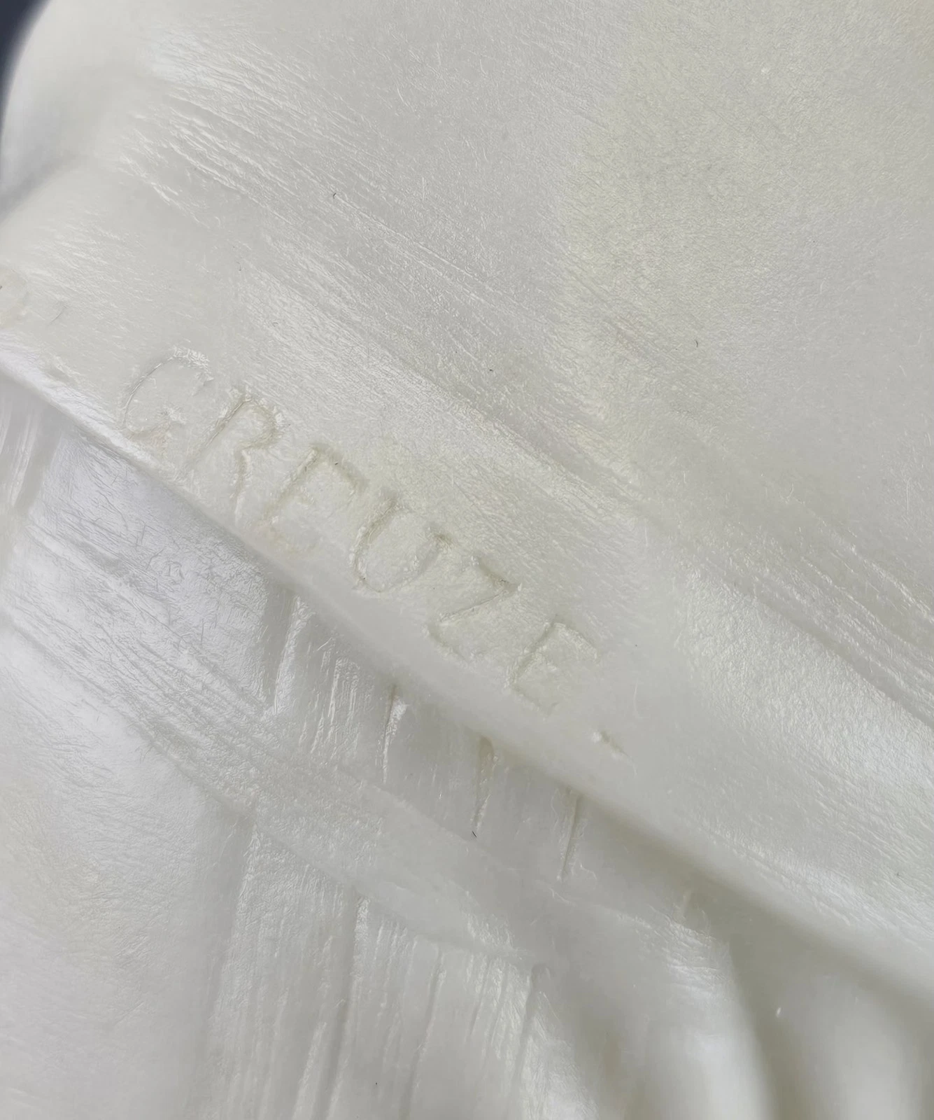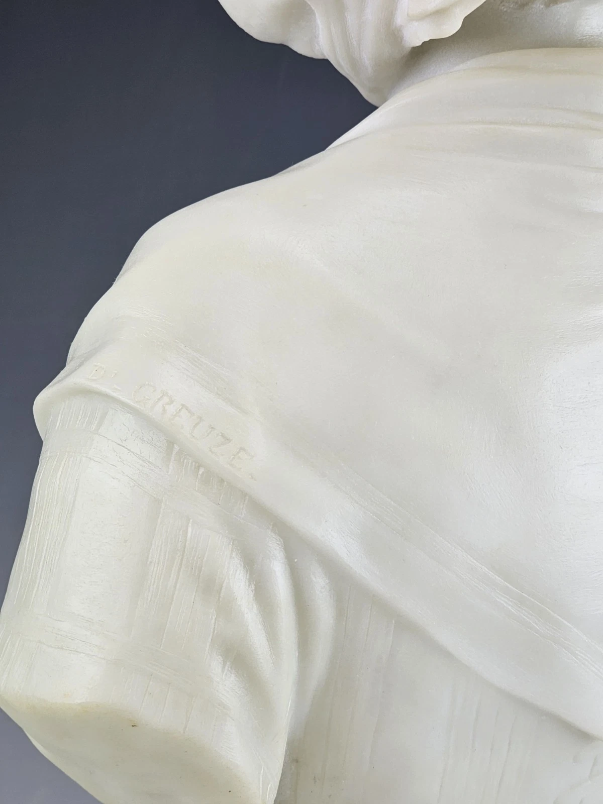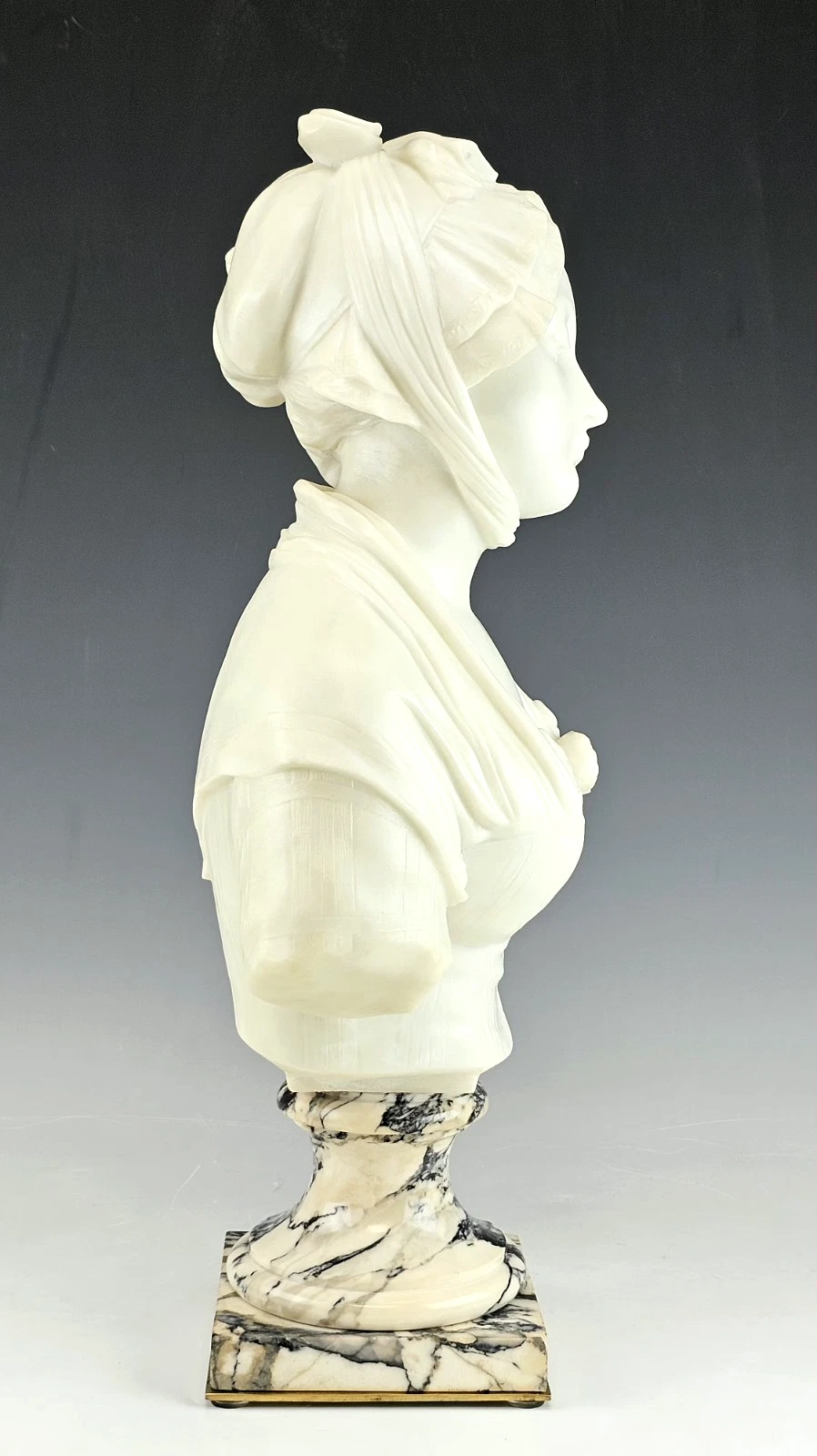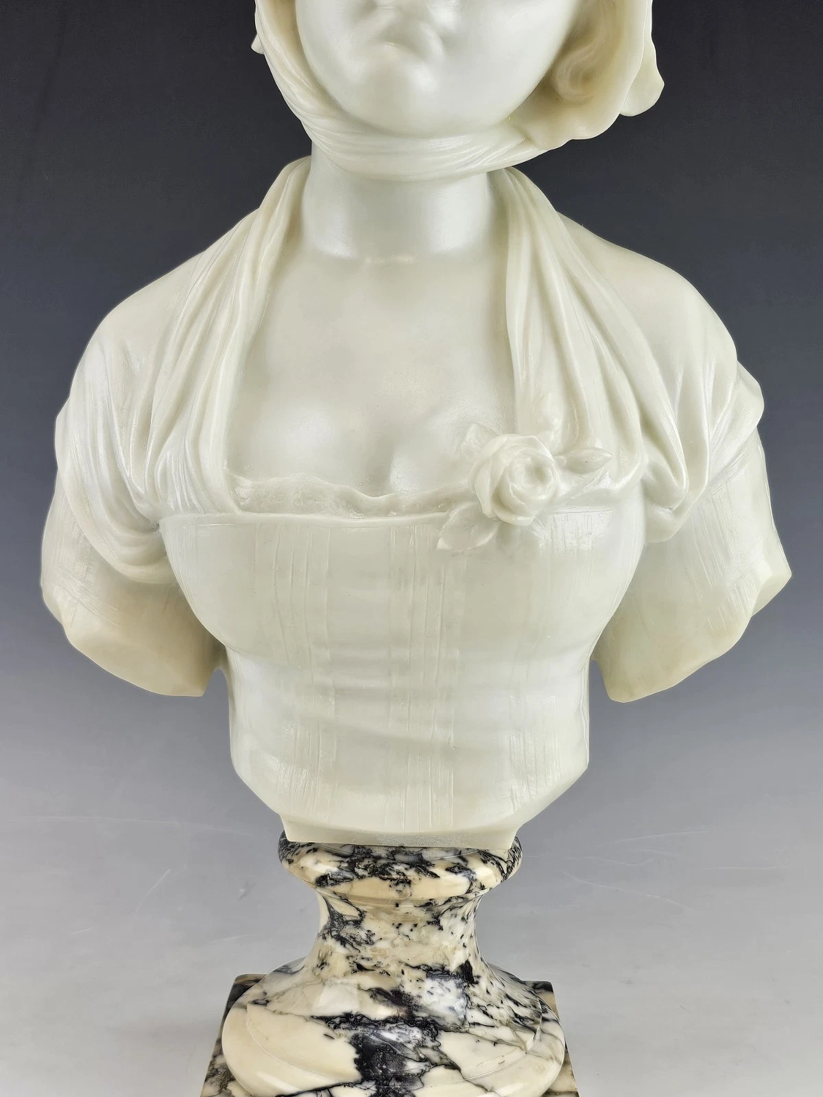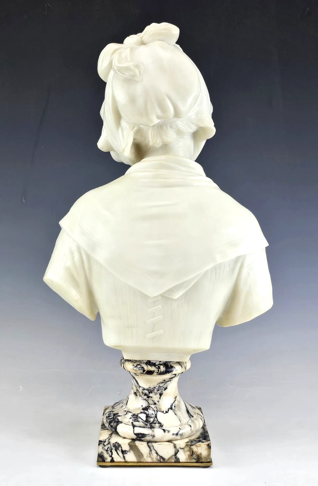 Beautiful 19th-century French White Carrara Marble Sculpture of young maiden wearing bonnet.