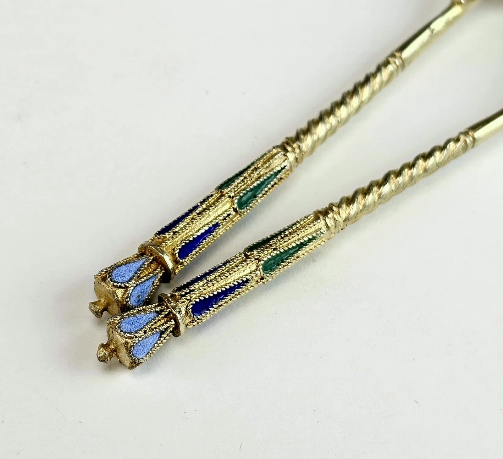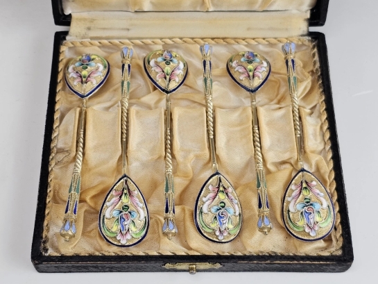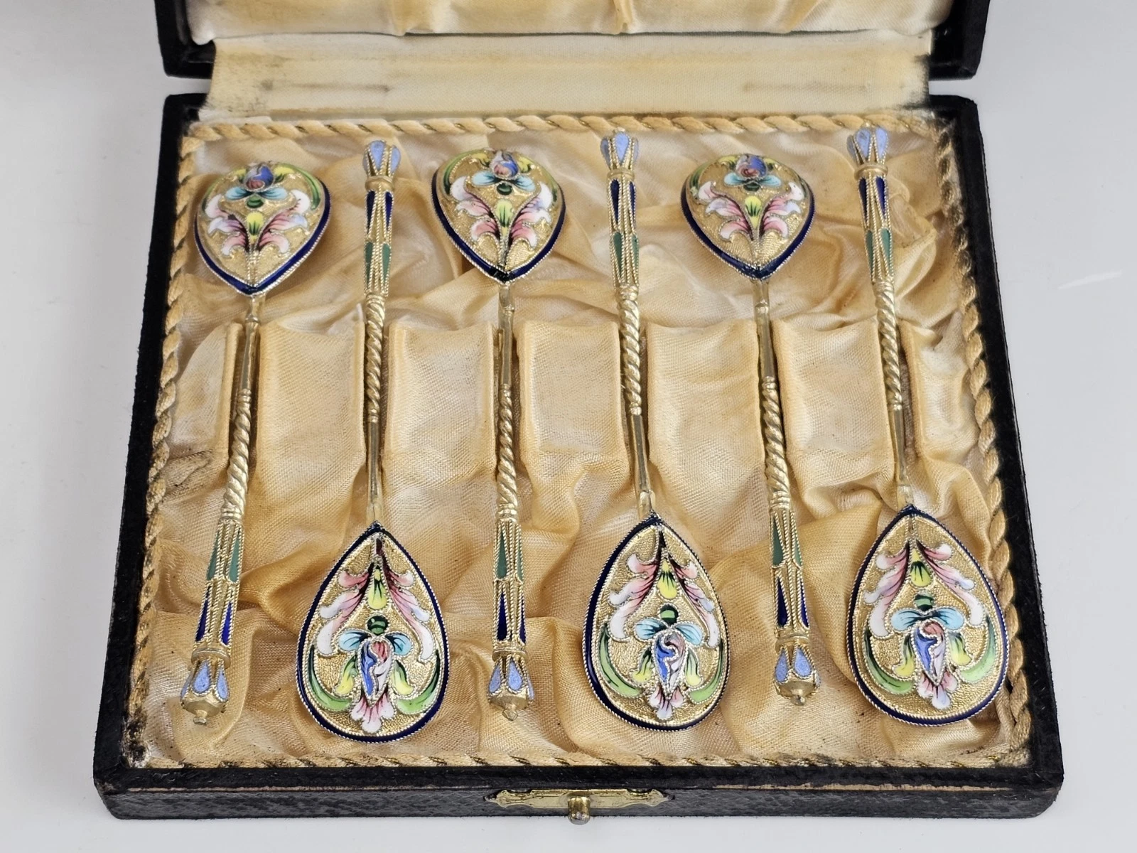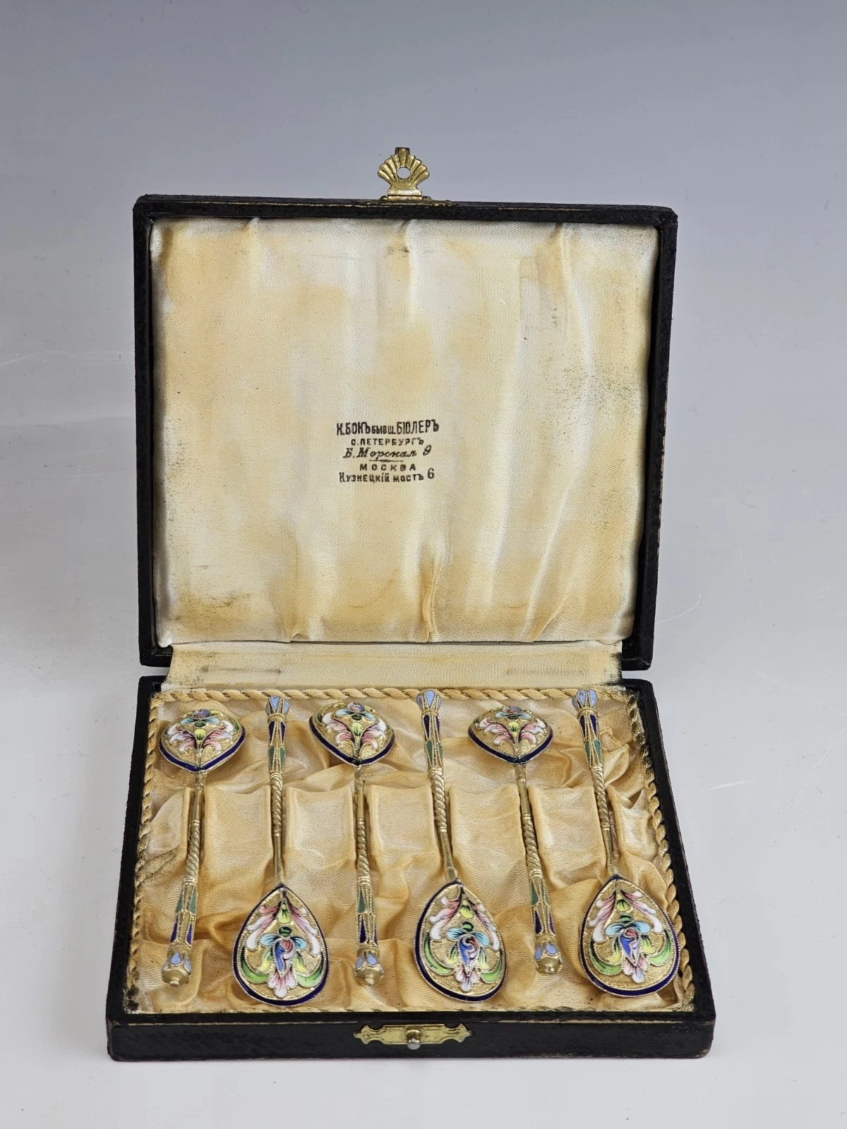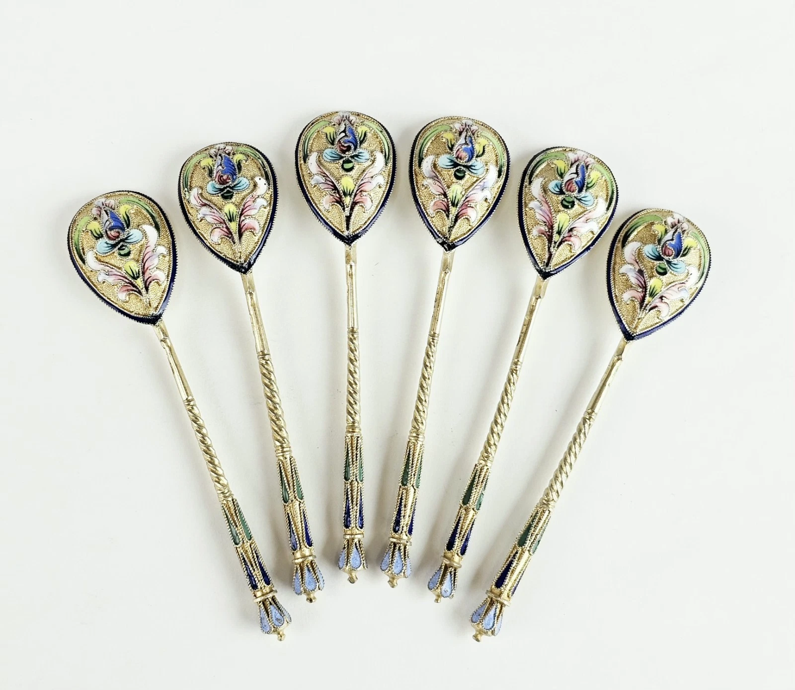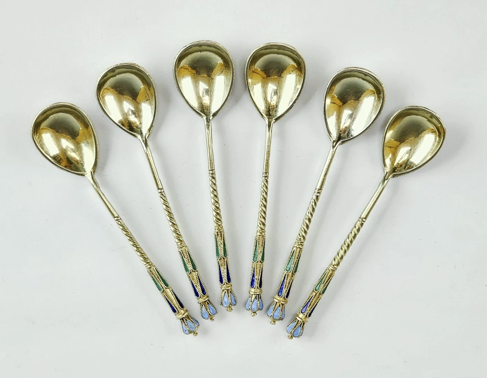 Fine 19th-century Russian Gilt Silver Shaded Enamel Set of Six Spoons.
