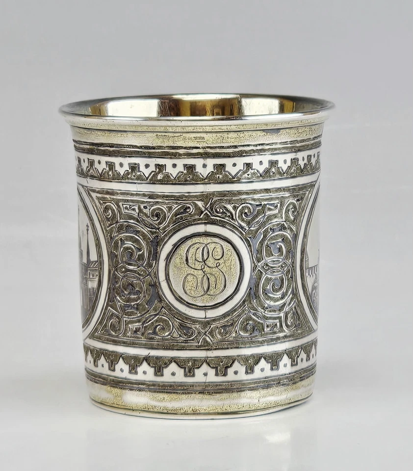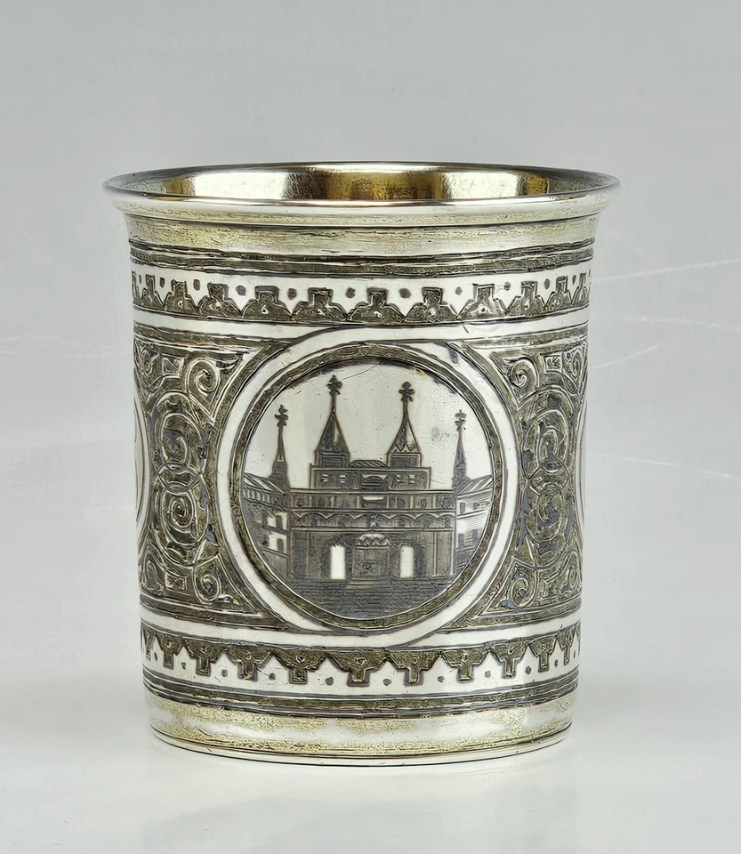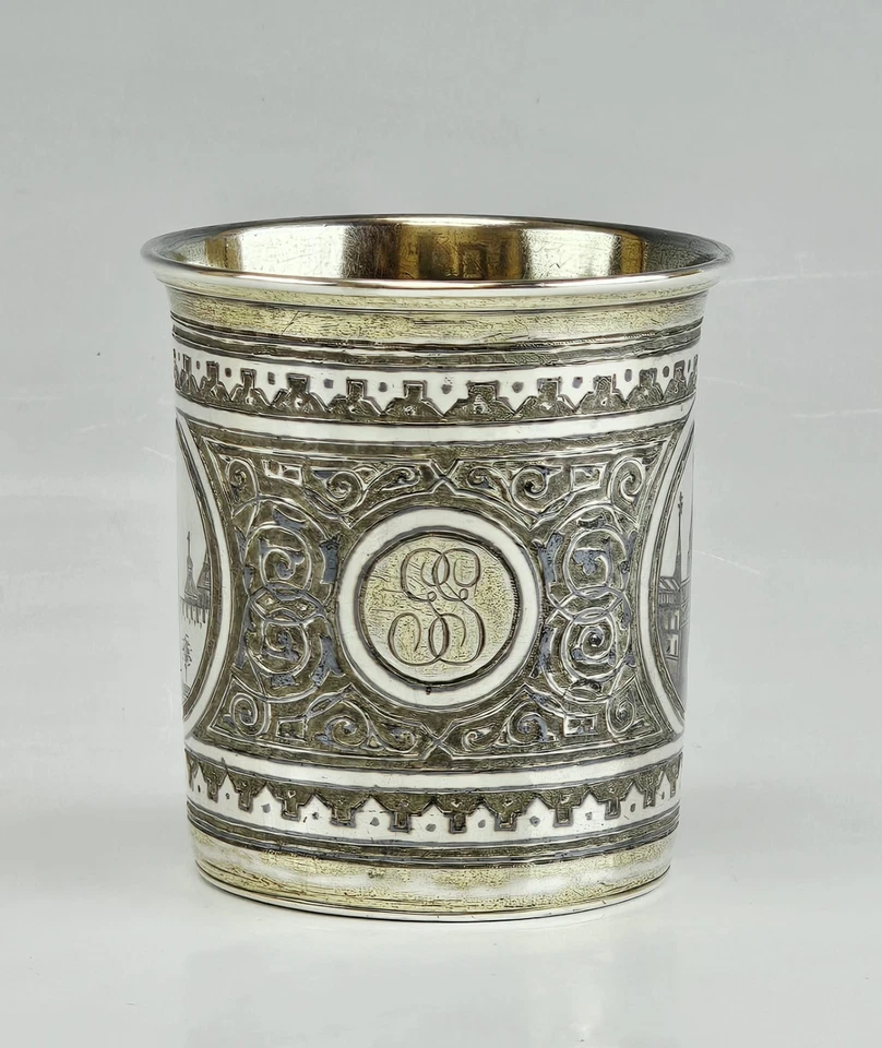 The body is decorated with niello architectural medallions depicting Russian church views, framed by scrolling niello ornament. The original gilt interior creates a striking contrast with the dark exterior decoration. A central monogrammed cartouche suggests a presentation or commemorative purpose.