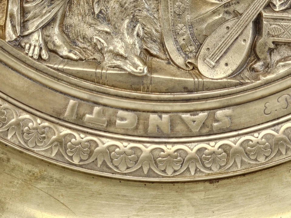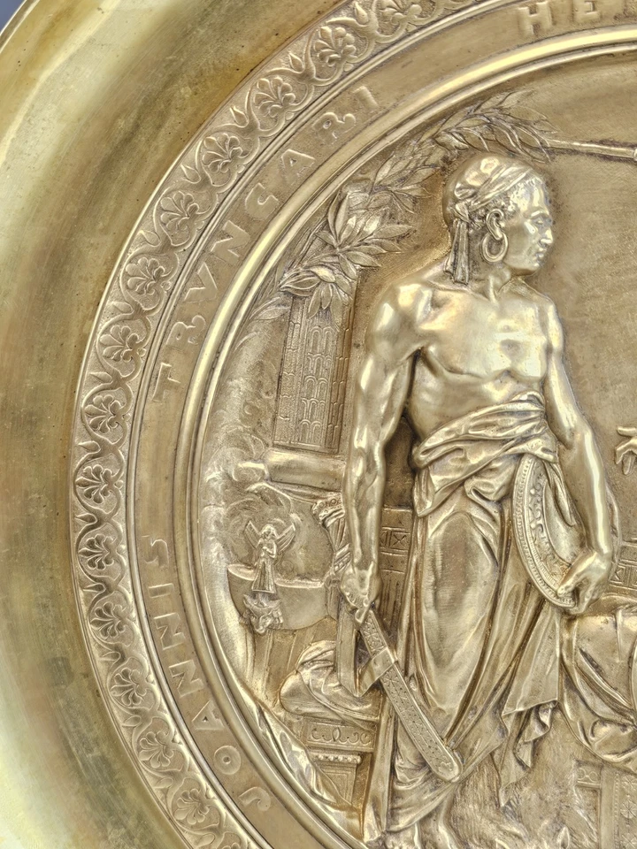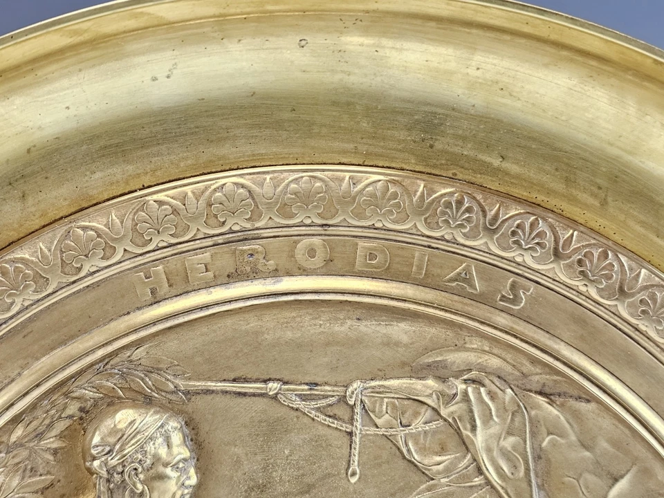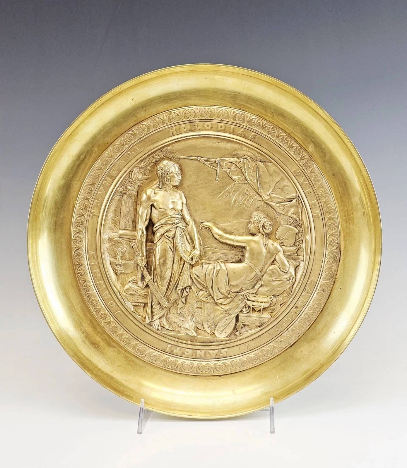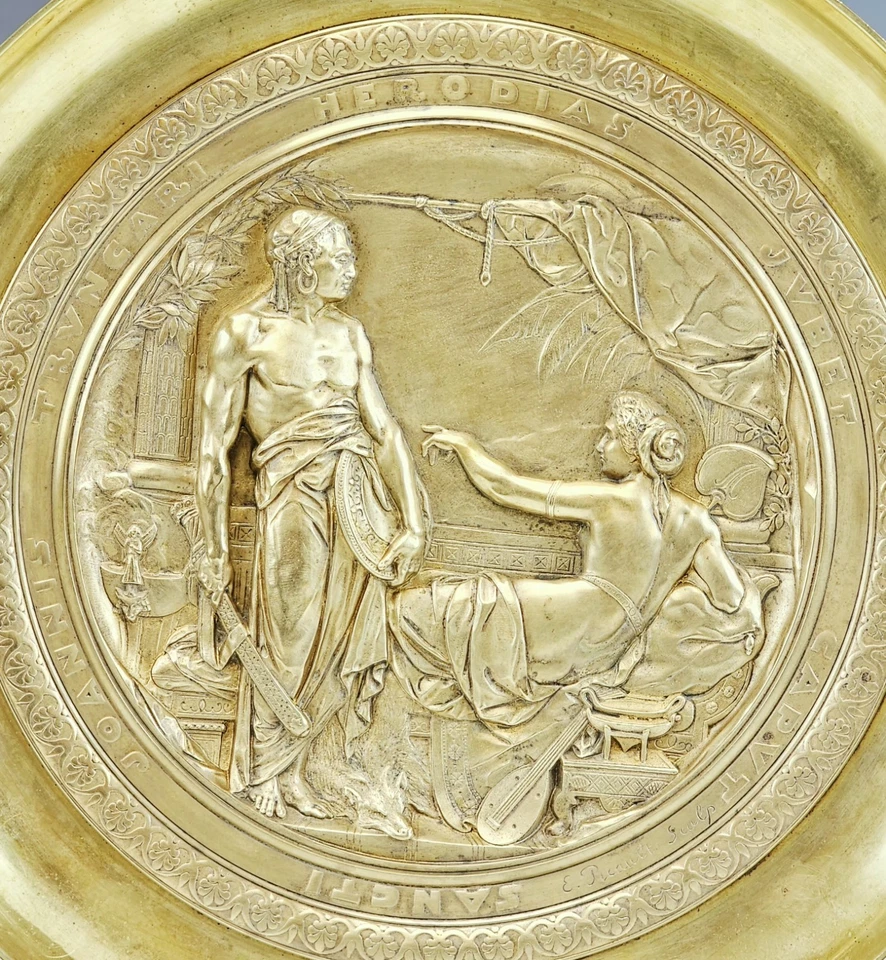 The central medallion is cast in high relief, depicting the biblical scene of Salome and the Head of Saint John the Baptist, encircled by the Latin inscription: