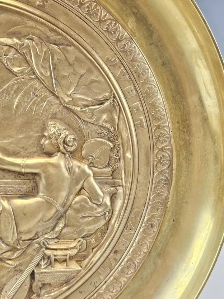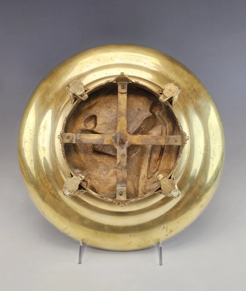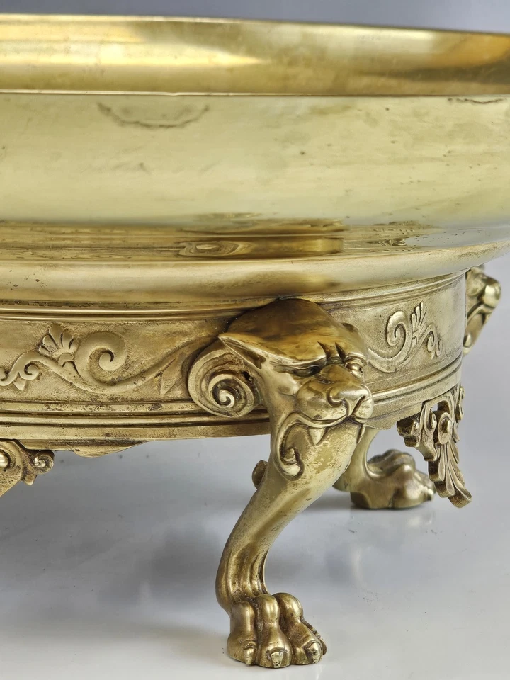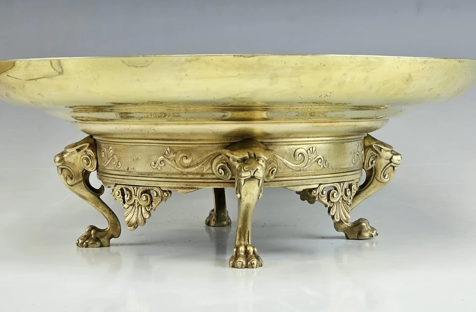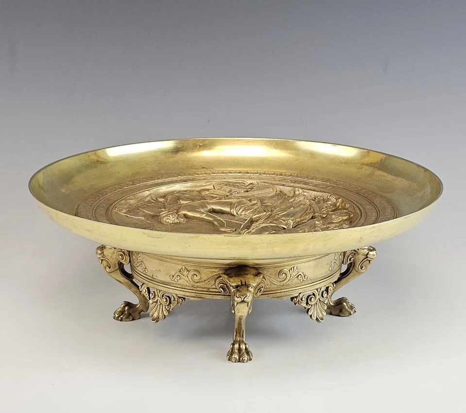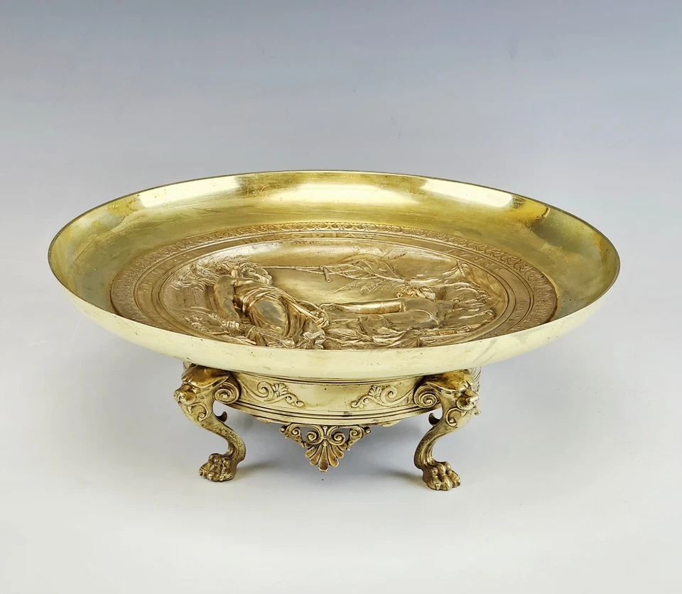 The composition is finely modeled, with strong attention to anatomy and drapery. The dish is framed by a classical frieze and raised on an ornate tripod base with stylized zoomorphic legs, creating a bold sculptural presence. The surface retains a rich gilt bronze patina.