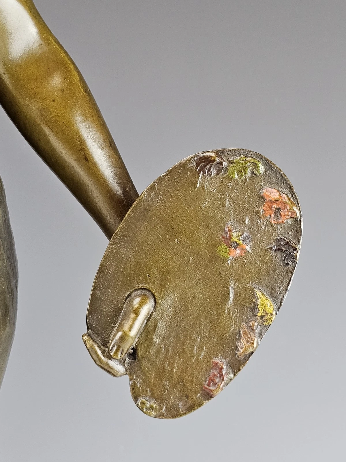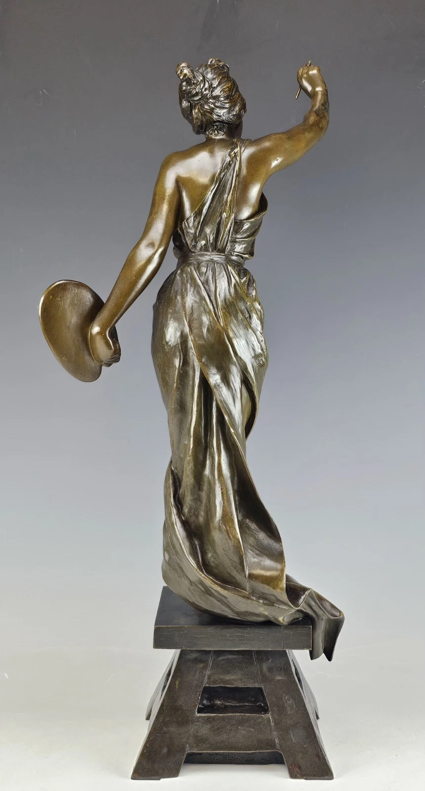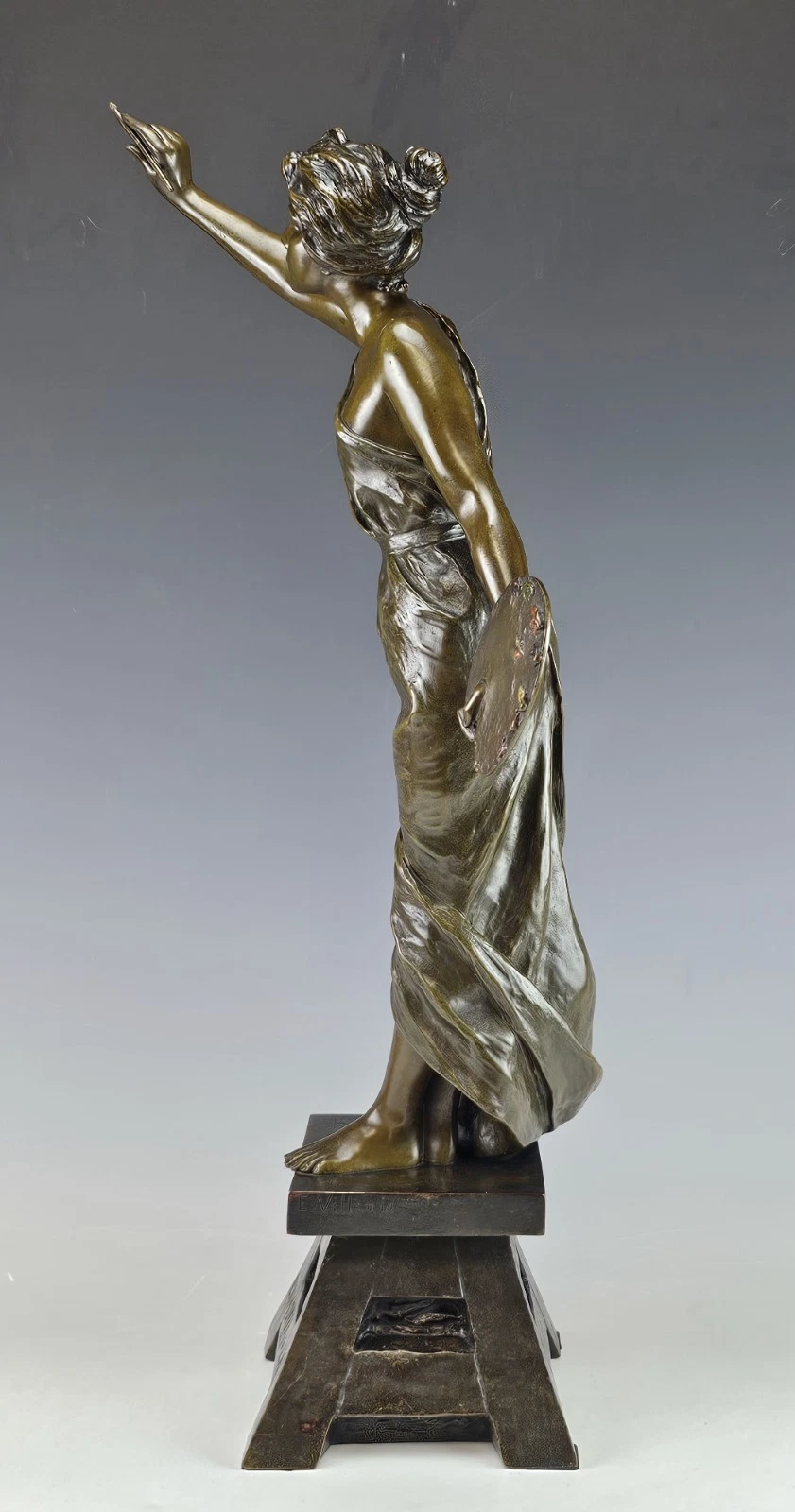 The sculpture is very fine casting with to tone patina depicting young woman arist holding the brush and palette.