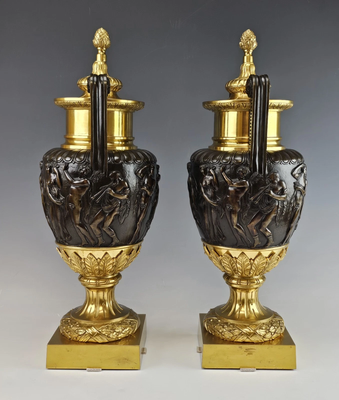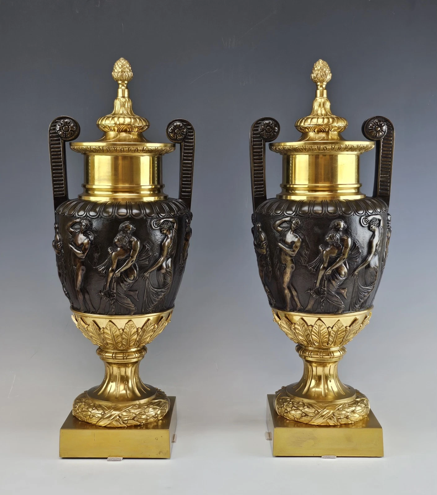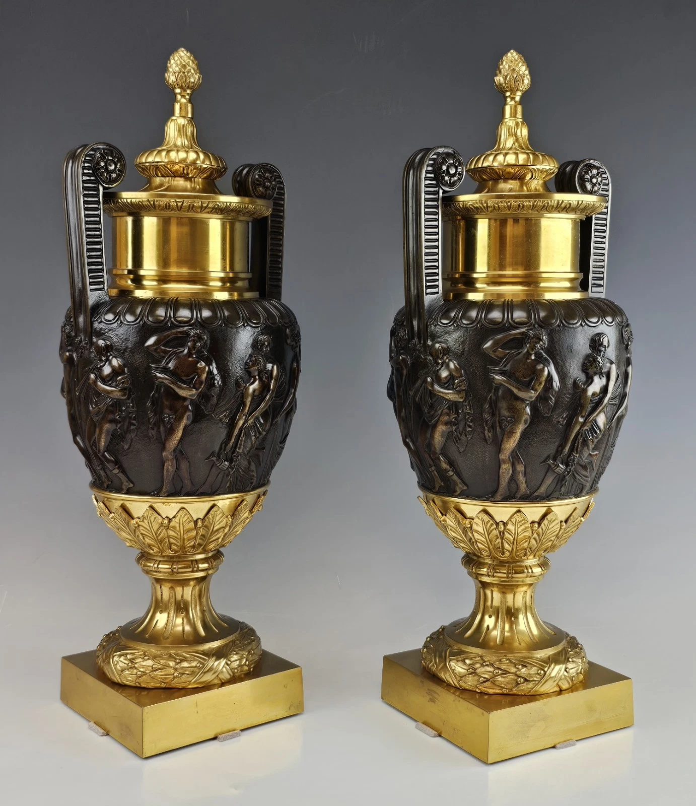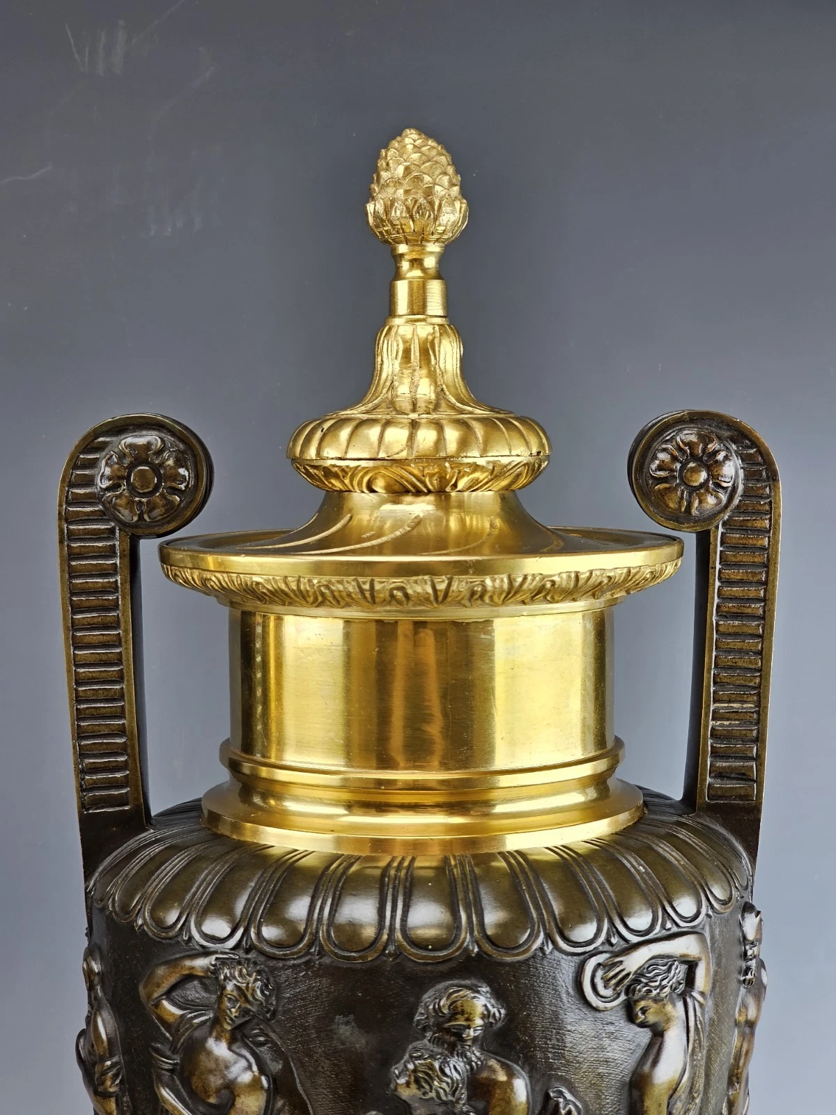 Large size urns casted with high relief Greco - Roman figures around the body. Twin roundish handles, gilt bronze square base adorned with acanthus leaf decoration. Gilt bronze round tops end with accorn style finial.
