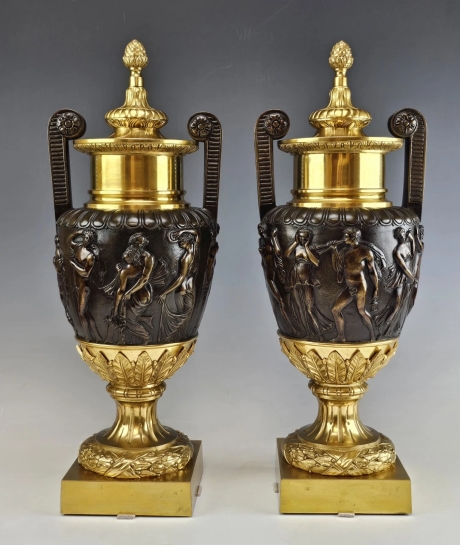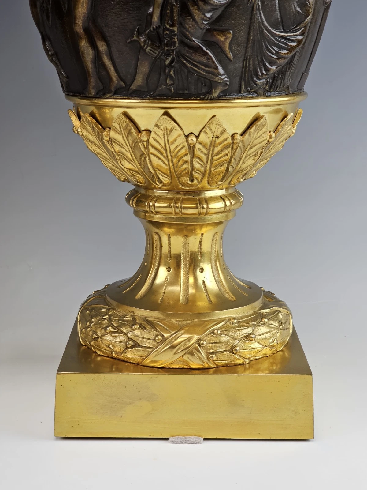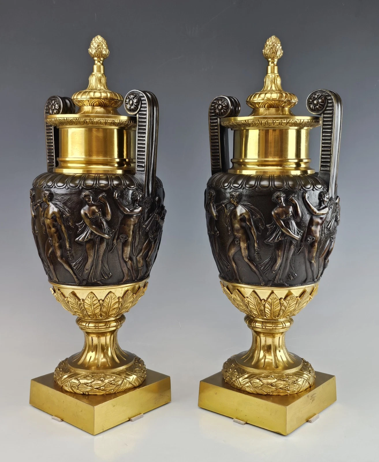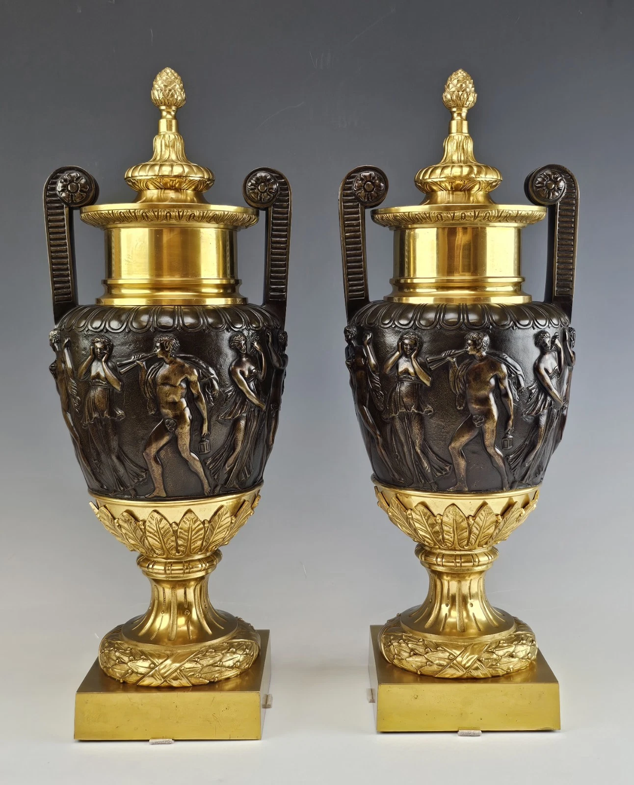 Large size urns casted with high relief Greco - Roman figures around the body. Twin roundish handles, gilt bronze square base adorned with acanthus leaf decoration. Gilt bronze round tops end with accorn style finial.