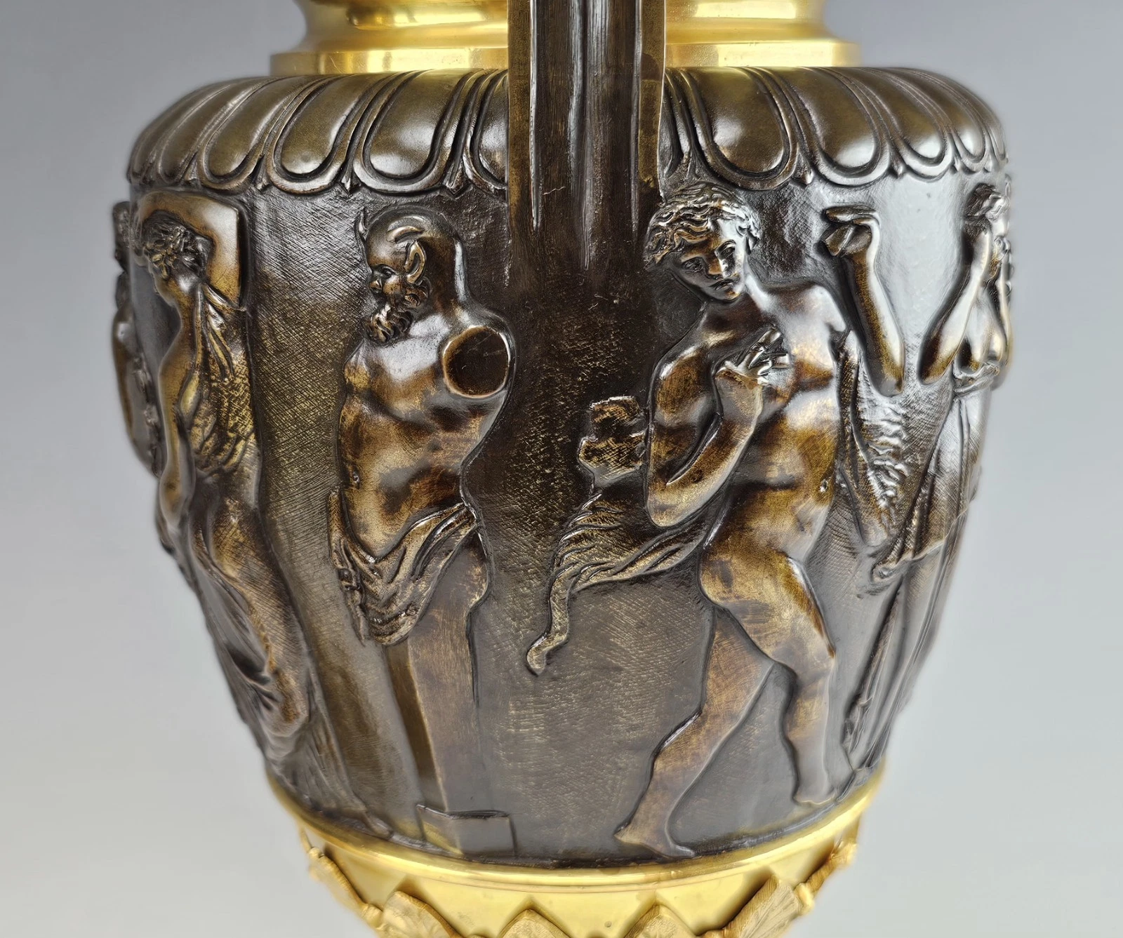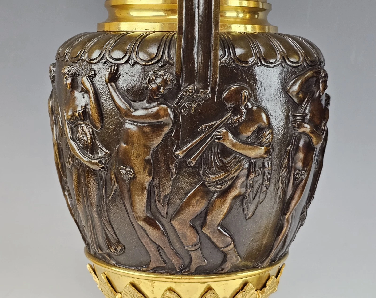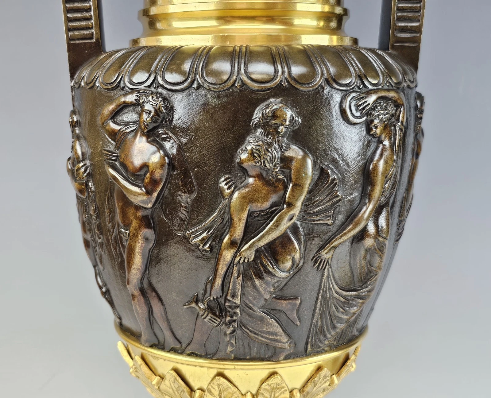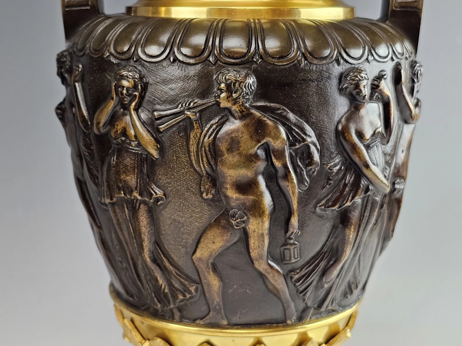 Large size urns casted with high relief Greco - Roman figures around the body. Twin roundish handles, gilt bronze square base adorned with acanthus leaf decoration. Gilt bronze round tops end with accorn style finial.