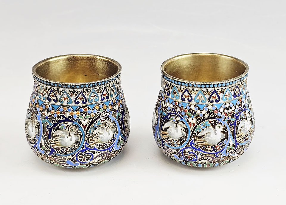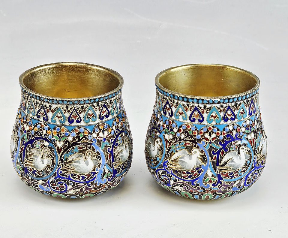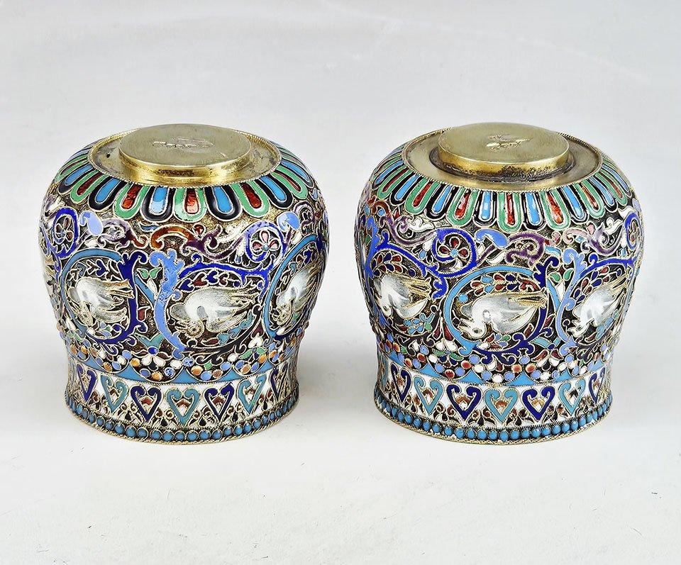 A fine pair of Imperial Russian silver-gilt cloisonné enamel Nevalyashka (rocking shot cups), richly decorated with vibrant polychrome cloisonné enamel in turquoise, cobalt blue, green, red, and white with intricate scrolling foliate ornament. Each cup features medallions depicting swans within elaborate enamel frames and decorative geometric borders. The interiors retain their original fire-gilded finish.