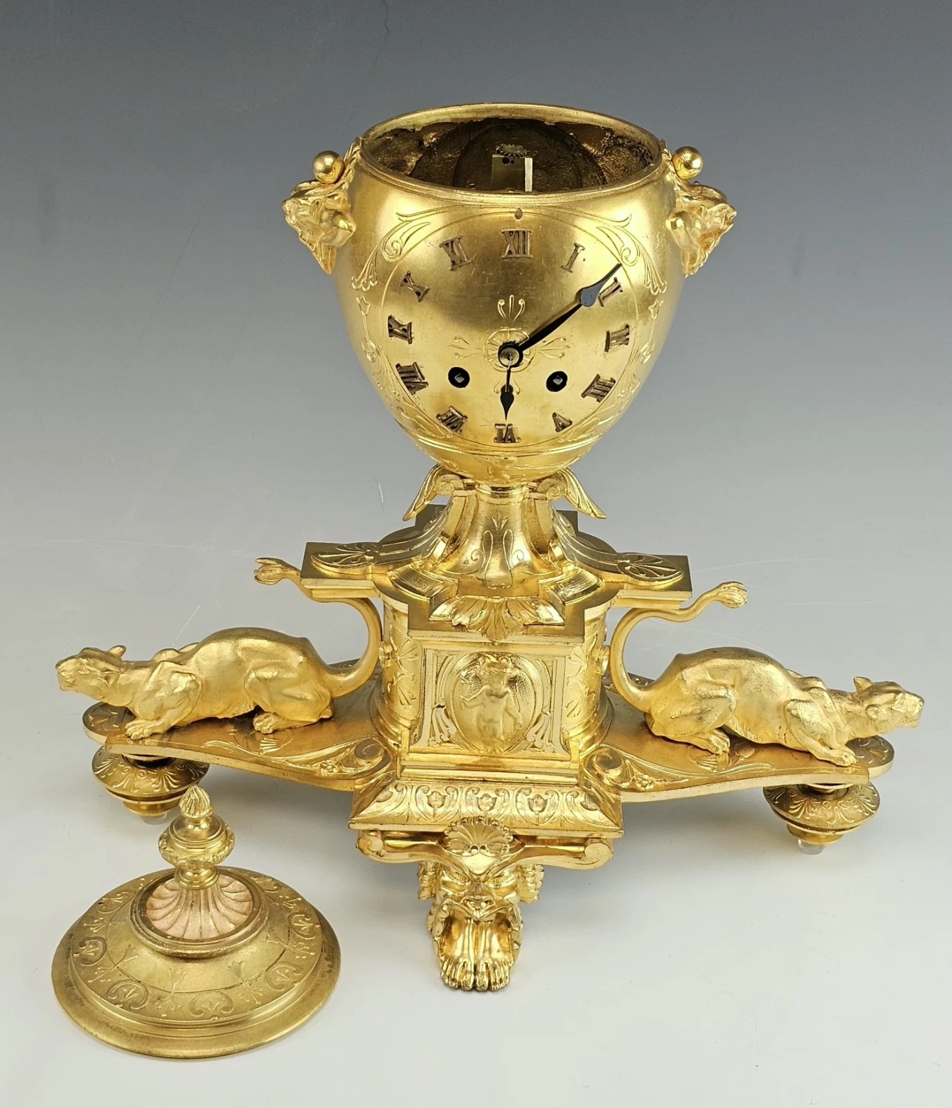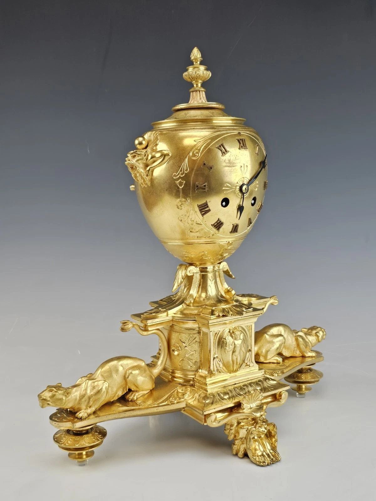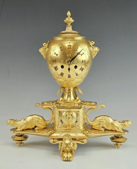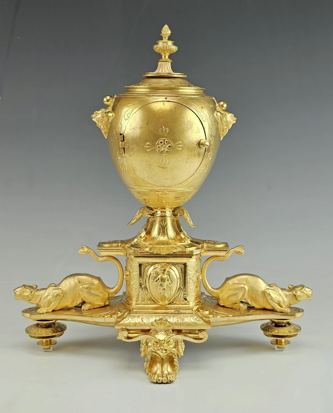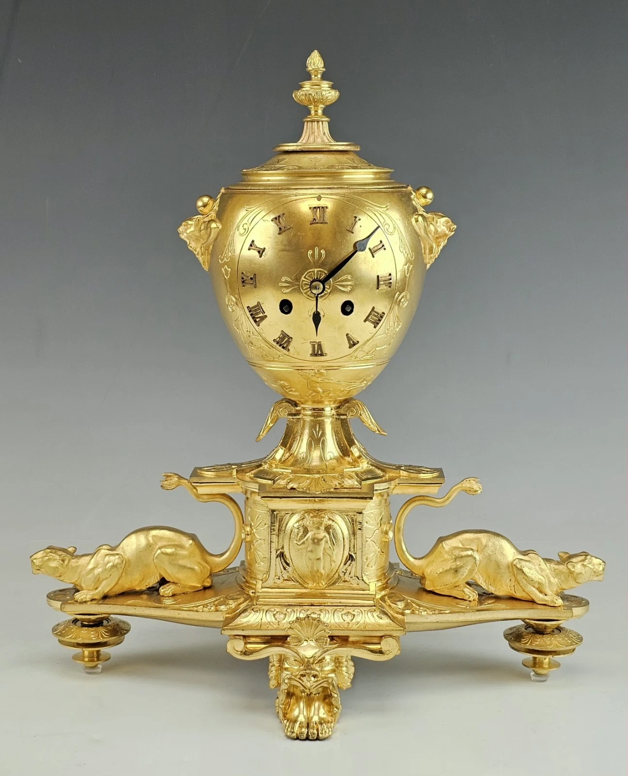 The clock stands on four ornate feet, including a prominent front and back paw - form support in Empire Revival aesthetic.
