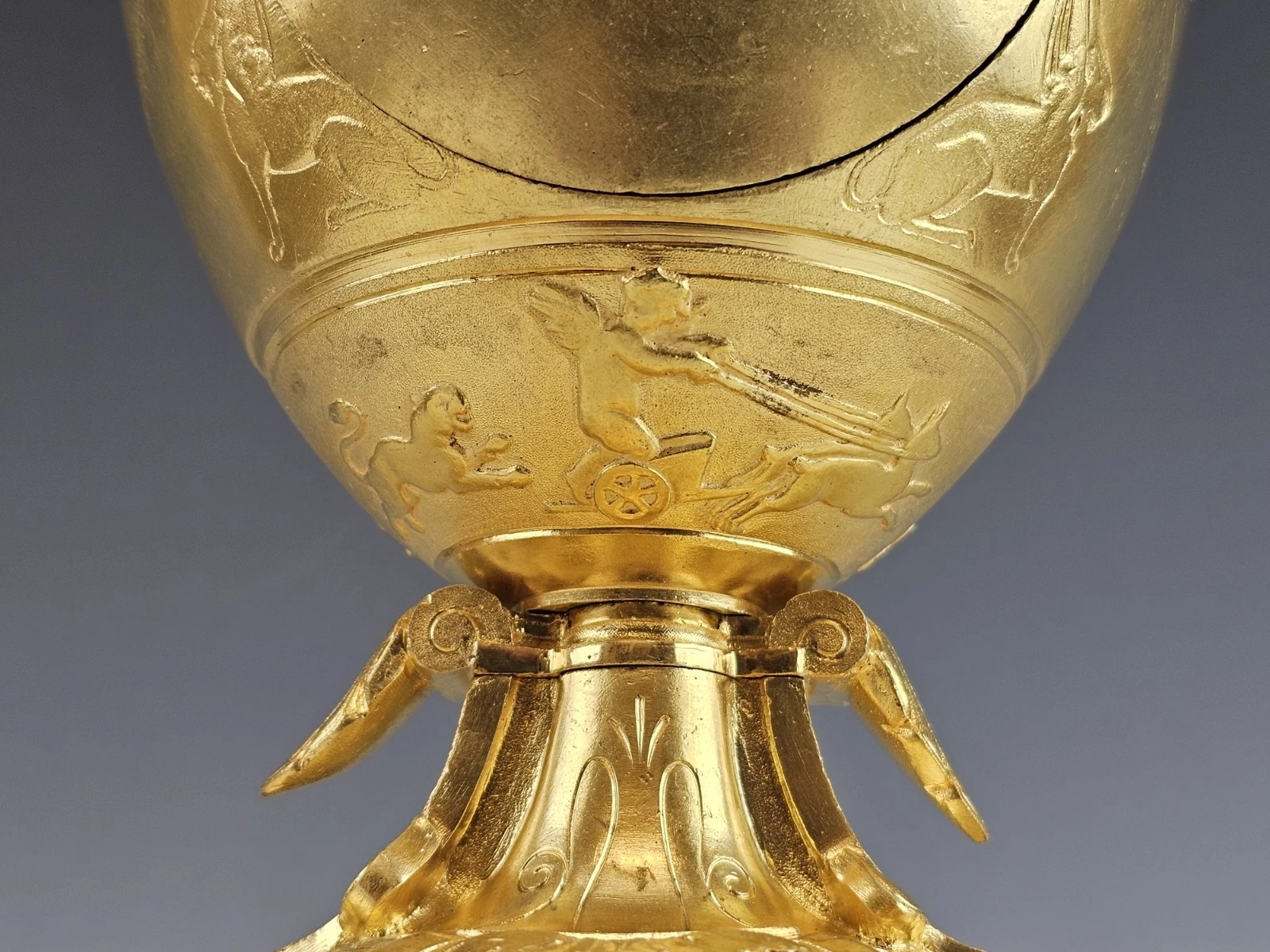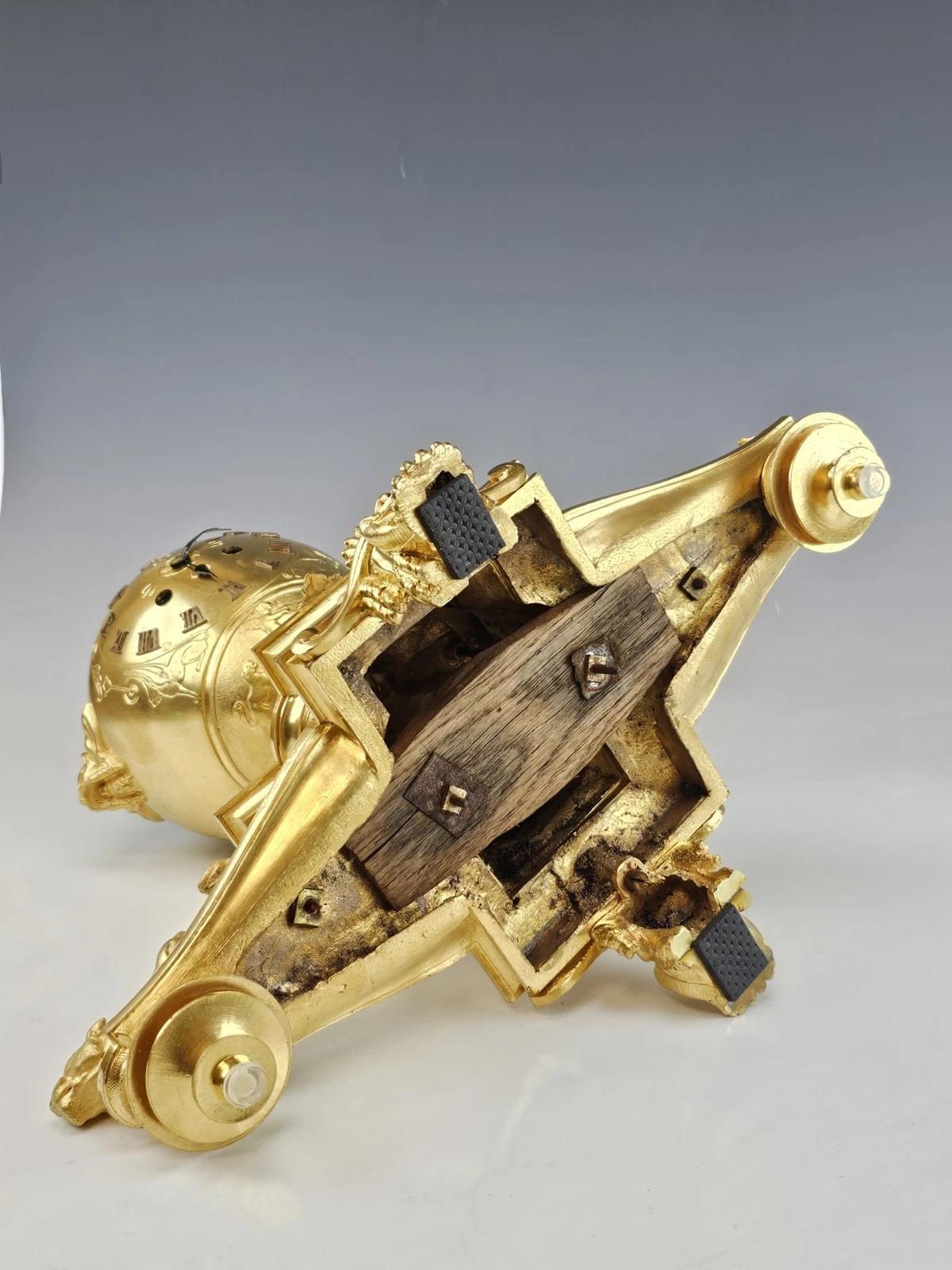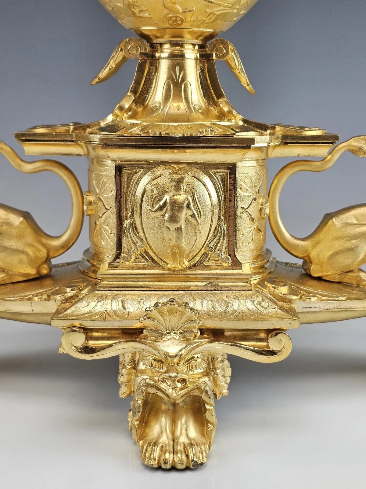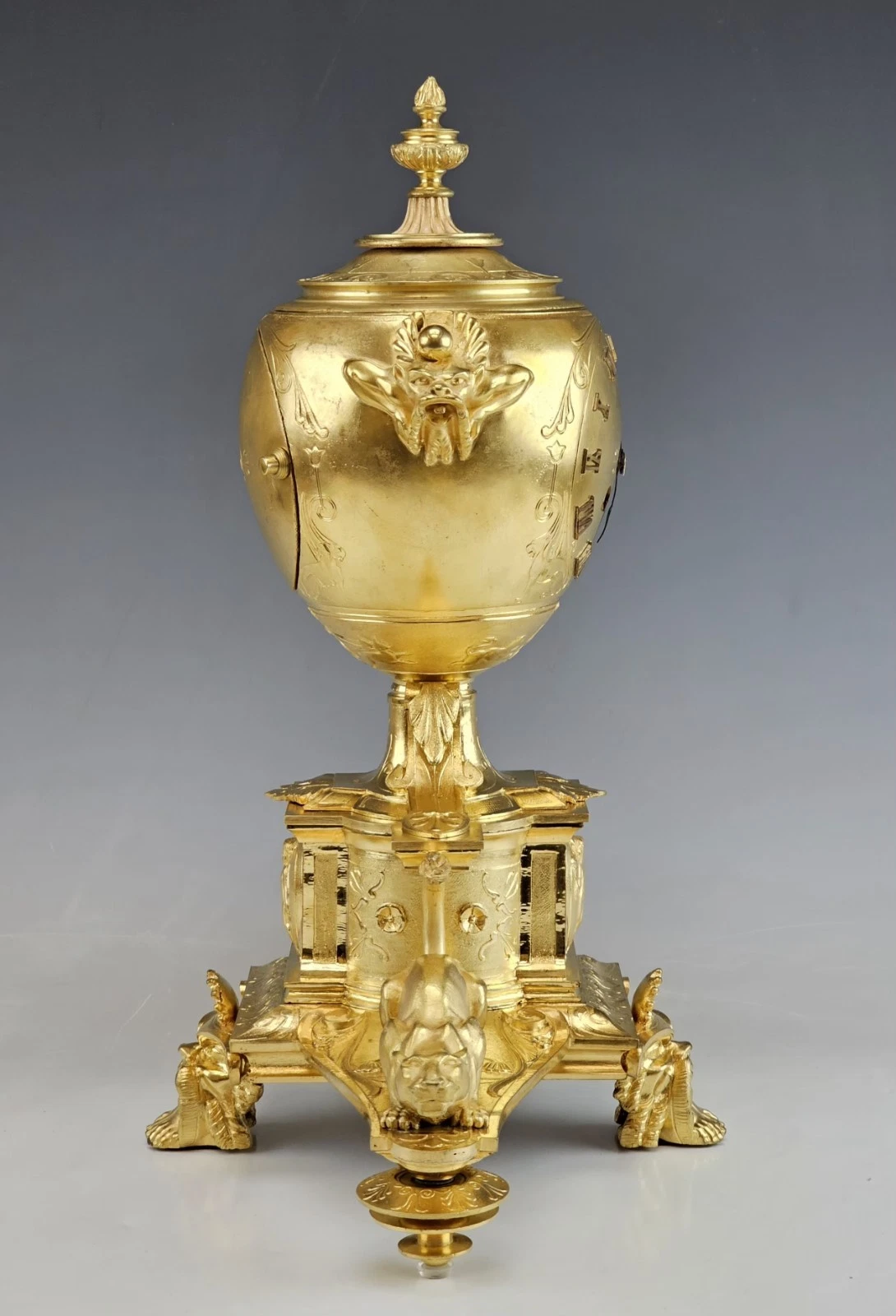 The clock stands on four ornate feet, including a prominent front and back paw - form support in Empire Revival aesthetic.