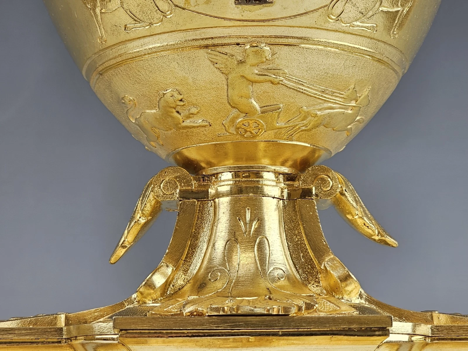 The square plinth features a finely cast oval relief medallion depicting a classical winged putto, framed withing a laurel cartouche.