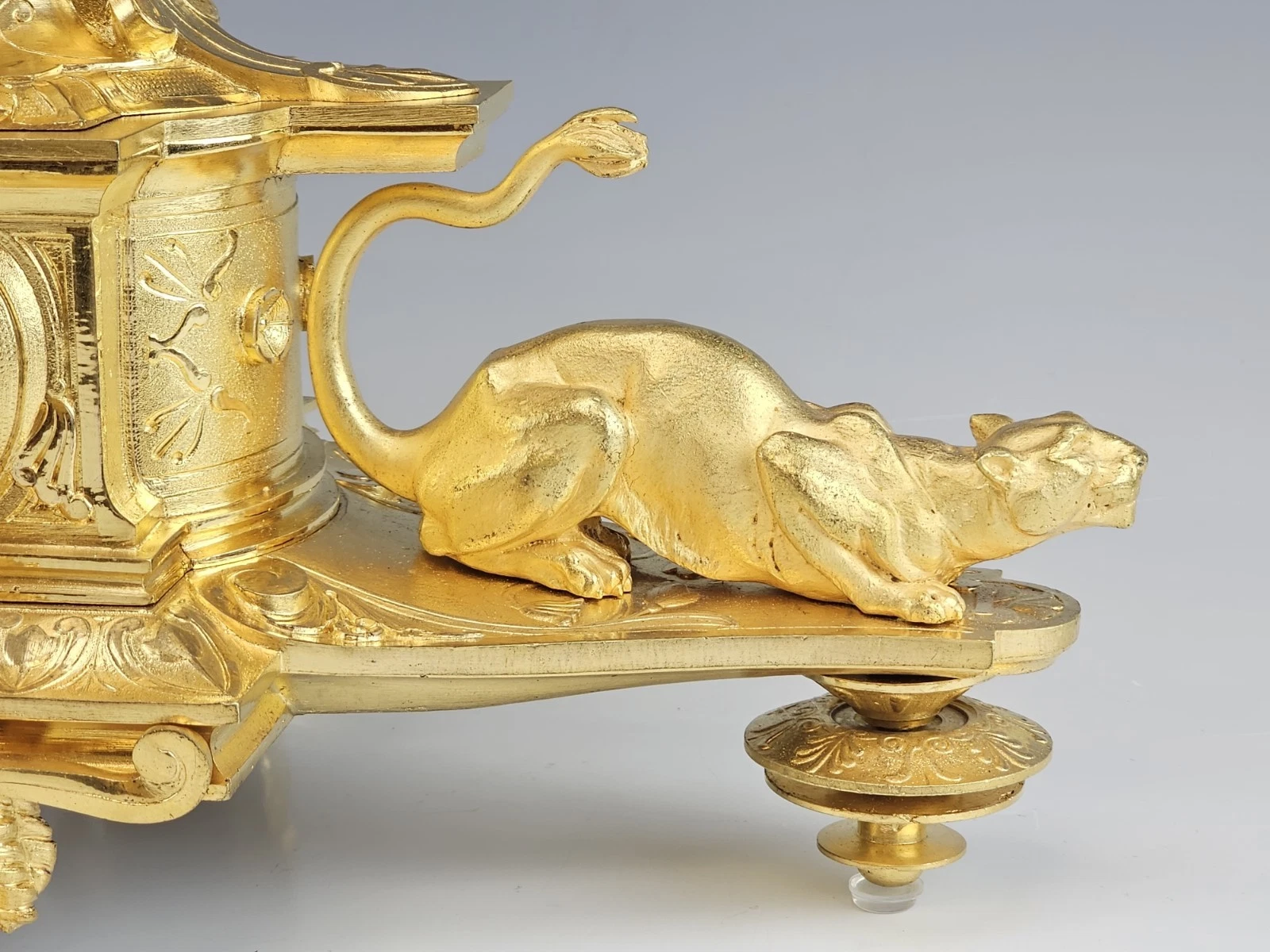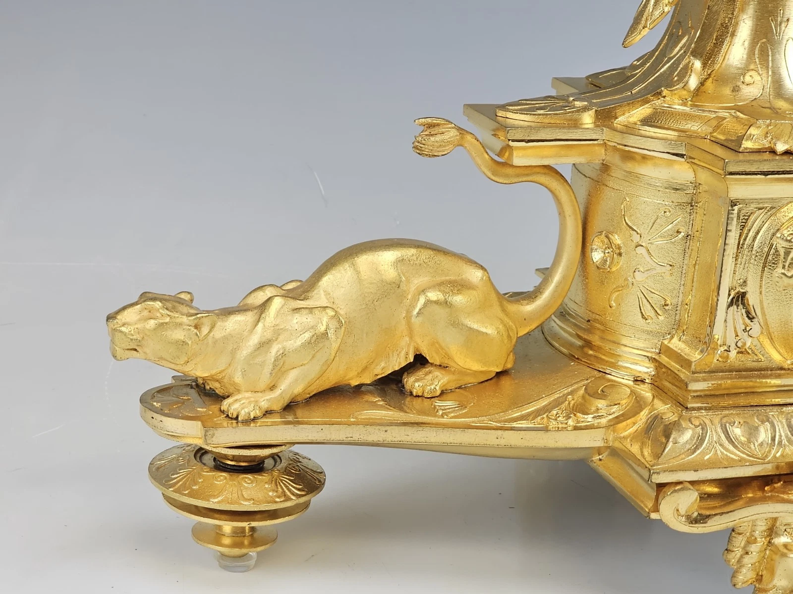 Most distinctive are the sculptural reclining animal figures of panthers positioned symmetrically on either side of the base platform. Both panthers in matte and burnished gilding.