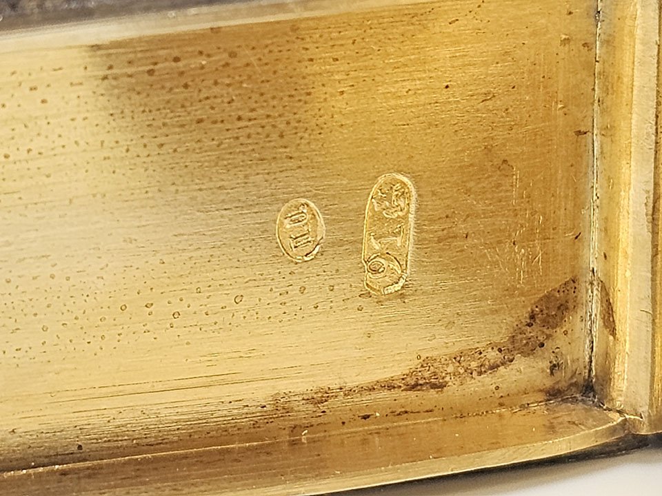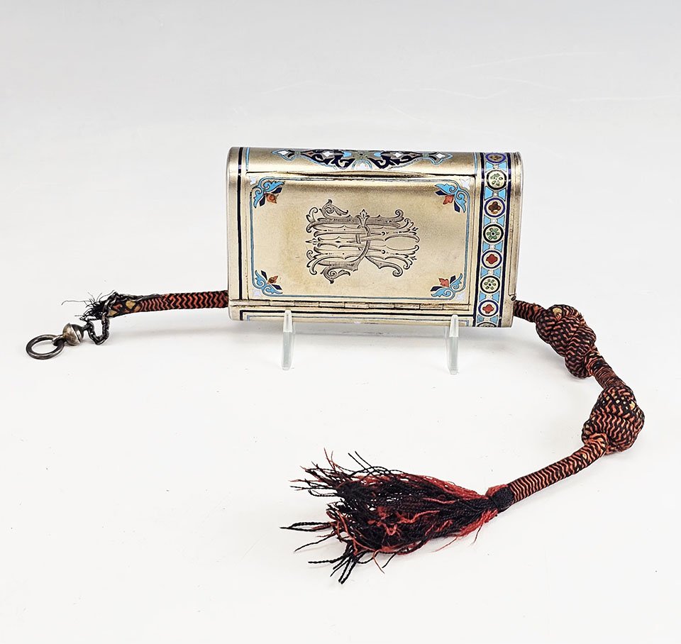 The rectangular case features engraved decoration, a fire-gilded interior, and retains its original silk cord attachment.