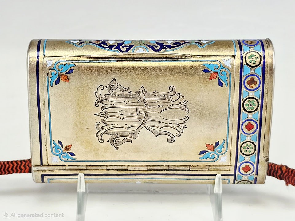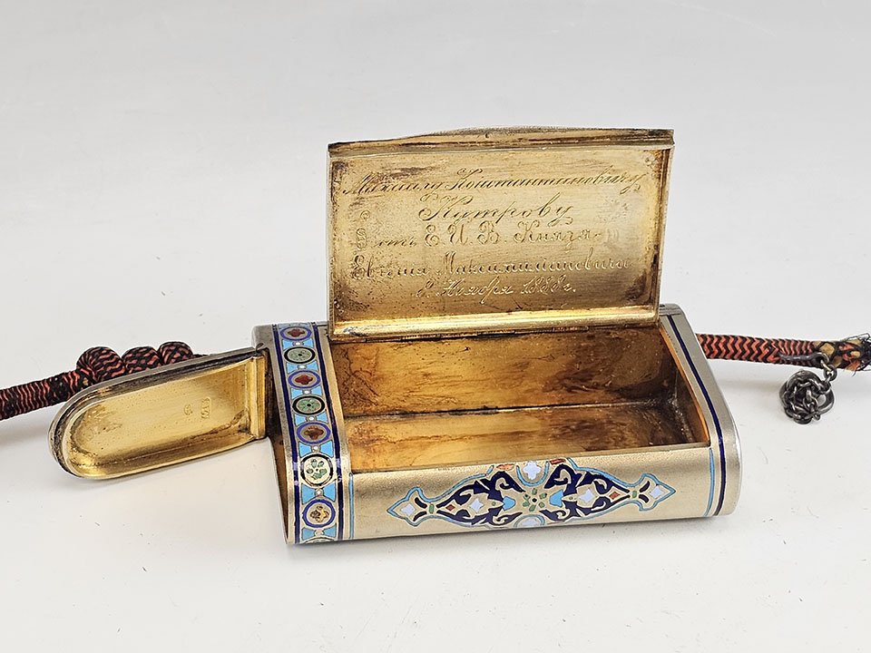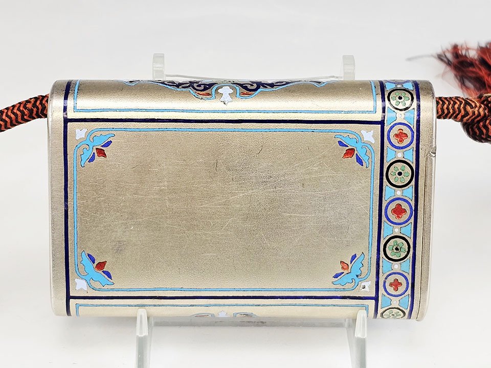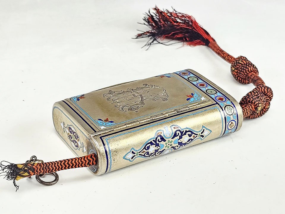 Superb Imperial Russian silver cigarette case with integrated match safe, finely decorated with champlevé enamel in multiple shades with elegant foliate ornament.