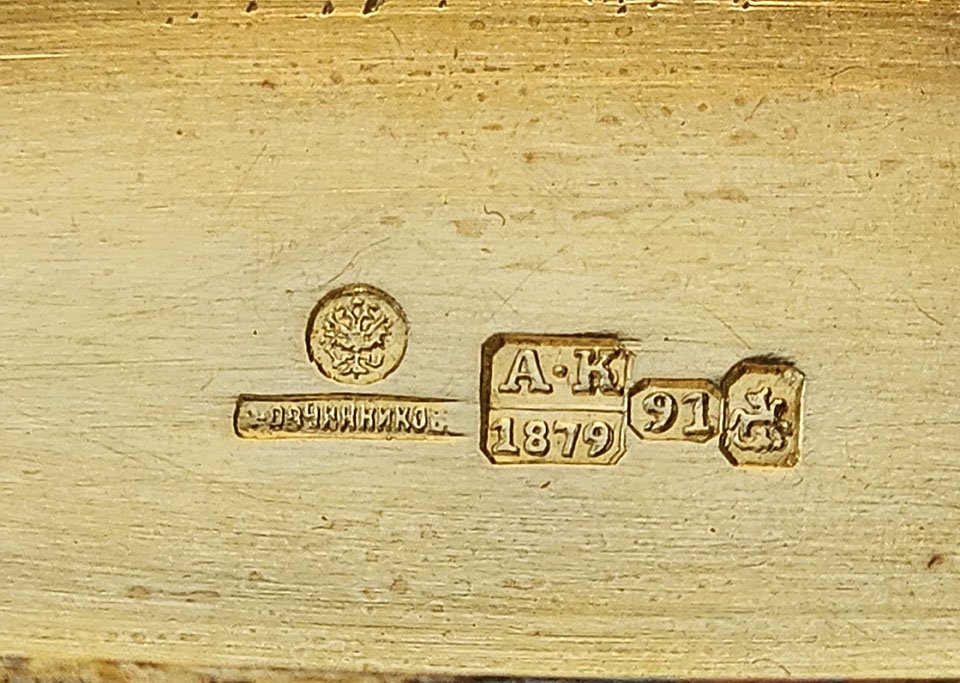 Hallmarked Moscow, 1879, 91 silver standards, with maker’s mark of Pavel Ovchinnikov, together with the Imperial Warrant, indicating the firm’s status as