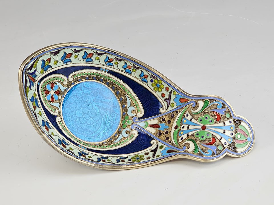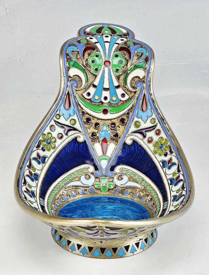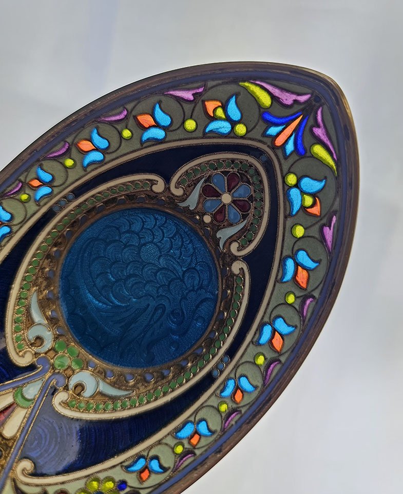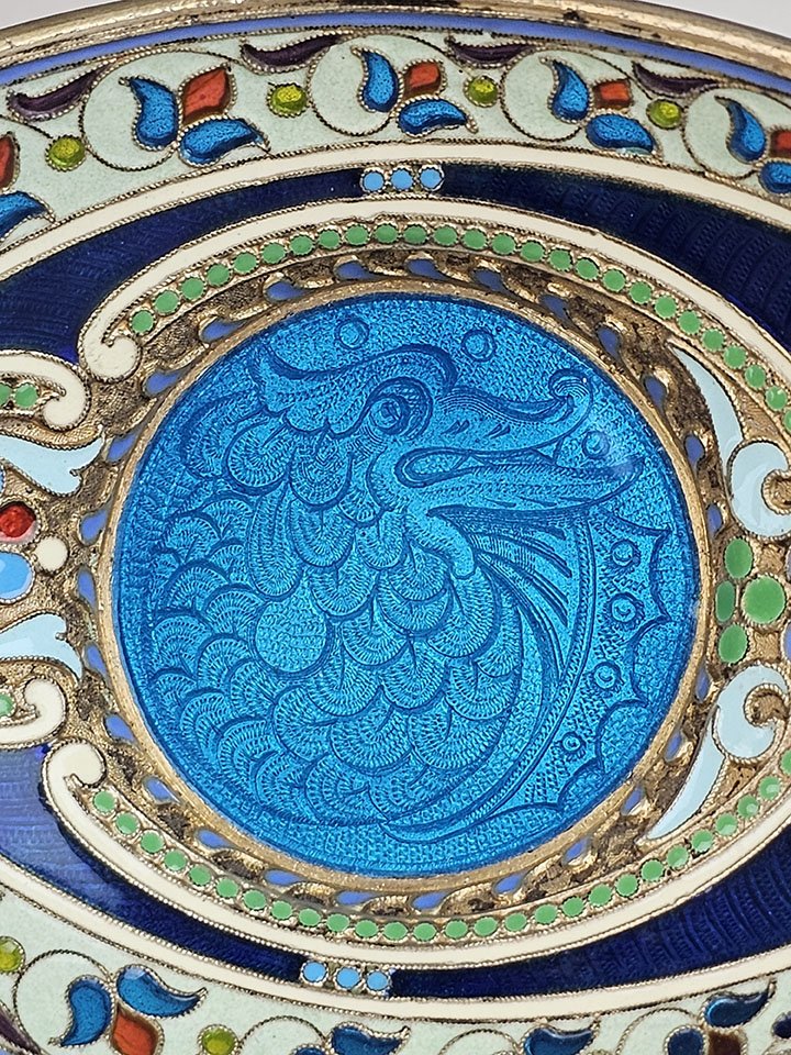 The vibrant palette and intricate foliate ornament showcase Khlebnikov’s mastery and the pinnacle of Russian enamel craftsmanship.