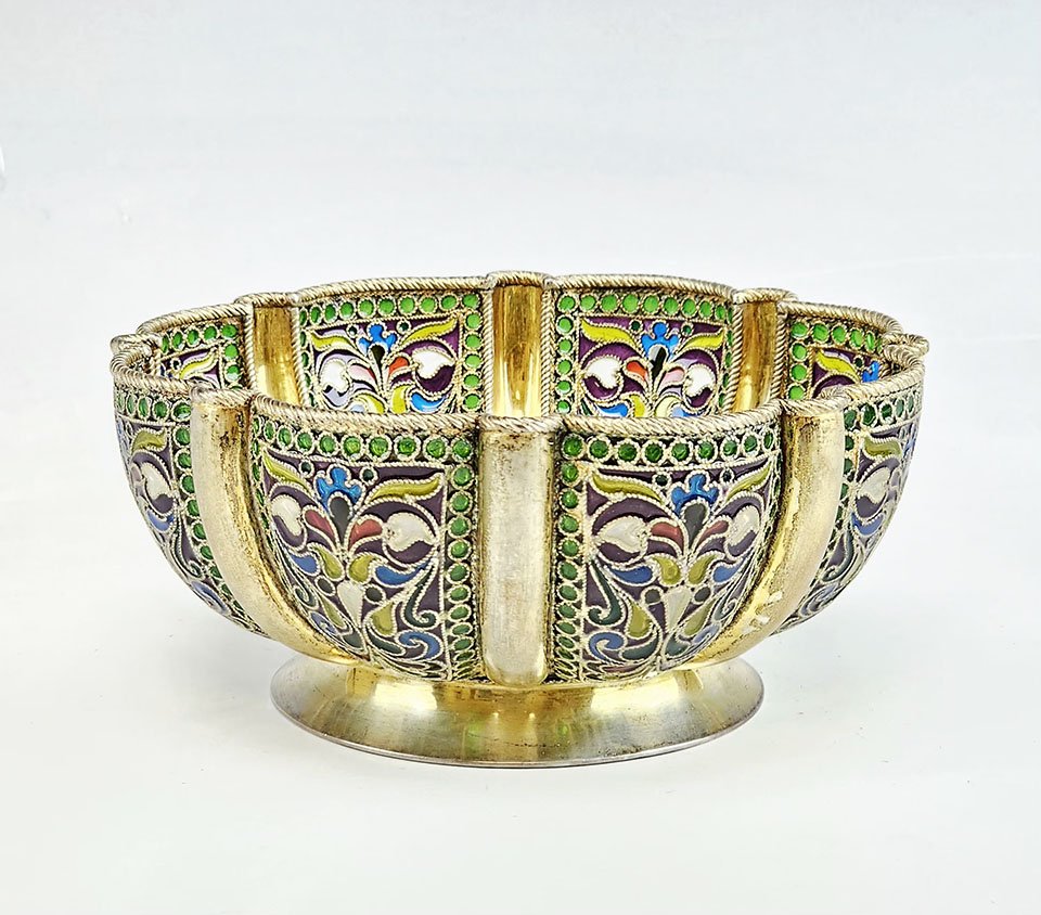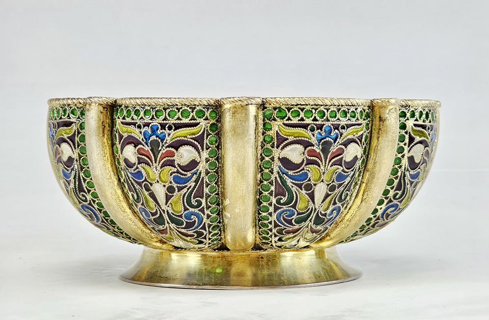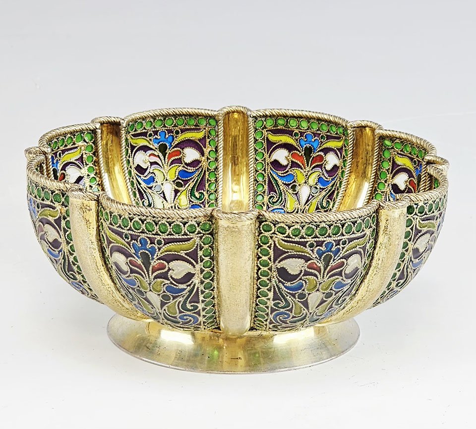 Superb Imperial Russian silver-gilt Bratina bowl by the renowned Moscow firm Khlebnikov, official supplier to the Imperial Court. The bowl is richly decorated with vibrant polychrome plique-à-jour enamel, one of the most complex and luxurious enameling techniques, creating luminous stained-glass–like panels of traditional Russian foliate ornament framed by delicate beadwork borders. The elegant, scalloped form with raised gilded ribs enhances the sculptural design, while the interior is fully gilded.