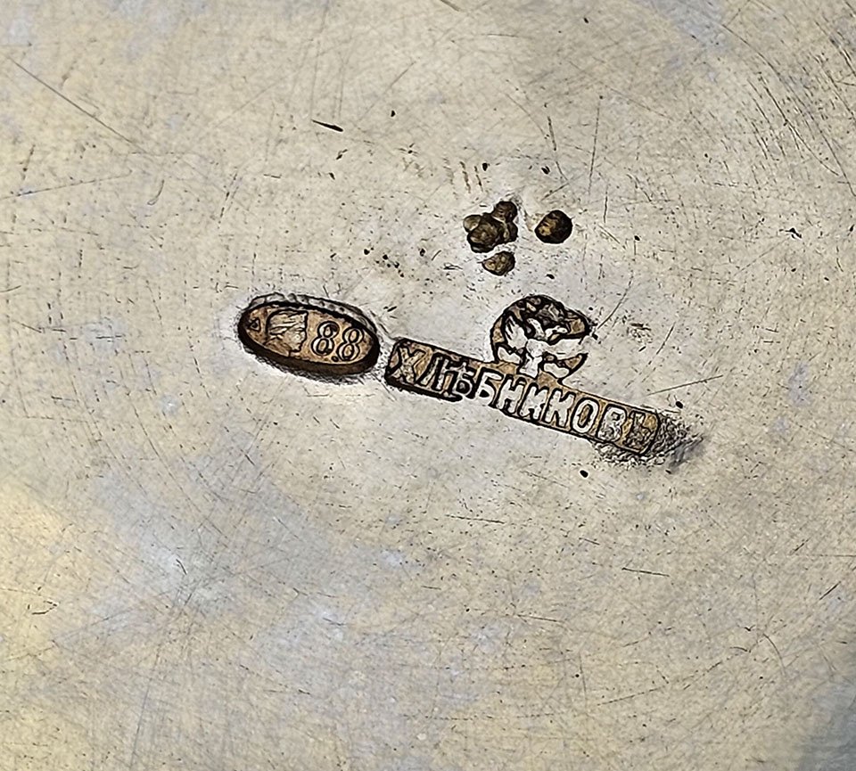 Marked Moscow city mark, 88 silver standards, together with the maker’s mark Khlebnikov and Imperial Warrant.