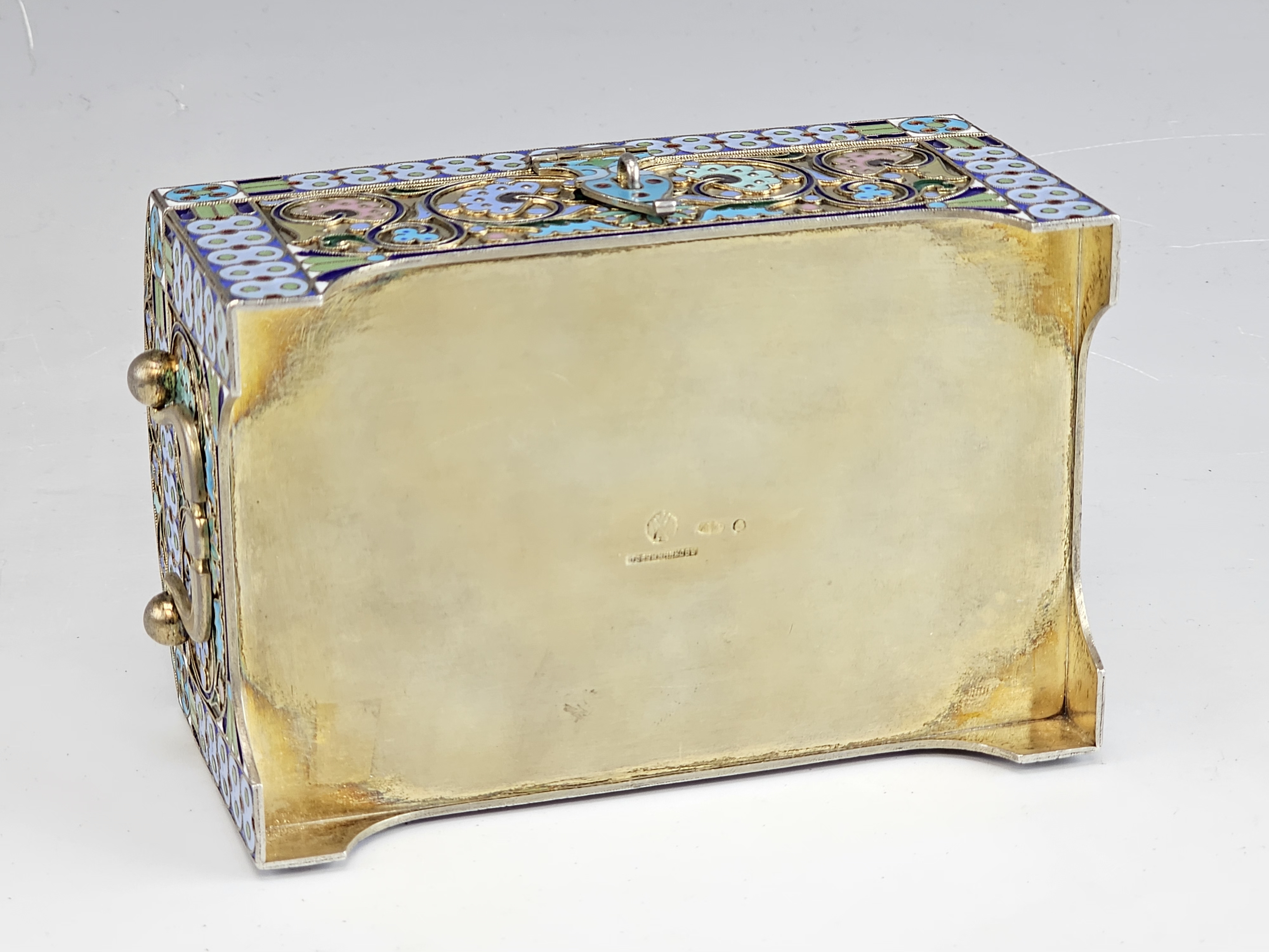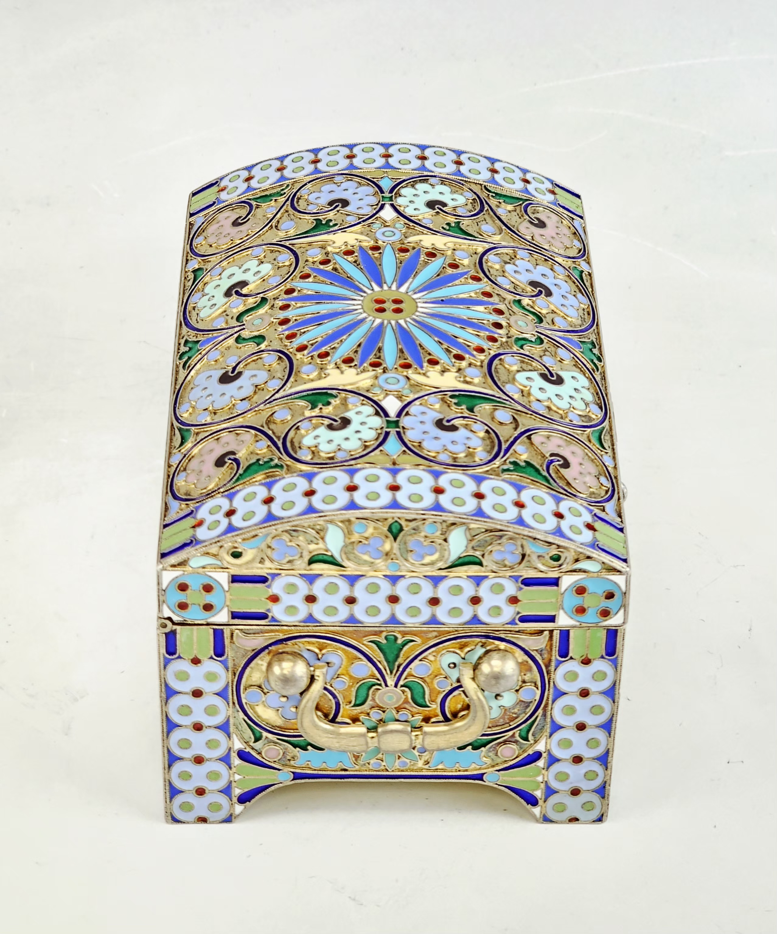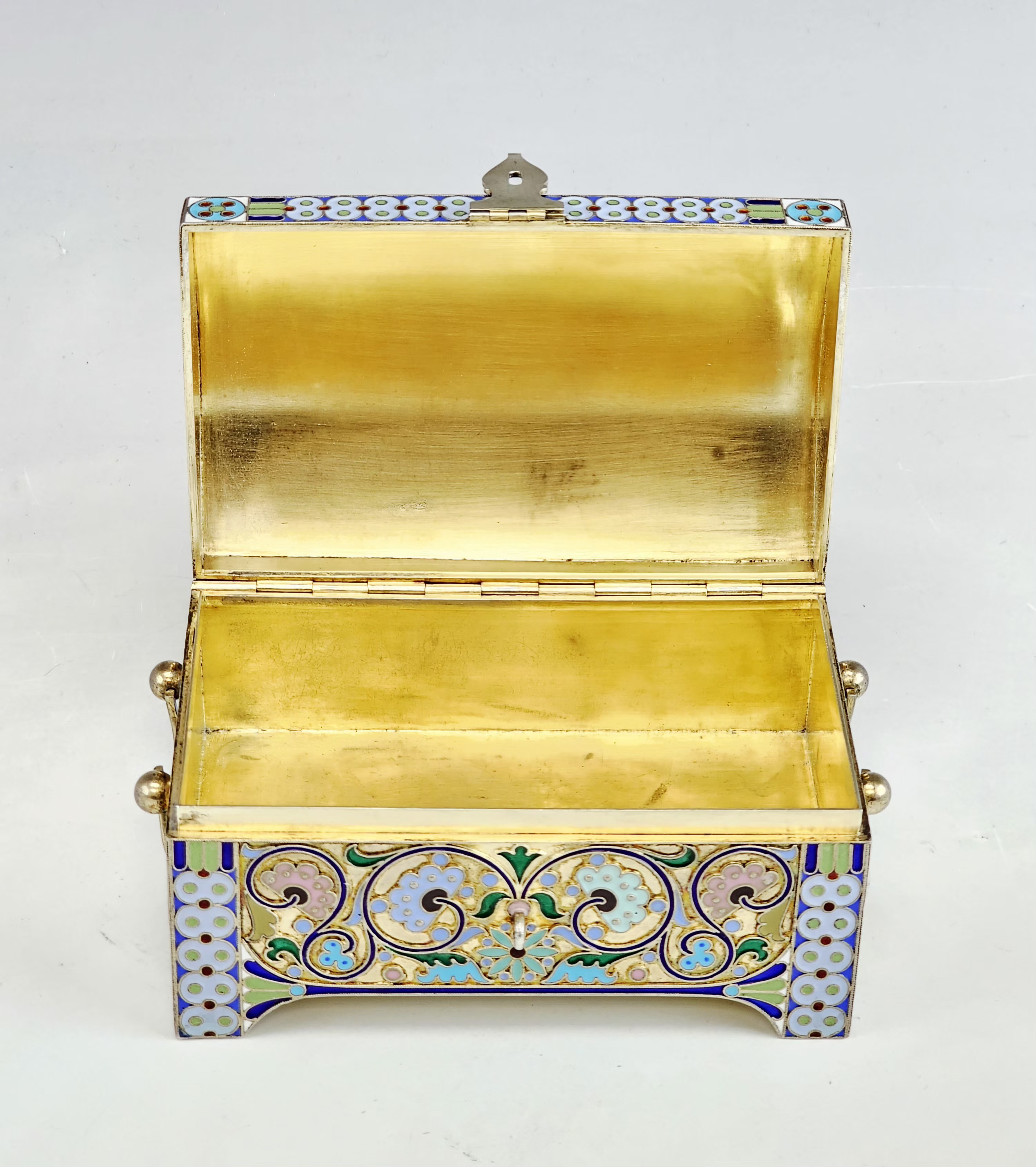 Fine Imperial Russian silver-gilt casket of rectangular form with domed lid, richly decorated throughout with vibrant cloisonné and shaded enamel in turquoise, cobalt blue, white, pink, and green with intricate scrolling floral ornament and geometric borders. The casket is fitted with a decorative clasp and side carrying handles and opens to a finely fire-gilded interior.