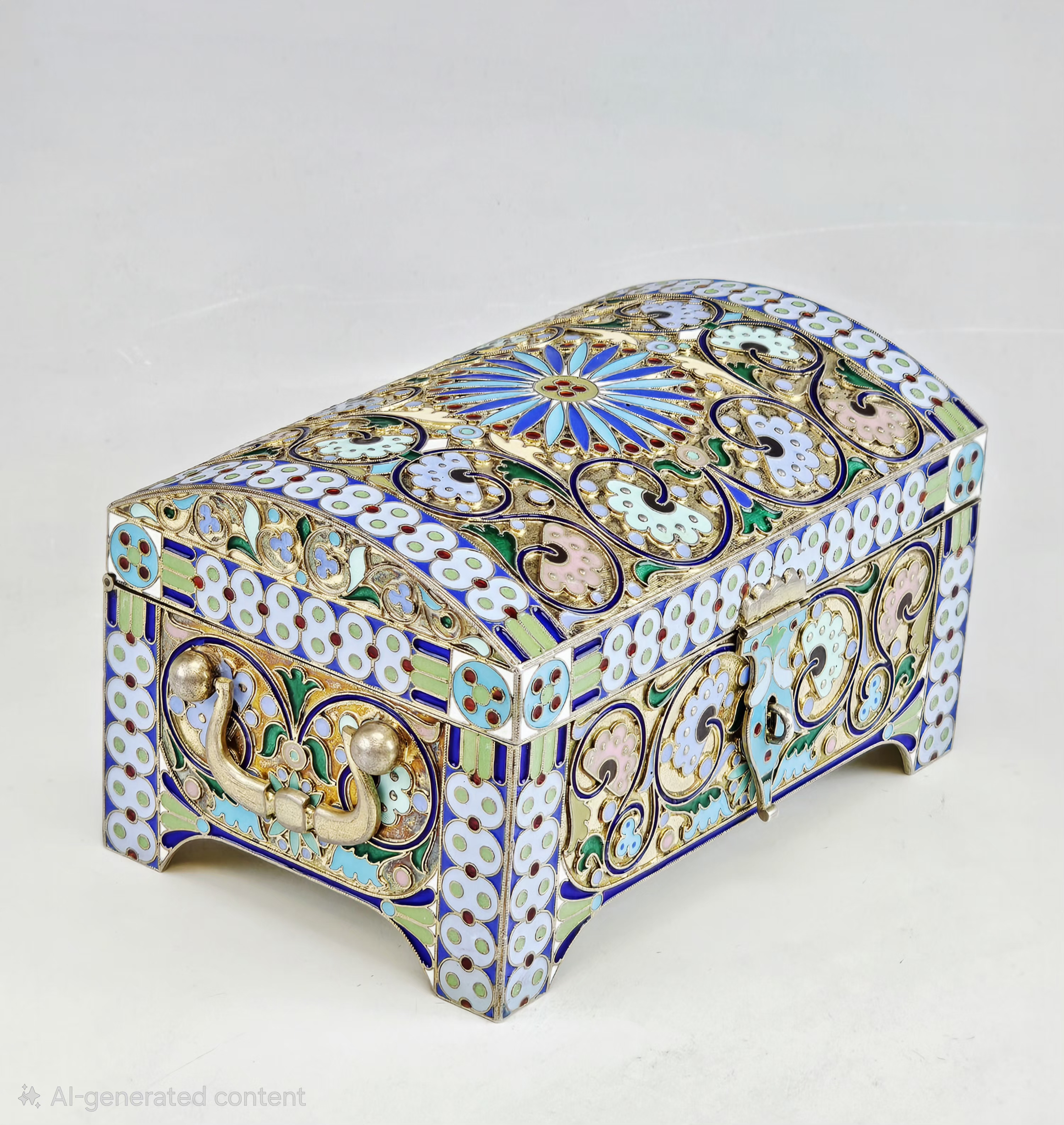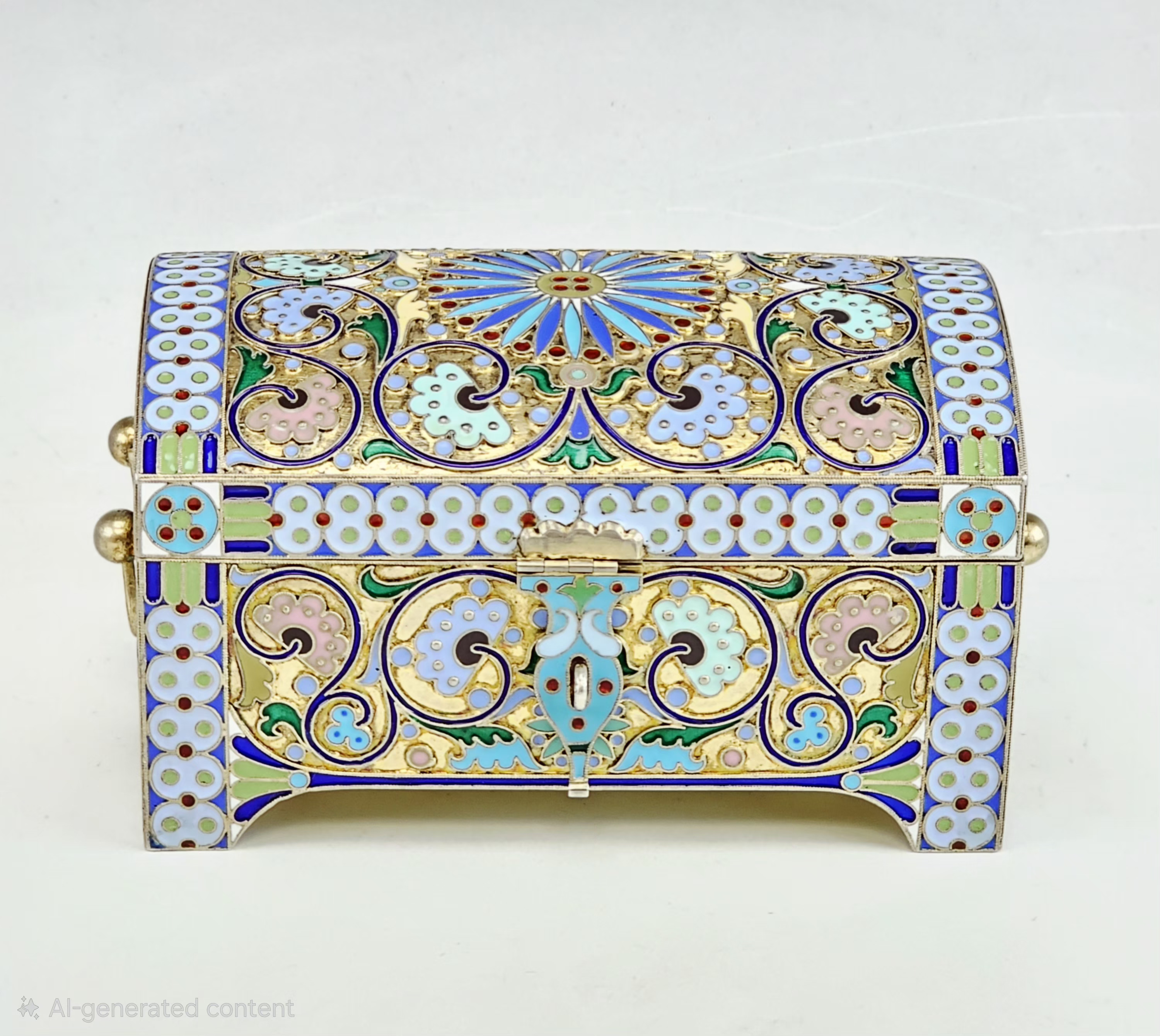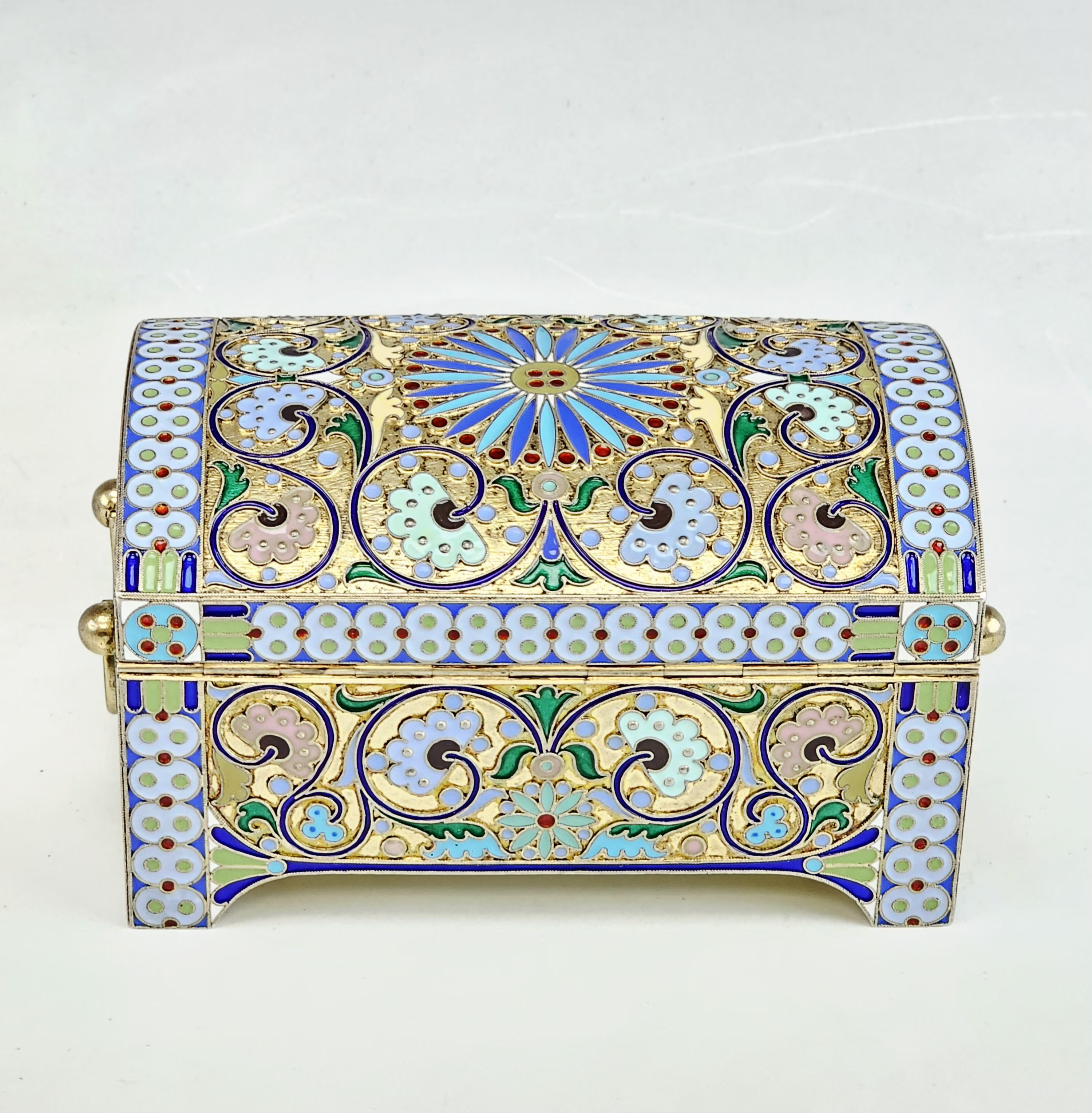 Fine Imperial Russian silver-gilt casket of rectangular form with domed lid, richly decorated throughout with vibrant cloisonné and shaded enamel in turquoise, cobalt blue, white, pink, and green with intricate scrolling floral ornament and geometric borders. The casket is fitted with a decorative clasp and side carrying handles and opens to a finely fire-gilded interior.